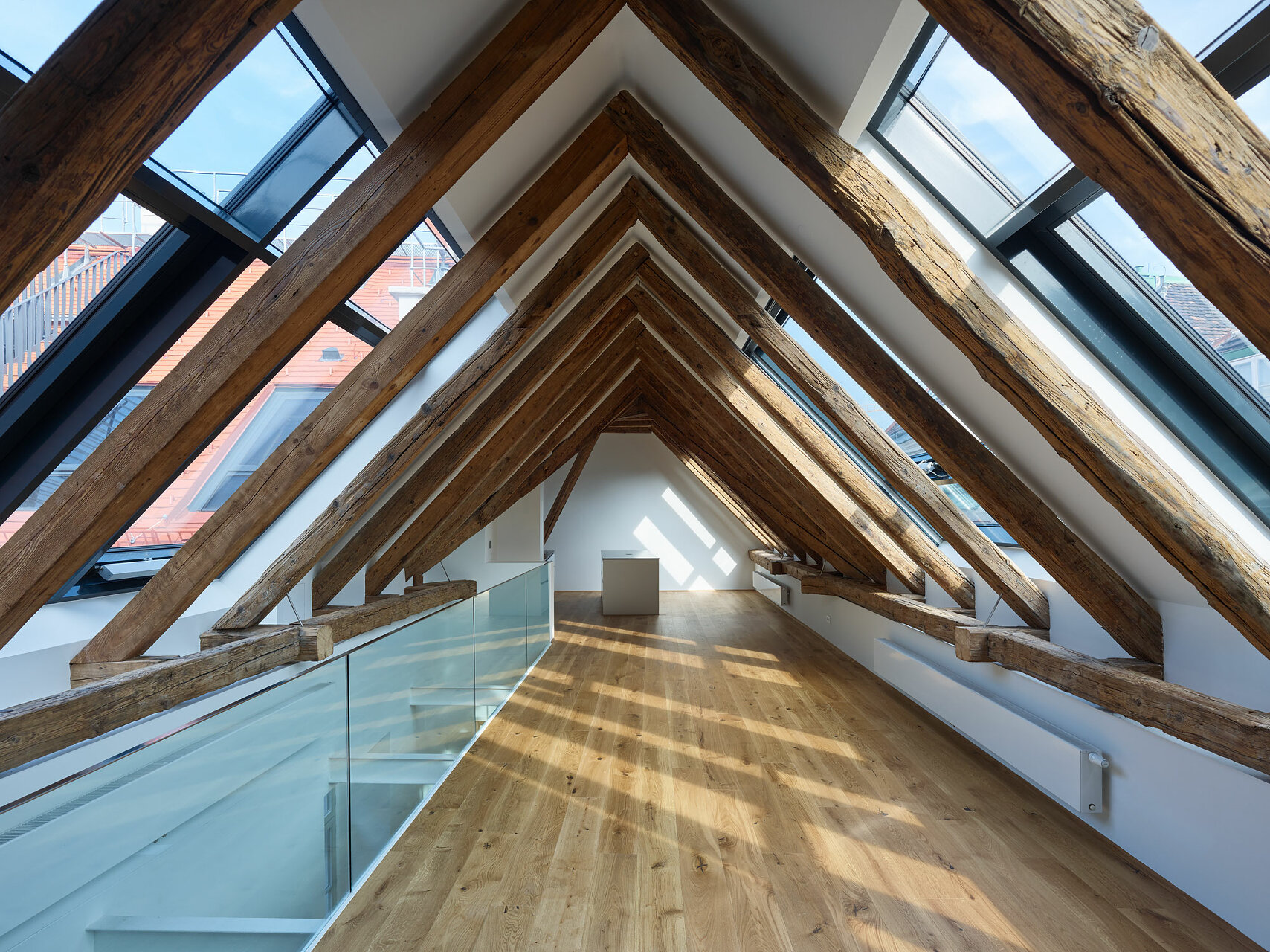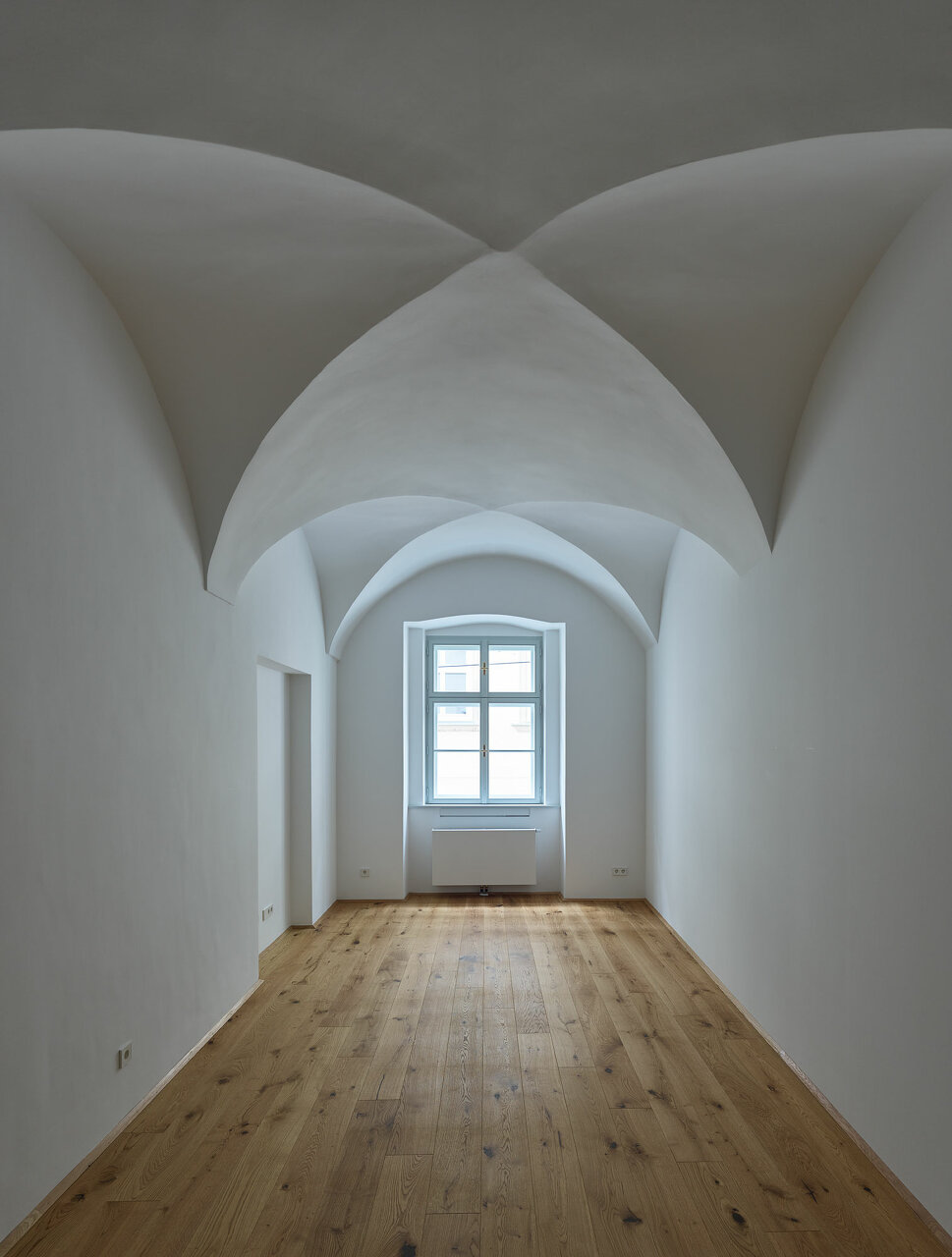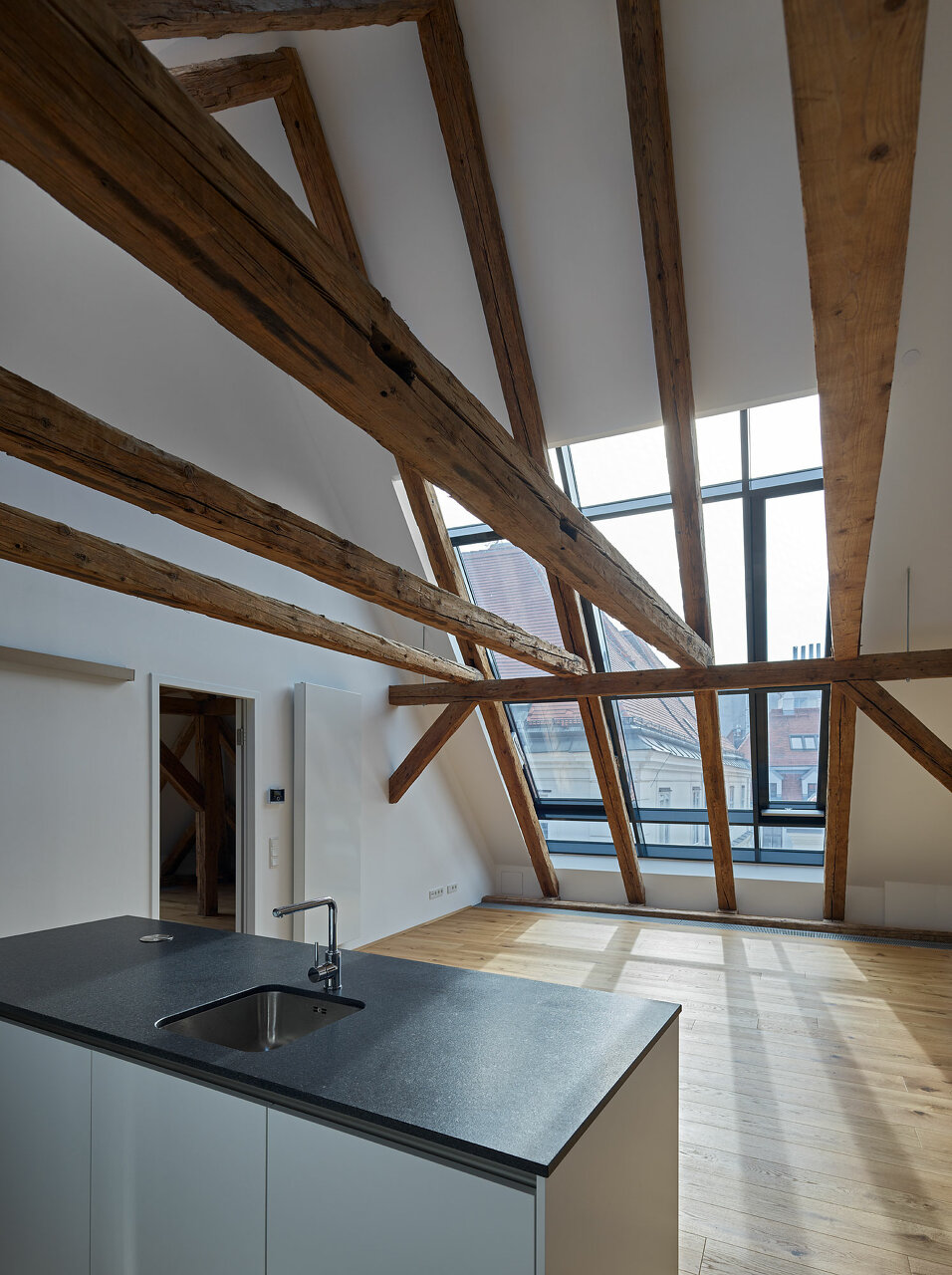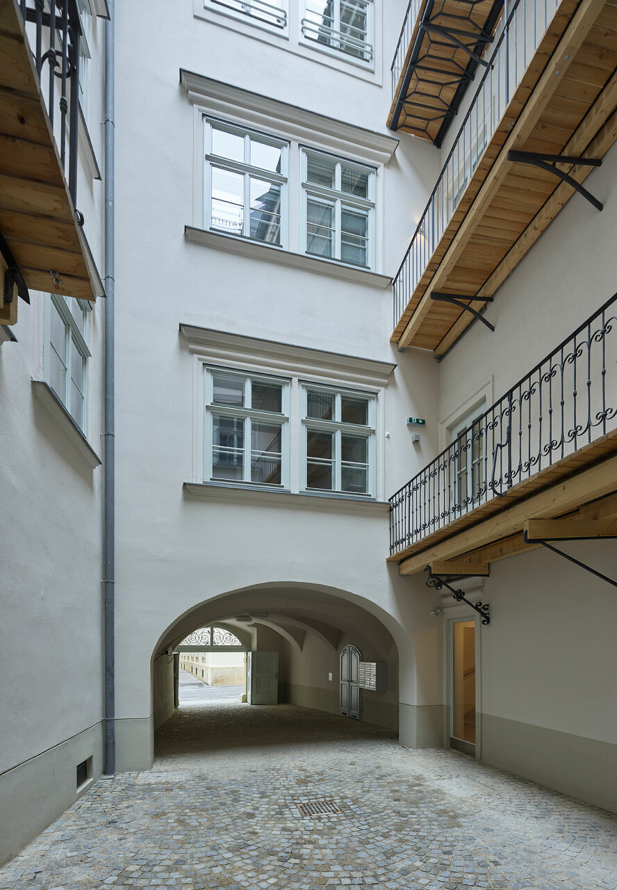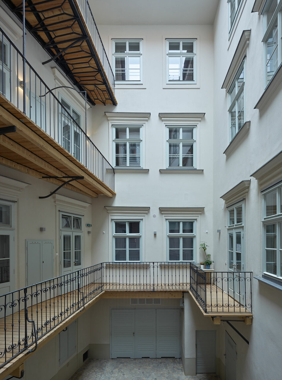 In zwei Wohnungen steht nun der alte Dachstuhl als historisches Möbel im Raum und verschneidet sich mit den neuen Trennwänden, in einer dritten wurden die Deckenbalken entfernt, um eine großzügige, helle Maisonettelösung zu schaffen. Die neuen großflächigen Dachfenster zur Straßenseite bekommen aus Denkmalschutzgründen keinen außenliegendem Sonnenschutz, sondern sind aus elektrochromen Glas. Die Wohnungen im 1. und 2.Obergeschoss wurden teilweise umgebaut und saniert. Die Befundung ergab eine hohe Komplexität durch die vielen historischen Schichten. Ebenfalls restauriert wurden die Pawlatschen im Hof. Hier blieb die historische Metallkonstruktion erhalten, die Bauteile aus Holz wurden erneuert. Die unterschiedliche Ausgestaltung der Metallkonstruktion, die sukzessive über die Jahrhunderte entstand, bleibt auch nach der Sanierung ablesbar. Viele historische Schichten offenbaren sich auch im Keller, der über die Jahrhunderte immer wieder umgebaut wurde. Ein großer, hallenartiger Raum wurde wieder freigelegt und wartet auf zukünftige Nutzungen. (Text: Architekt:innen, bearbeitet)