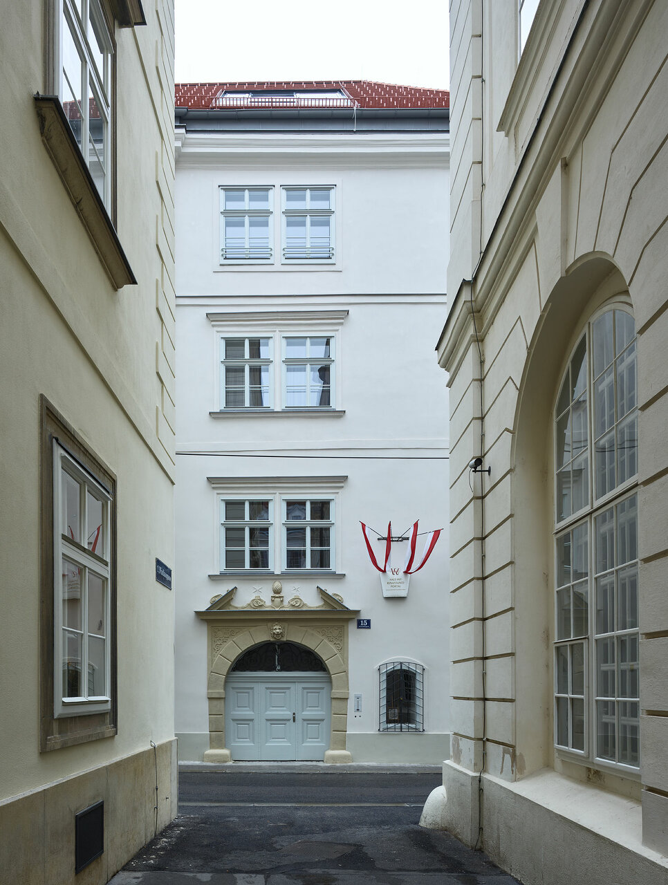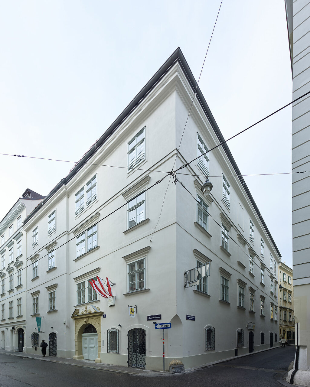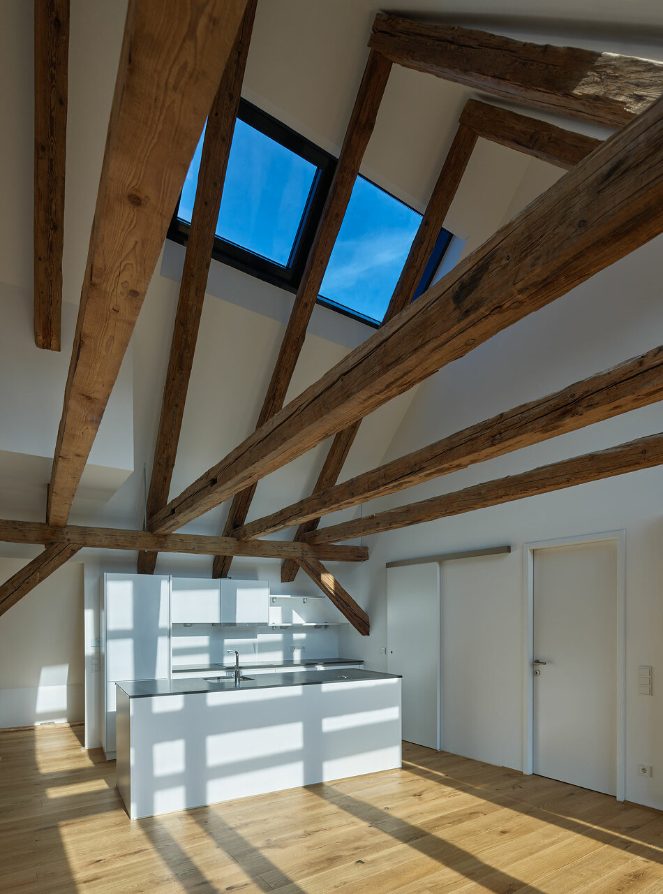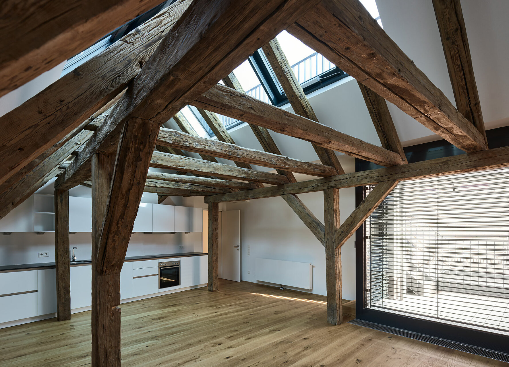 In zwei Wohnungen steht nun der alte Dachstuhl als historisches Möbel im Raum und verschneidet sich mit den neuen Trennwänden, in einer dritten wurden die Deckenbalken entfernt, um eine großzügige, helle Maisonettelösung zu schaffen. Die neuen großflächigen Dachfenster zur Straßenseite bekommen aus Denkmalschutzgründen keinen außenliegendem Sonnenschutz, sondern sind aus elektrochromen Glas. Die Wohnungen im 1. und 2.Obergeschoss wurden teilweise umgebaut und saniert. Die Befundung ergab eine hohe Komplexität durch die vielen historischen Schichten. Ebenfalls restauriert wurden die Pawlatschen im Hof. Hier blieb die historische Metallkonstruktion erhalten, die Bauteile aus Holz wurden erneuert. Die unterschiedliche Ausgestaltung der Metallkonstruktion, die sukzessive über die Jahrhunderte entstand, bleibt auch nach der Sanierung ablesbar. Viele historische Schichten offenbaren sich auch im Keller, der über die Jahrhunderte immer wieder umgebaut wurde. Ein großer, hallenartiger Raum wurde wieder freigelegt und wartet auf zukünftige Nutzungen. (Text: Architekt:innen, bearbeitet)