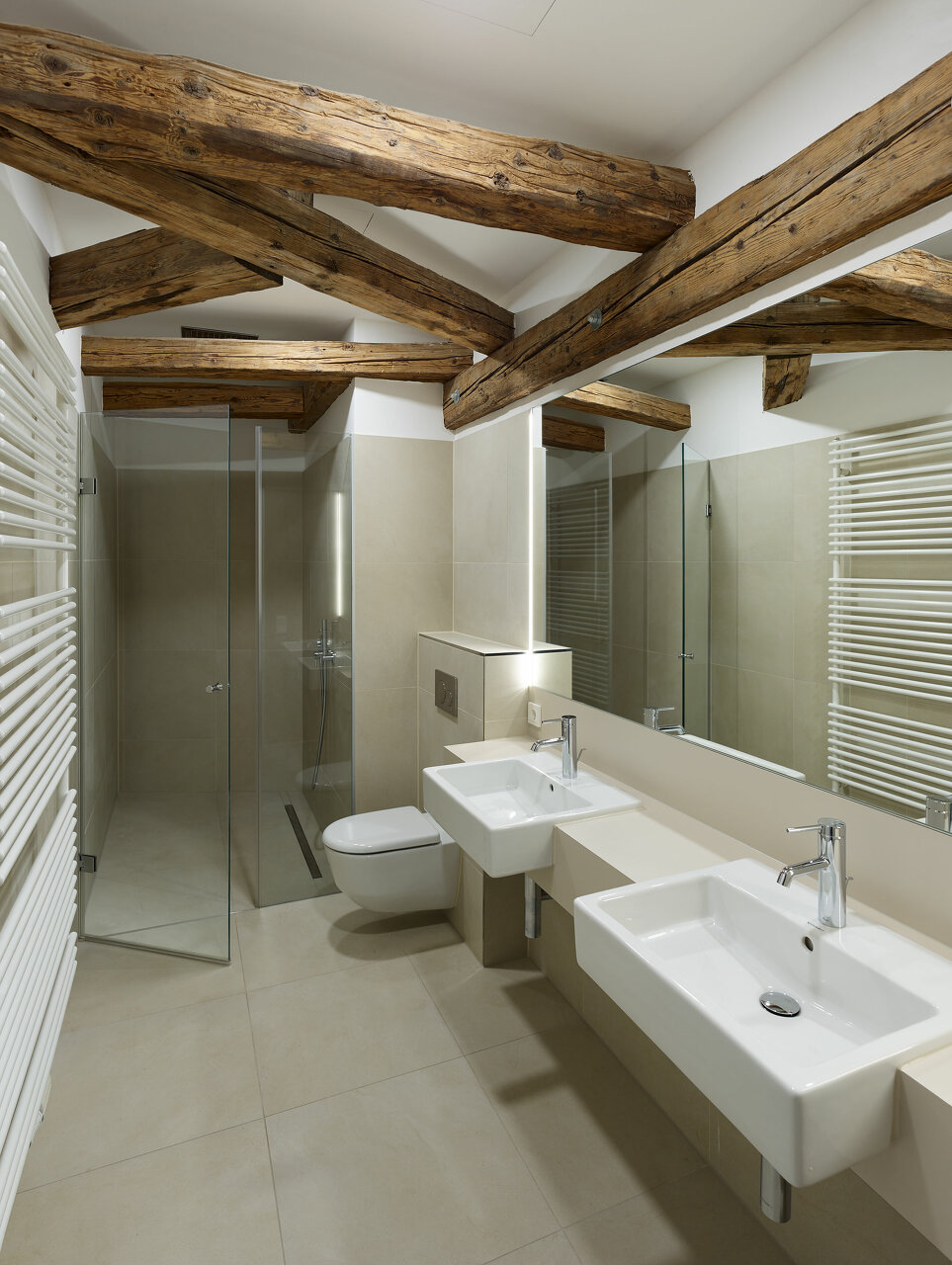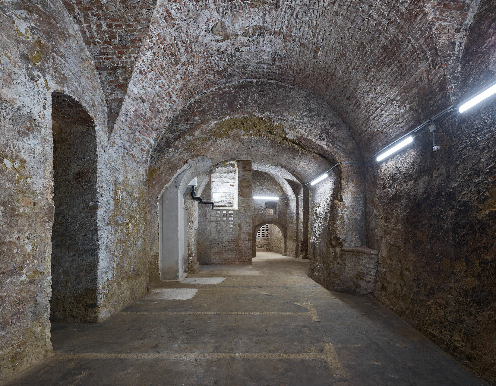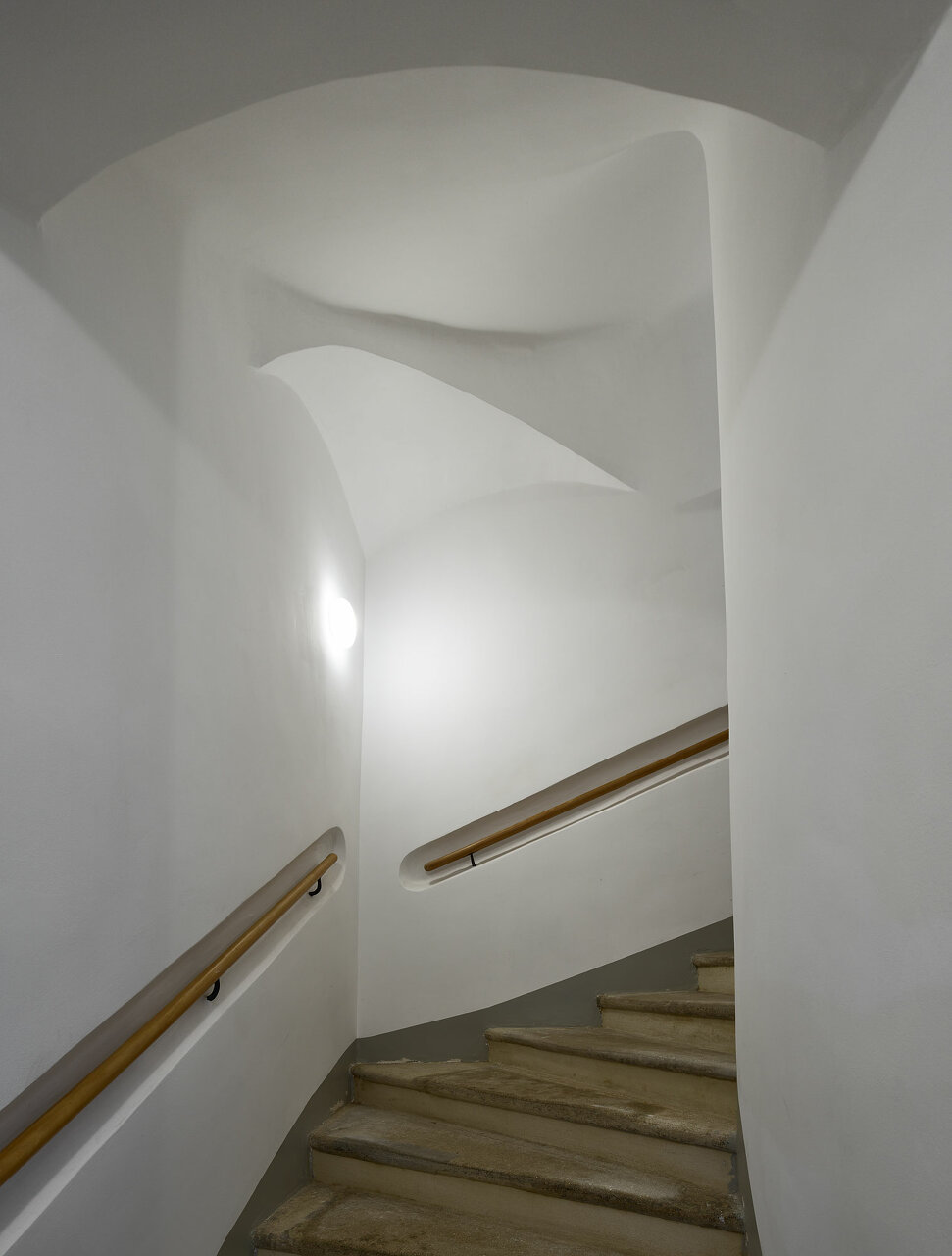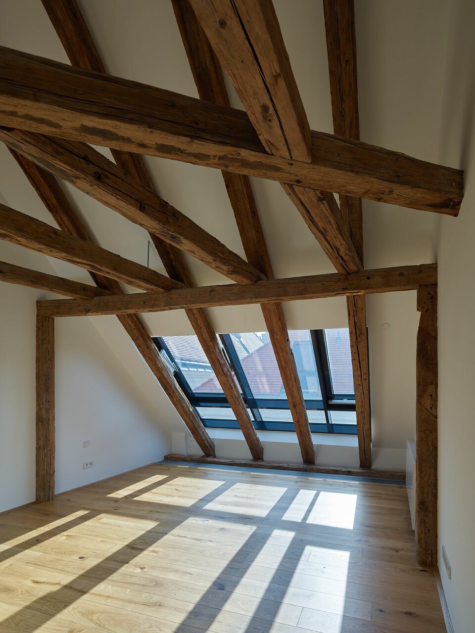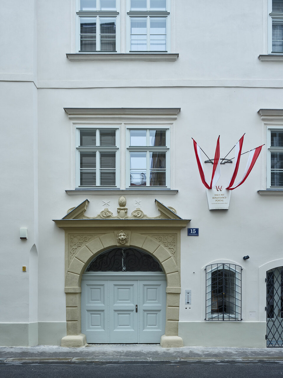 In zwei Wohnungen steht nun der alte Dachstuhl als historisches Möbel im Raum und verschneidet sich mit den neuen Trennwänden, in einer dritten wurden die Deckenbalken entfernt, um eine großzügige, helle Maisonettelösung zu schaffen. Die neuen großflächigen Dachfenster zur Straßenseite bekommen aus Denkmalschutzgründen keinen außenliegendem Sonnenschutz, sondern sind aus elektrochromen Glas. Die Wohnungen im 1. und 2.Obergeschoss wurden teilweise umgebaut und saniert. Die Befundung ergab eine hohe Komplexität durch die vielen historischen Schichten. Ebenfalls restauriert wurden die Pawlatschen im Hof. Hier blieb die historische Metallkonstruktion erhalten, die Bauteile aus Holz wurden erneuert. Die unterschiedliche Ausgestaltung der Metallkonstruktion, die sukzessive über die Jahrhunderte entstand, bleibt auch nach der Sanierung ablesbar. Viele historische Schichten offenbaren sich auch im Keller, der über die Jahrhunderte immer wieder umgebaut wurde. Ein großer, hallenartiger Raum wurde wieder freigelegt und wartet auf zukünftige Nutzungen. (Text: Architekt:innen, bearbeitet)