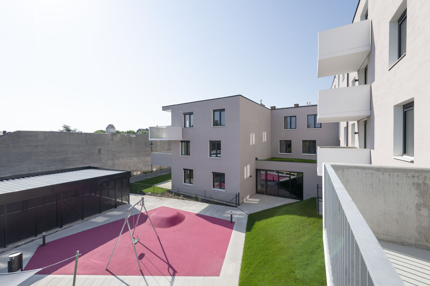 Der Gemeinschaftsraum im Erdgeschoss ist zur großen Freifläche der Wohnanlage orientiert und bietet sich für gemeinschaftliche Gartenfeste an. Der Hausgarten wird mit Gemeinschaftsbeeten, Kinderspielplatz sowie mit Liegeflächen und Sonnendecks vielfältig ausgestattet und steht in Bezug zum nördlich der Quellenstraße gewidmeten Park und zum geplanten Fuß- und Radweg. (Text: Architekt:innen)