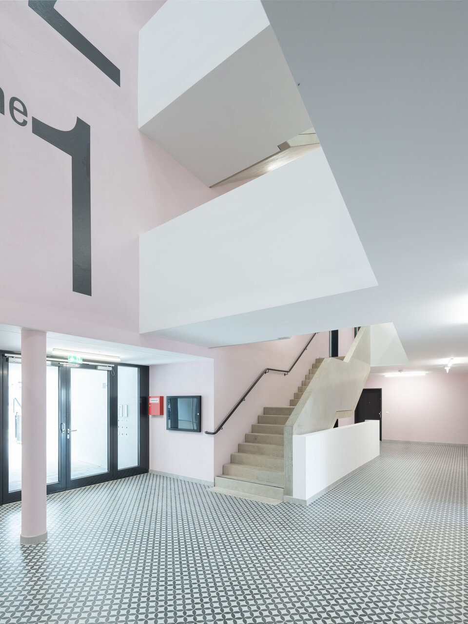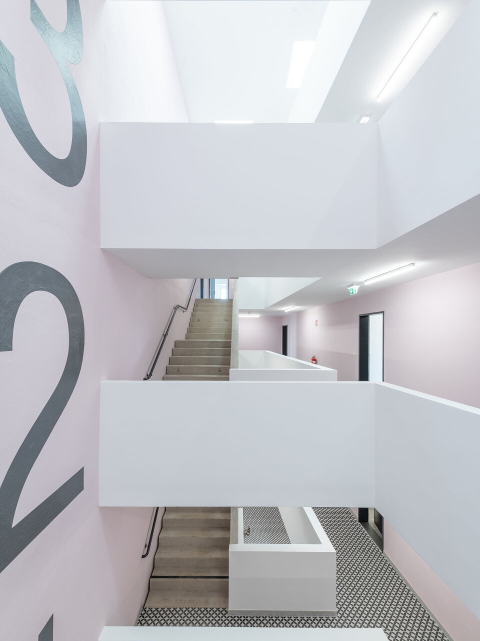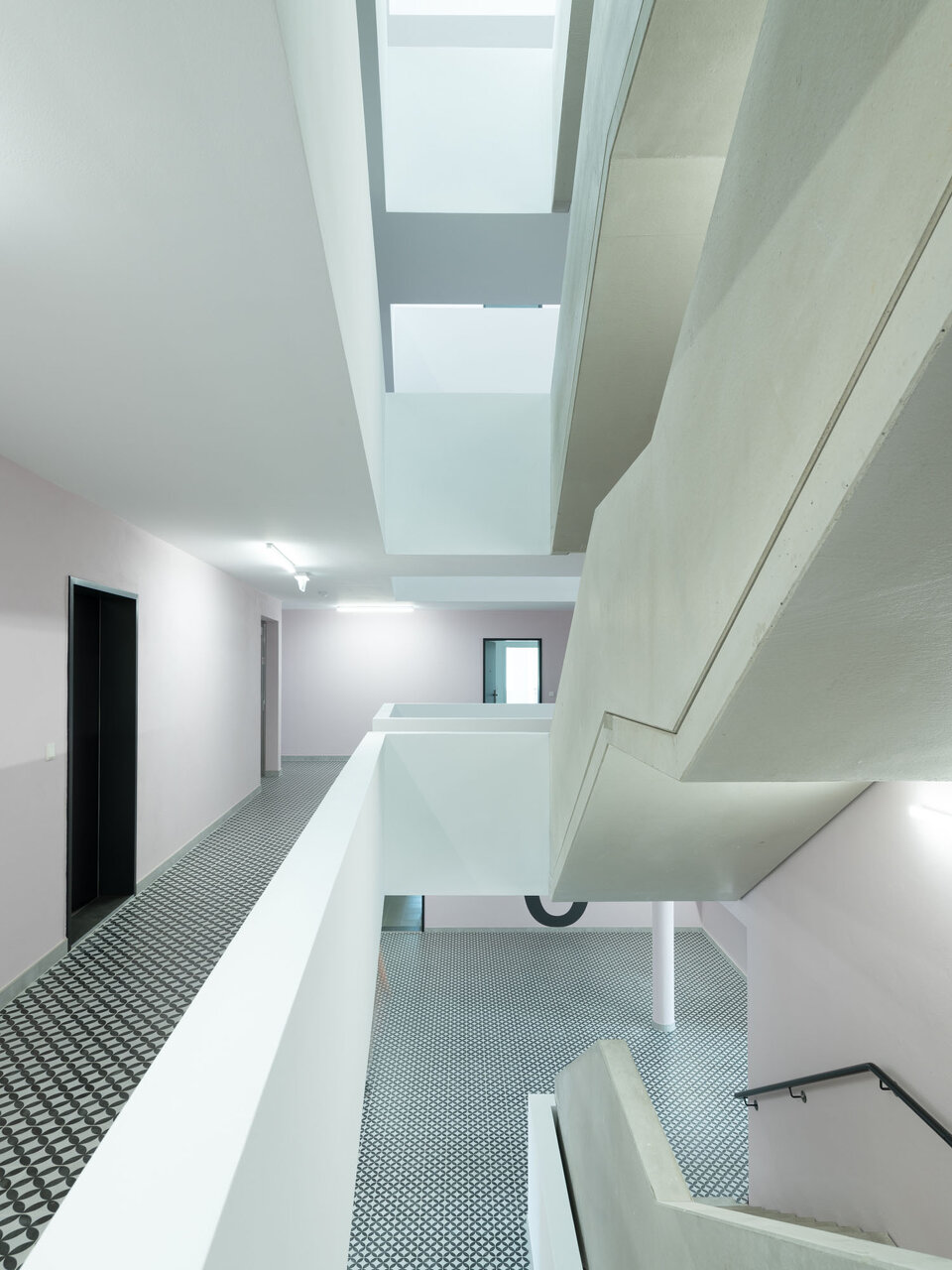 Die Wohnungen werden über ein helles und großzügig dimensioniertes Atrium erschlossen. Ein Gebäudeeinschnitt im Nordosten zum Hausgarten ermöglicht die natürliche Belichtung der Gang- und Erschließungsbereiche. Zugleich werden dadurch nach Norden orientierte Wohnungen vermieden. Alle Wohnungen verfügen über großzügige zugeordnete private Freiflächen in Form von Loggien und/oder Balkonen. Durch die geschossweise versetzte Anordnung der Balkone verfügen diese jeweils über geschützte eingeschossige Bereiche sowie offene, 2-geschossige Zonen.