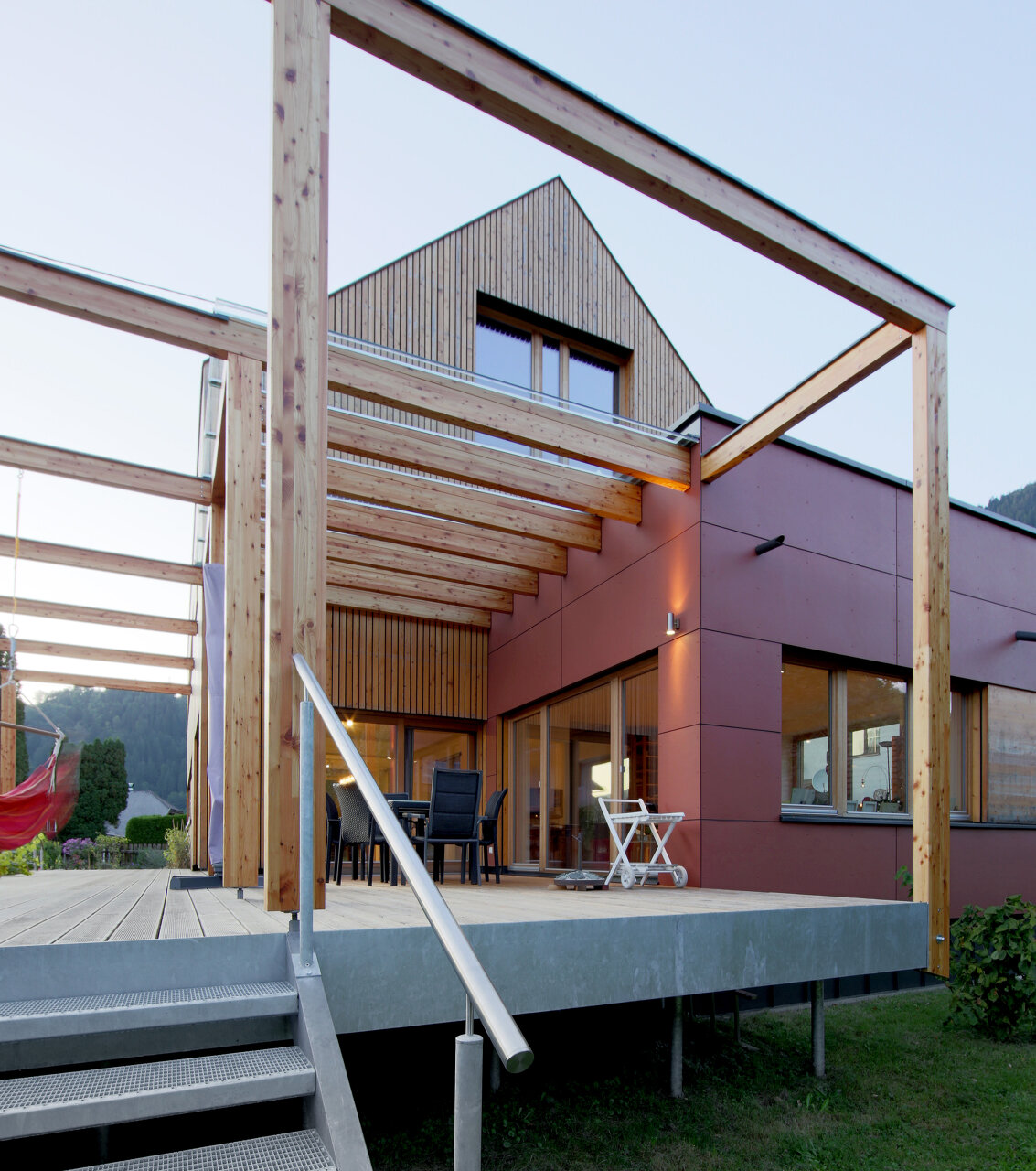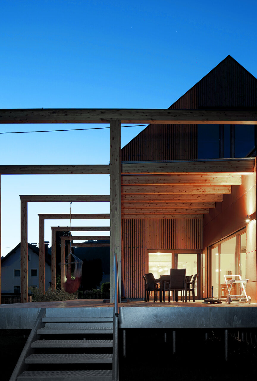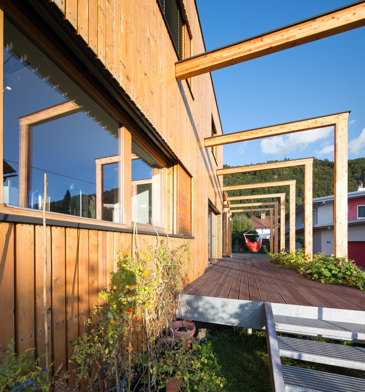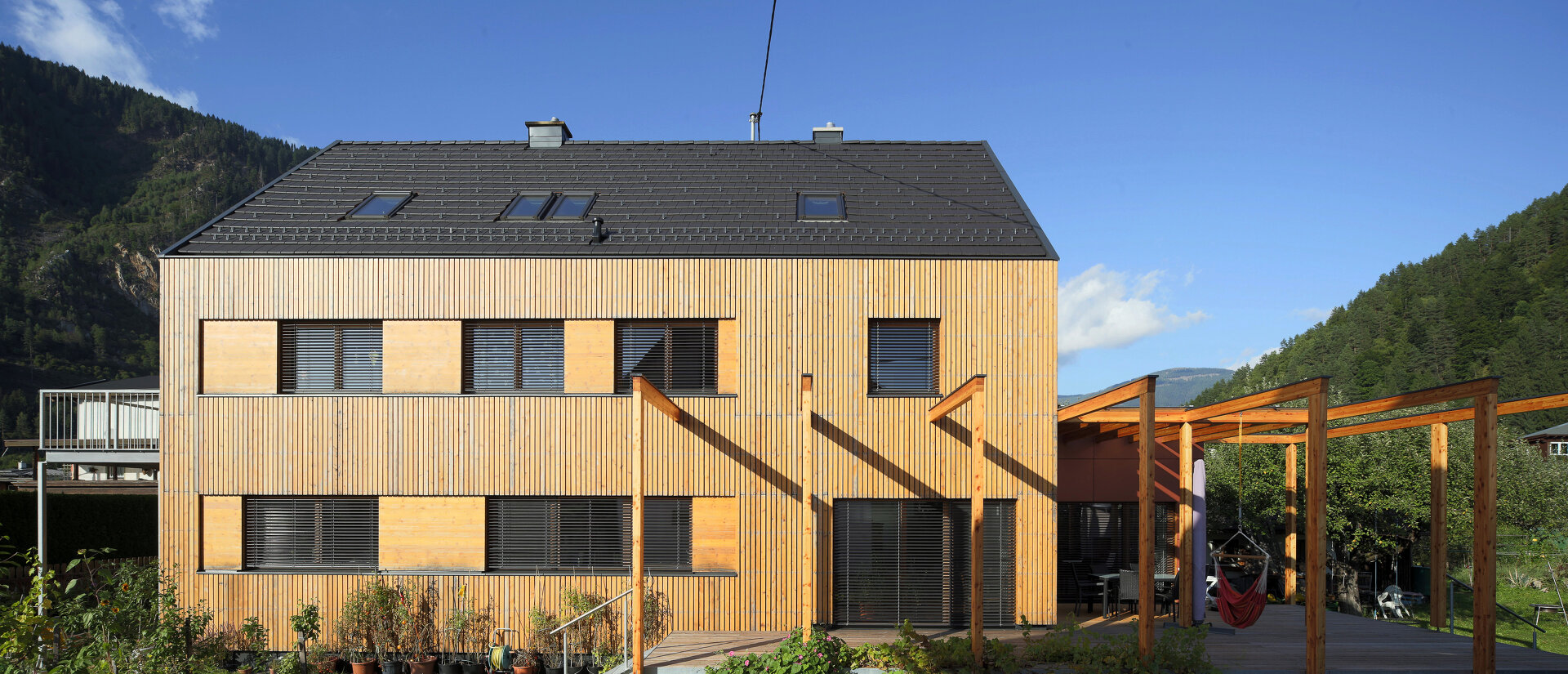 Das bestehende Wohnhaus aus den 1960er Jahren wurde von der Fam. Heilmeier mit Grundstück und Garten gekauft. Der Wunsch der Familie war ein entsprechender Umbau mit Sanierung im Innenbereich (offener Wohnraum mit Terrasse im EG bzw. Schlafräume im OG) und im Außenbereich (Fassaden und Dachsanierung) zu konzipieren. Der bestehende Baukörper wurde im Zuge der Sanierung klar und kompakt strukturiert, die vorhandene Terrasse mit einem Holzvorbau (Pergola) erweitert, was eine großzügige Nutzung zur Folge hatte. Durch die konsequente Haltung, gewinnen die beiden Baukörper bewusst im Gegensatz zum Umfeld Eigenständigkeit, können sich aber trotzdem durch die Materialwahl sehr gut ins Umfeld integrieren. Vorrausschauend gibt es auf der Nordseite einen separaten Stiegenaufgang für eine Mietwohnung im Dachgeschoss, die in späterer Folge ebenfalls ausgebaut wird.Die Fassaden- bzw. Dachsanierung erfolgte auf Niedrighausstandart. Fassadenmaterial besteht aus einer offenen, geölten Lärchenschalung. Fenster und Fenstertüren wurden in Lärche und 3-fachverglasung ausgeführt. Im Zuge der Sanierung wurde eine kontrollierte Wohnraumlüftung eingebaut bzw. dient als Zusatzheizung der bestehende Kachelofen im offenen Wohnbereich und eine Bodenheizung. (Text: Architekt, bearbeitet)