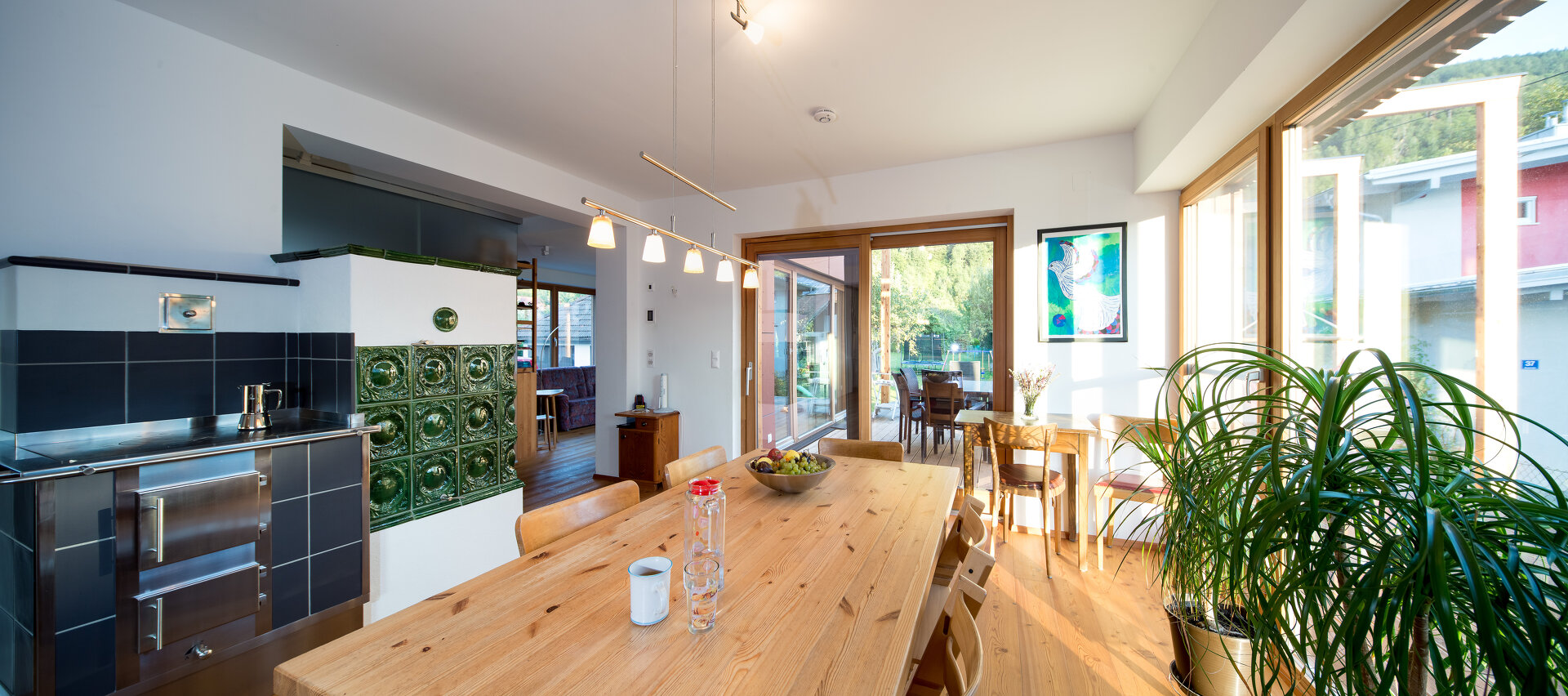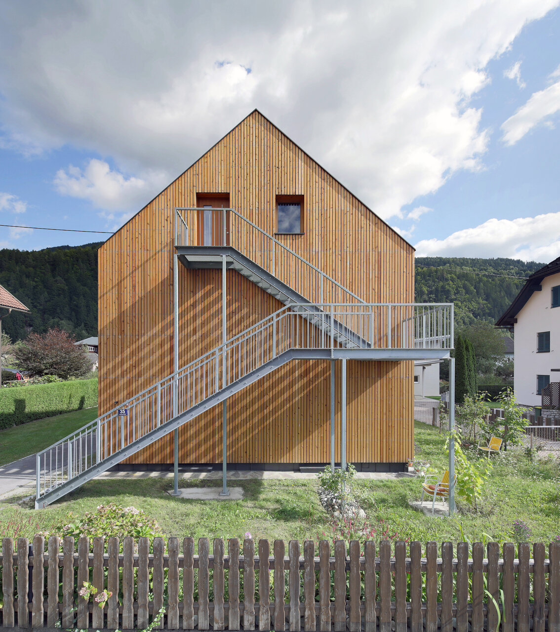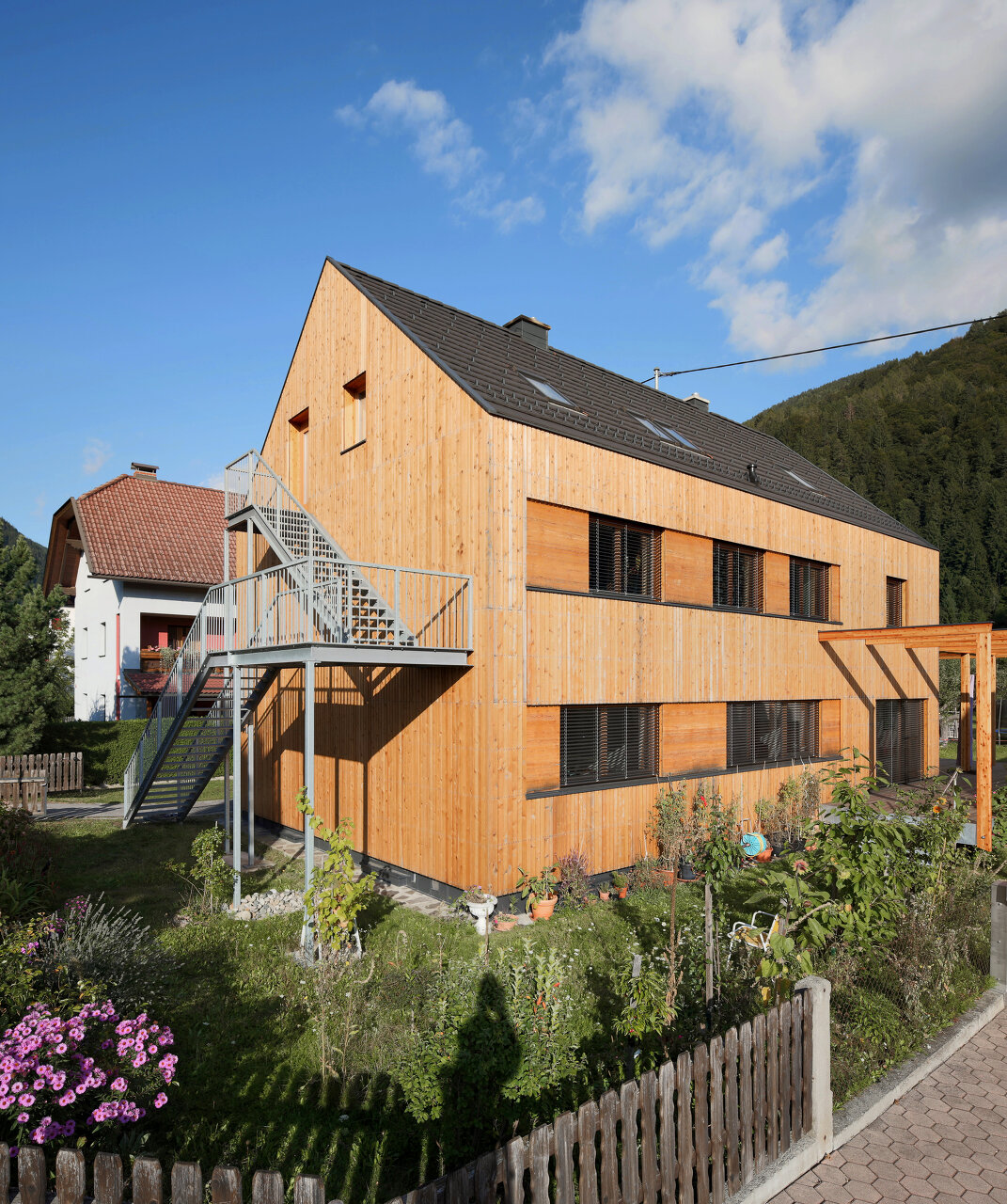 Das bestehende Wohnhaus aus den 1960er Jahren wurde von der Fam. Heilmeier mit Grundstück und Garten gekauft. Der Wunsch der Familie war ein entsprechender Umbau mit Sanierung im Innenbereich (offener Wohnraum mit Terrasse im EG bzw. Schlafräume im OG) und im Außenbereich (Fassaden und Dachsanierung) zu konzipieren. Der bestehende Baukörper wurde im Zuge der Sanierung klar und kompakt strukturiert, die vorhandene Terrasse mit einem Holzvorbau (Pergola) erweitert, was eine großzügige Nutzung zur Folge hatte. Durch die konsequente Haltung, gewinnen die beiden Baukörper bewusst im Gegensatz zum Umfeld Eigenständigkeit, können sich aber trotzdem durch die Materialwahl sehr gut ins Umfeld integrieren. Vorrausschauend gibt es auf der Nordseite einen separaten Stiegenaufgang für eine Mietwohnung im Dachgeschoss, die in späterer Folge ebenfalls ausgebaut wird.Die Fassaden- bzw. Dachsanierung erfolgte auf Niedrighausstandart. Fassadenmaterial besteht aus einer offenen, geölten Lärchenschalung. Fenster und Fenstertüren wurden in Lärche und 3-fachverglasung ausgeführt. Im Zuge der Sanierung wurde eine kontrollierte Wohnraumlüftung eingebaut bzw. dient als Zusatzheizung der bestehende Kachelofen im offenen Wohnbereich und eine Bodenheizung. (Text: Architekt, bearbeitet)