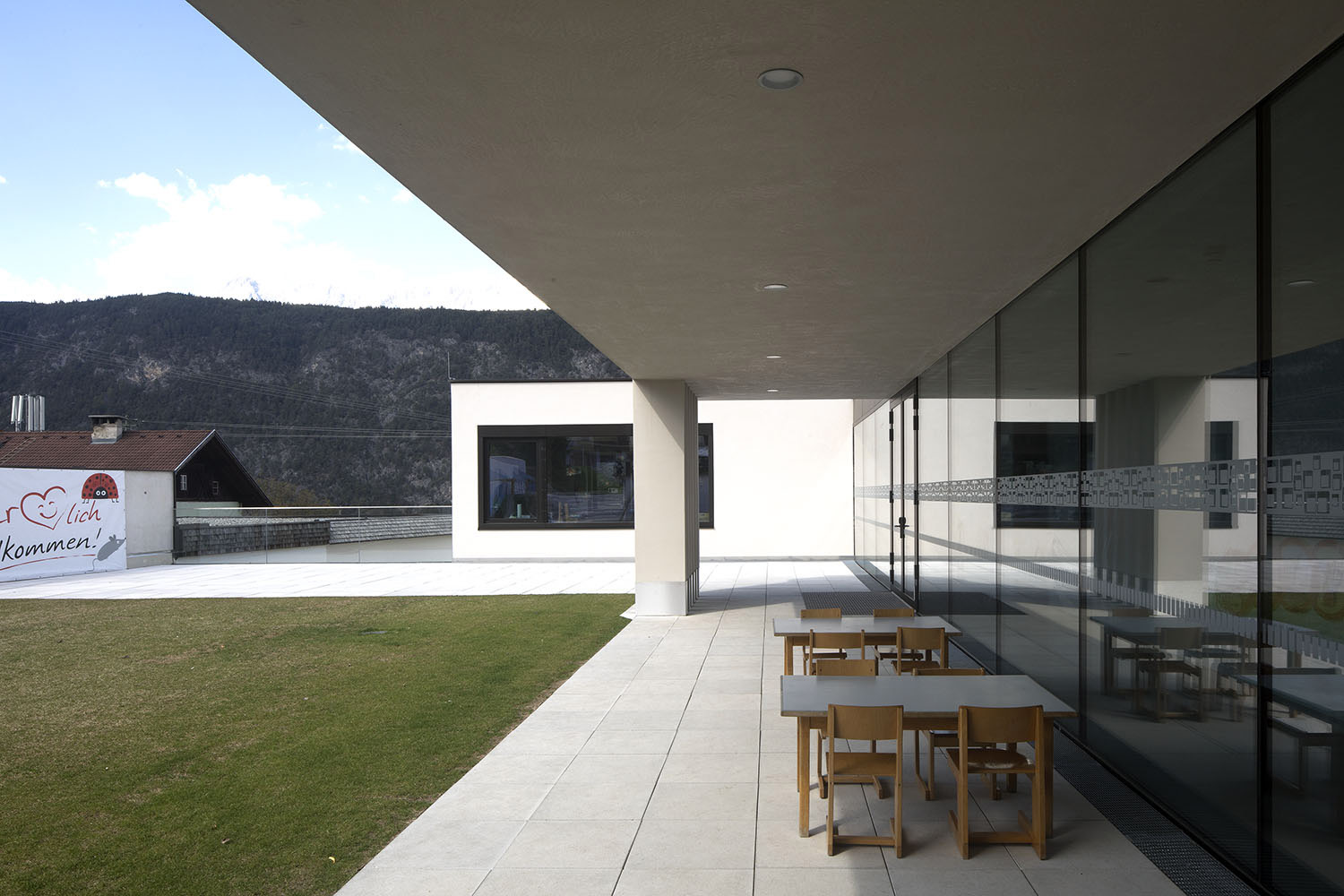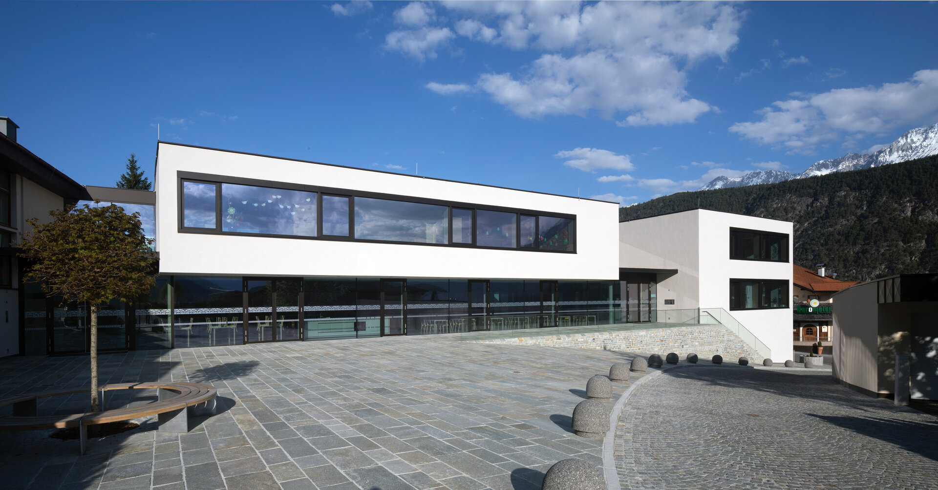 Das in seinen Dimensionen auf den kleinteiligen dörflichen Kontext Rücksicht nehmende Gebäudeensemble wurde so platziert, dass auf der relativ kleinen Fläche möglichst große Außenräume entstehen konnten. Zum einen erhielten die Volksschule und der Kindergarten einen neu gestalteten Vorplatz, der durch das transparente Erdgeschoß optisch vergrößert wird. Zum anderen gibt es auf der Hinterseite des Gebäudes einen gemeinsamen Außenbereich mit Spielplatz, der den Kindern der drei Einrichtungen einen gut überschaubaren und geschützten Freibereich bietet. (Text: Claudia Wedekind)