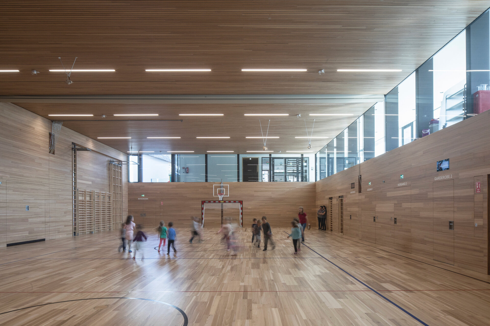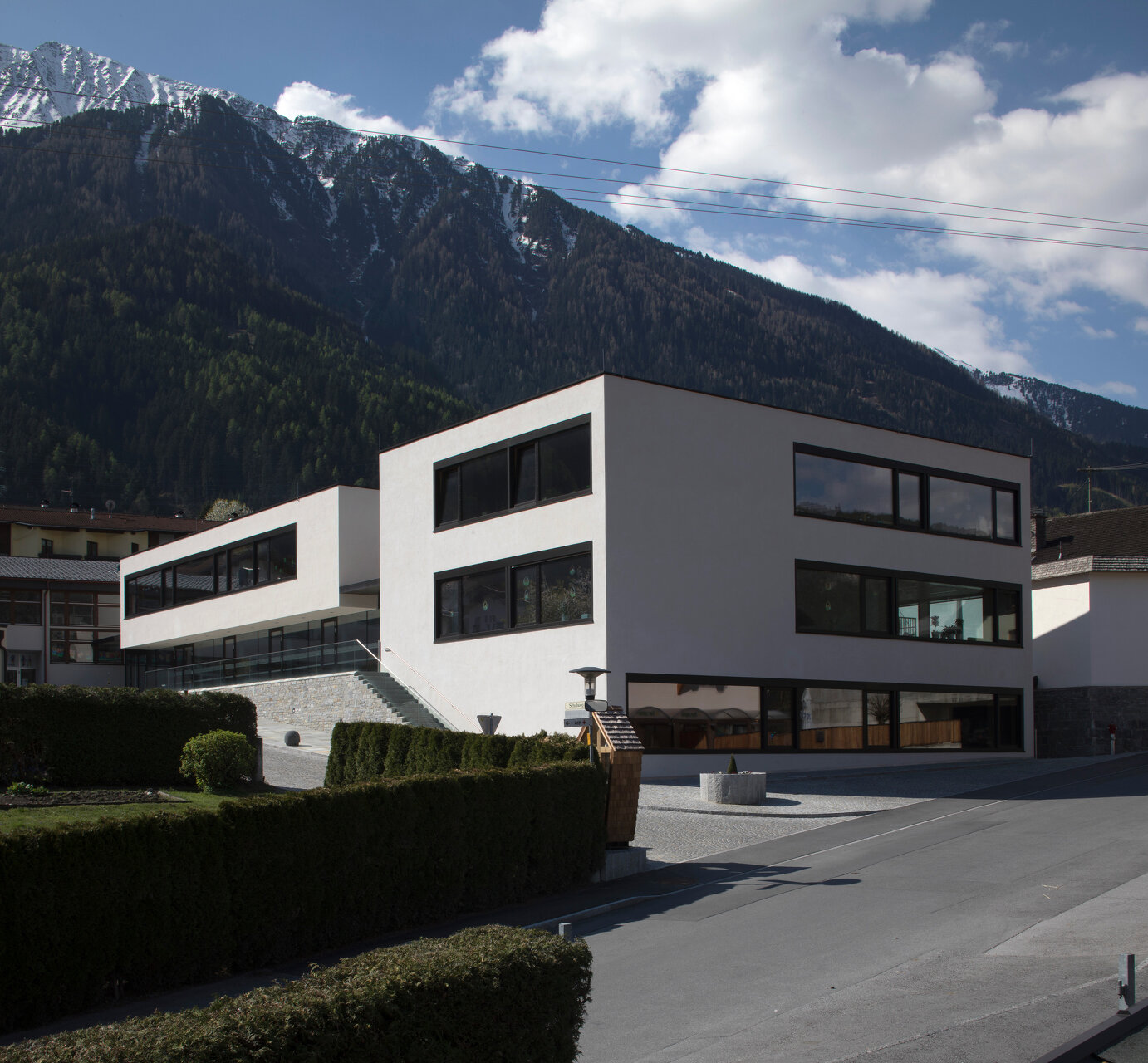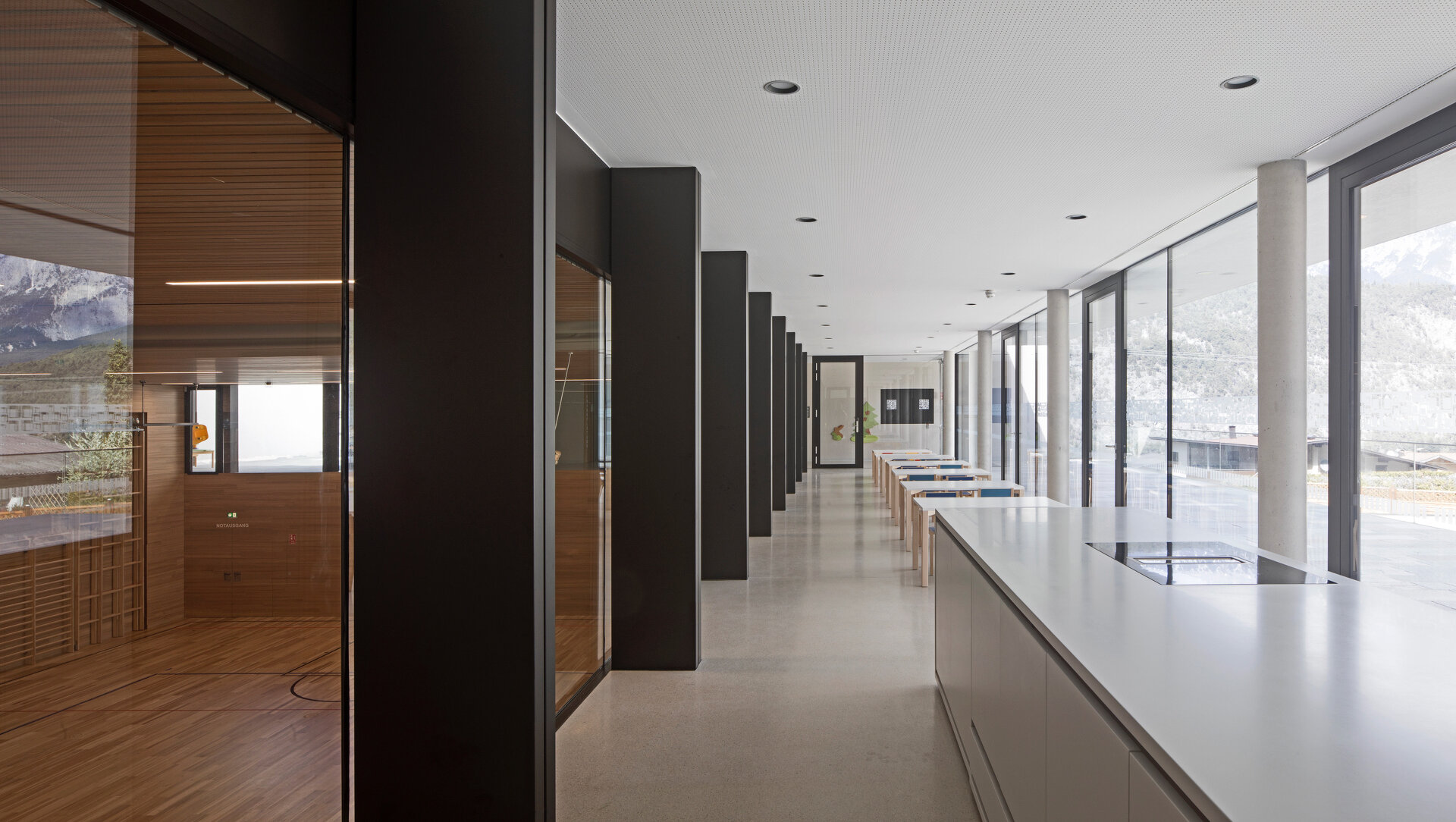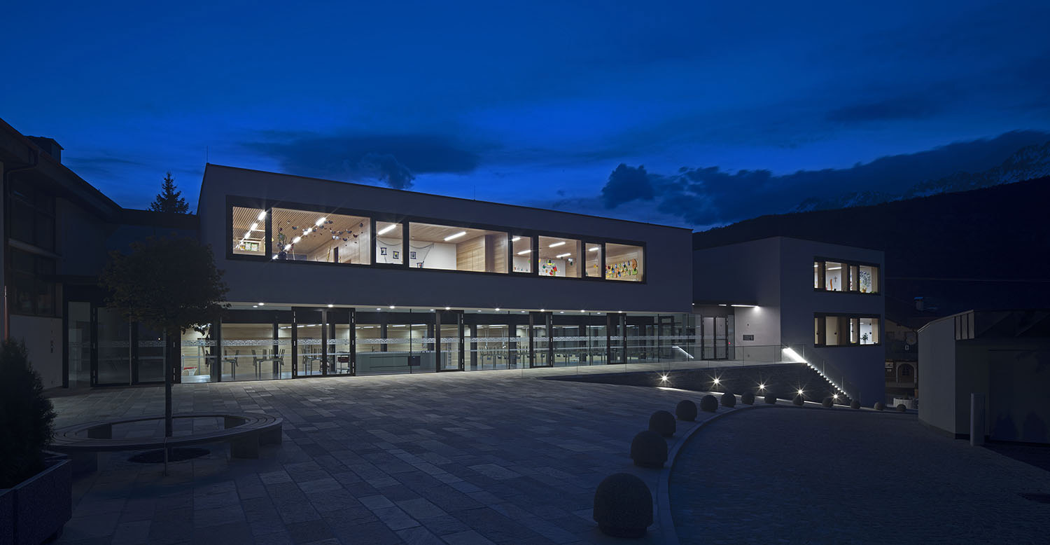 gritsch.haselwanter architekten konzipierten für dieses heterogene Raumprogramm eine kompakte Lösung, die aus zwei miteinander verbundenen, bewusst zurückhaltend gestalteten Baukörpern besteht. An die Volksschule angeschlossen liegt ein nach Außen zweigeschoßig in Erscheinung tretender Längstrakt mit der abgesenkten Turnhalle, von diesem optisch abgesetzt ein eigenständiges, die Hanglage nutzendes dreigeschoßiges Volumen. In diesem Bauteil befinden sich die von der Dorfstraße aus erschlossenen Bereiche für die Musikkapelle mit einem Foyer und Aufenthaltsräumen auf Straßenniveau und dem Musikproberaum im Untergeschoß. In der darüber liegenden und vom Vorplatz aus ebenerdig erschlossen Ebene wurden die Krabbelstube sowie die Küche und Personalräume untergebracht. Im Obergeschoß der beiden Bauteile liegen die Gruppenräume des Kindergartens, die, unterschiedlich orientiert, um den gemeinsamen Freibereich angeordnet sind, womit eine differenzierte Spiel- und Lernlandschaft geschaffen wurde. Kernstück des Neubaus ist die zum Vorplatz hin vollflächig verglaste, dem Luftraum der Sporthalle vorgelagerte Aula, von der aus sämtliche Nutzungen erschlossen sind. Die Sporthalle erhält über diese Lösung die gewünschte natürliche Belichtung und für die gemeinsam genutzten Bereiche wie den Mittagstisch gibt es ein großzügiges und durchlässiges Raumangebot.