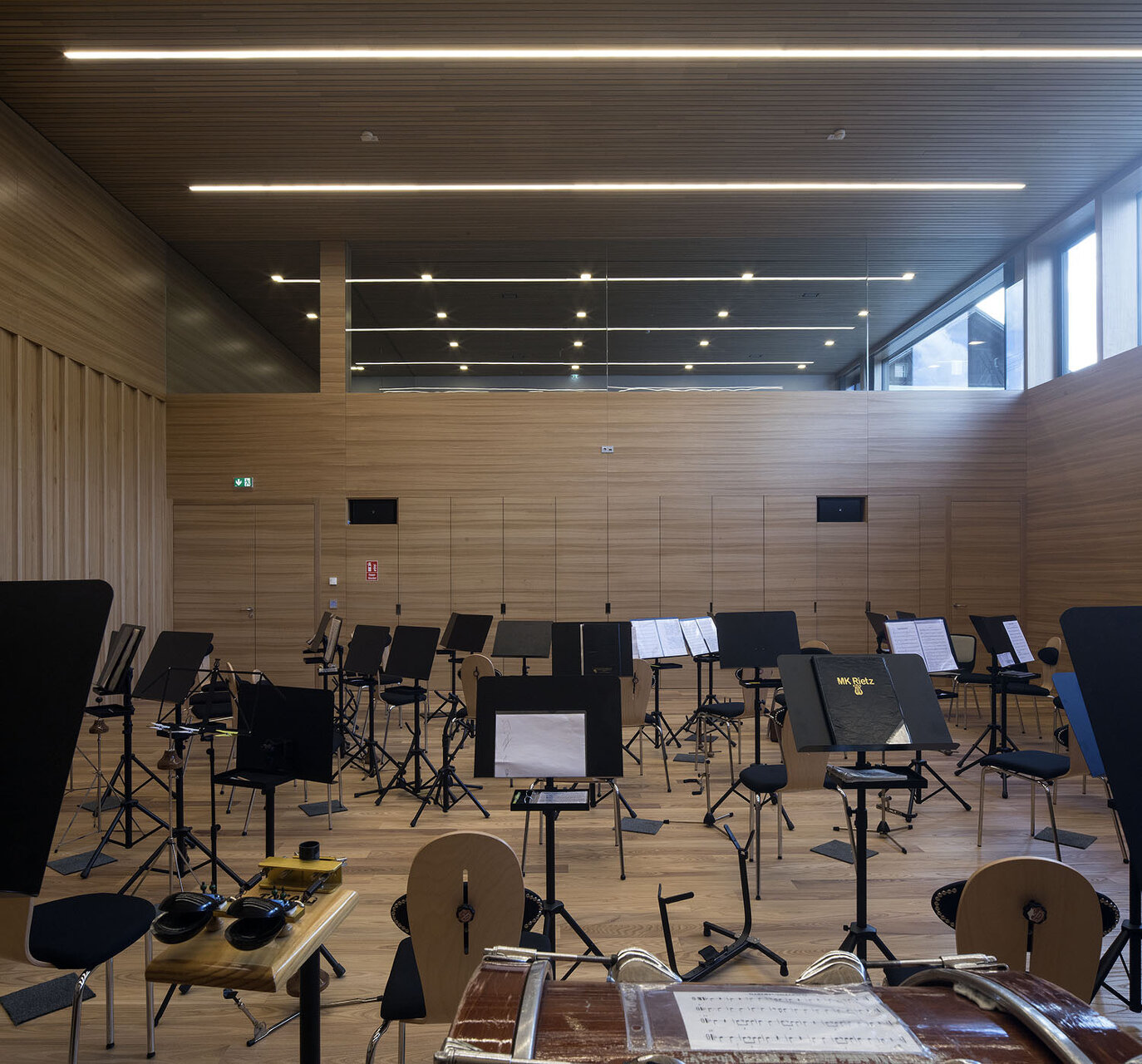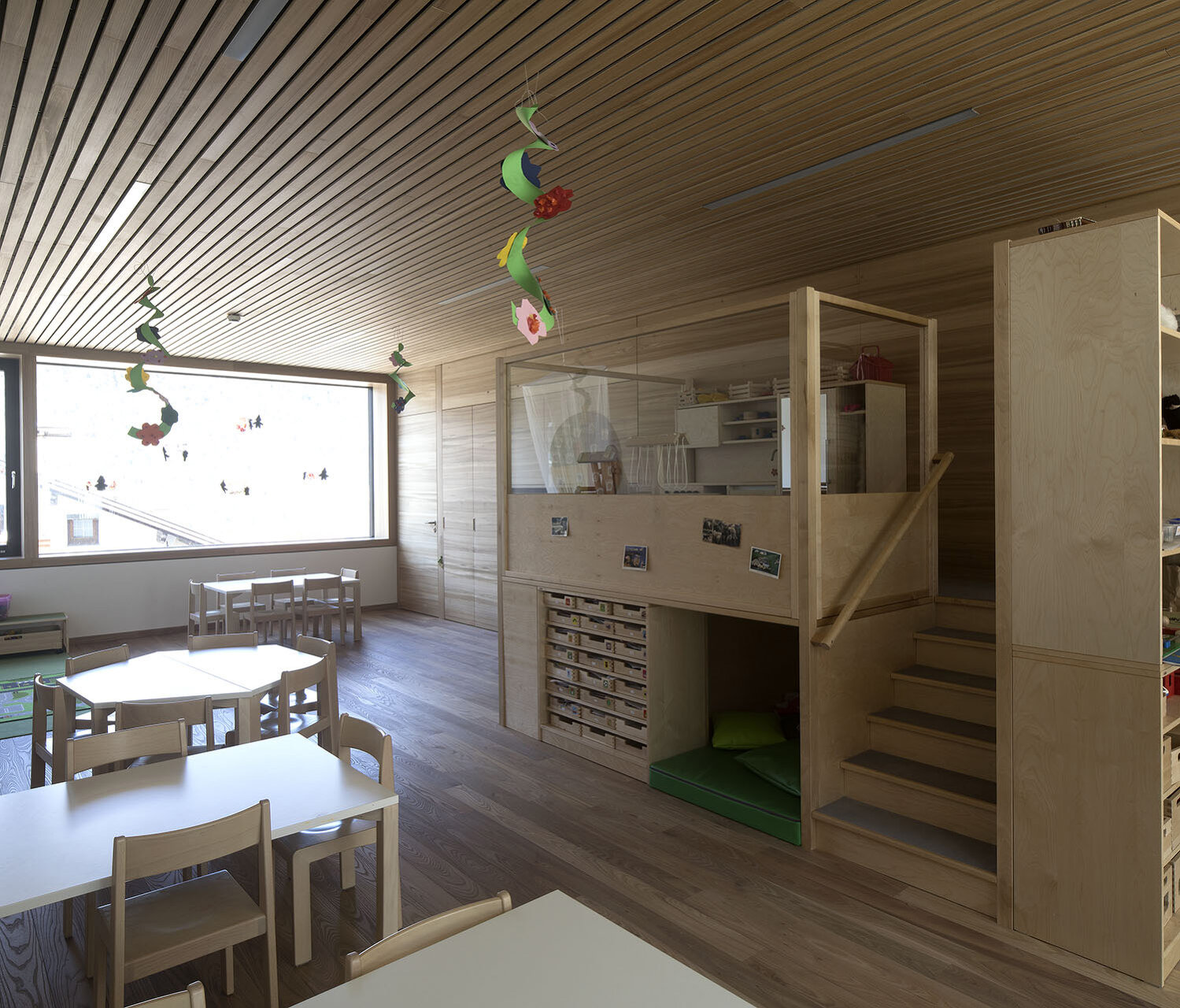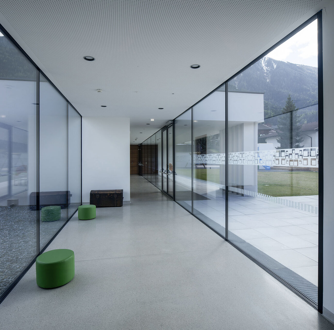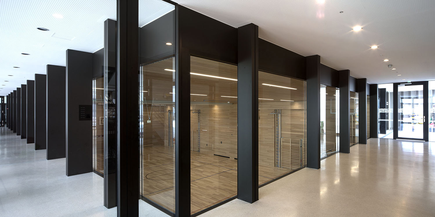 gritsch.haselwanter architekten konzipierten für dieses heterogene Raumprogramm eine kompakte Lösung, die aus zwei miteinander verbundenen, bewusst zurückhaltend gestalteten Baukörpern besteht. An die Volksschule angeschlossen liegt ein nach Außen zweigeschoßig in Erscheinung tretender Längstrakt mit der abgesenkten Turnhalle, von diesem optisch abgesetzt ein eigenständiges, die Hanglage nutzendes dreigeschoßiges Volumen. In diesem Bauteil befinden sich die von der Dorfstraße aus erschlossenen Bereiche für die Musikkapelle mit einem Foyer und Aufenthaltsräumen auf Straßenniveau und dem Musikproberaum im Untergeschoß. In der darüber liegenden und vom Vorplatz aus ebenerdig erschlossen Ebene wurden die Krabbelstube sowie die Küche und Personalräume untergebracht. Im Obergeschoß der beiden Bauteile liegen die Gruppenräume des Kindergartens, die, unterschiedlich orientiert, um den gemeinsamen Freibereich angeordnet sind, womit eine differenzierte Spiel- und Lernlandschaft geschaffen wurde. Kernstück des Neubaus ist die zum Vorplatz hin vollflächig verglaste, dem Luftraum der Sporthalle vorgelagerte Aula, von der aus sämtliche Nutzungen erschlossen sind. Die Sporthalle erhält über diese Lösung die gewünschte natürliche Belichtung und für die gemeinsam genutzten Bereiche wie den Mittagstisch gibt es ein großzügiges und durchlässiges Raumangebot.