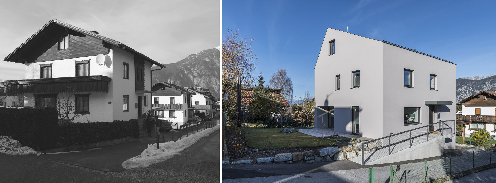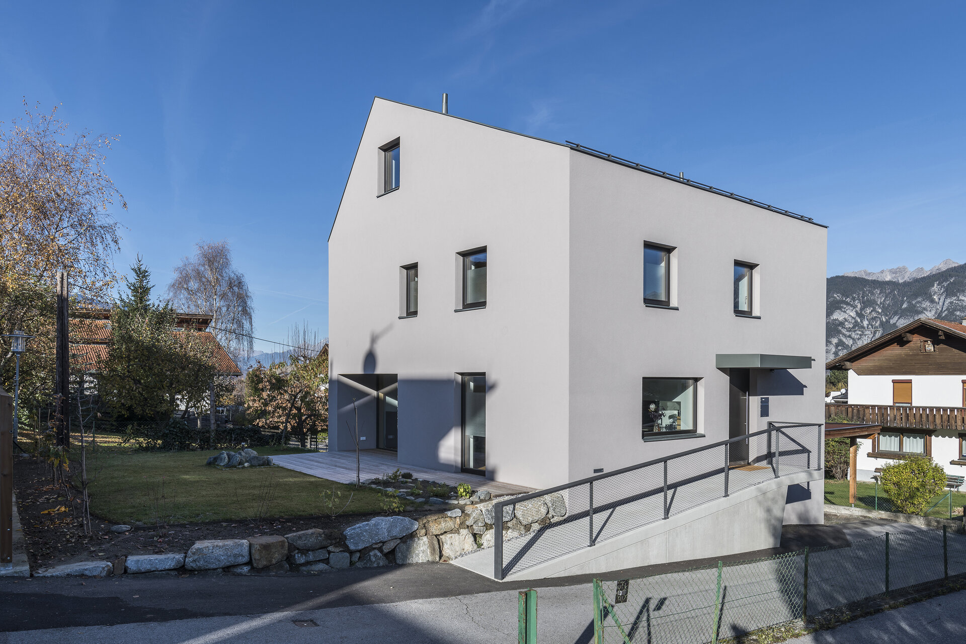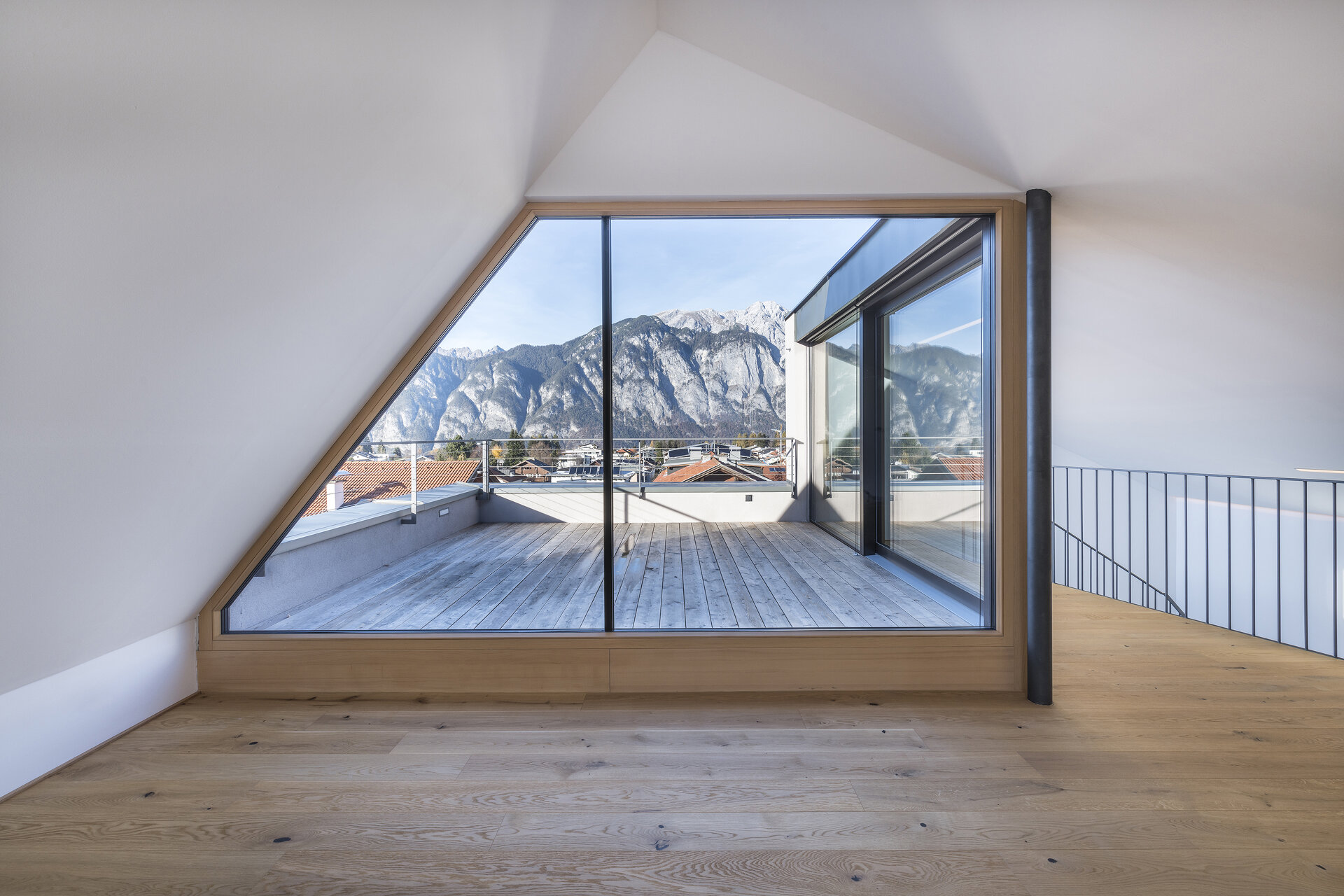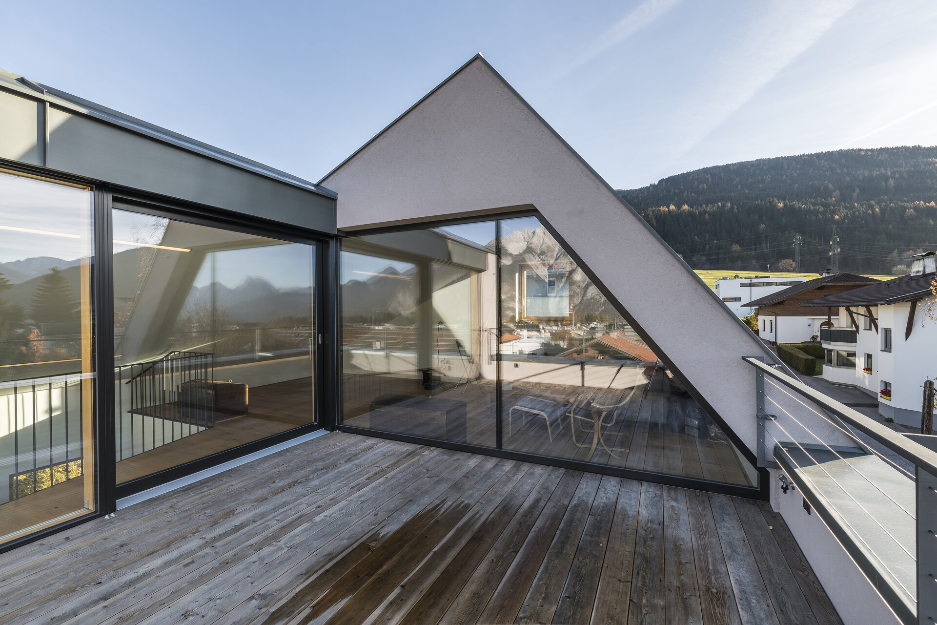 Im Erdgeschoß wurden drei kleine Zimmer in einen offenen Wohn-Essbereich transformiert, der sich über vergrößerte Fensterflächen auf die Terrasse und in den Garten öffnet. Im Obergeschoß sind die Schlafzimmer und Bäder untergebracht, außerdem wurde ein kleiner Arbeitsplatz eingerichtet, der über das offene Stiegenhaus von oben belichtet wird. Das bestehende Treppenhaus setzt sich in einer neu errichteten, frei im Luftraum schwebenden Treppe aus gekantetem Stahlblech fort, die ins ausgebaute Dachgeschoss hinauf führt. Dort wurde – der Grundstruktur des Bestandes folgend – ein Viertel des Daches nach Westen für eine Dachterrasse geöffnet. Durch die außermittige Verschiebung des Firstes konnte ein überhöhter, spannender Wohnraum mit Zugang zur Dachterrasse geschaffen werden, von der sich in der Abendsonne die Aussicht auf die umliegende Bergwelt genießen lässt. Eine neue Sichtbetonrampe ermöglicht die barrierefreie Erschließung des Gebäudes, dessen Innenräume durch Türen und Tischlermöbel in Eichenfurnier und unter Verwendung von heimischem Naturstein ein einheitliches Gesamtbild erhielten. (Text: Architekten, bearbeitet)