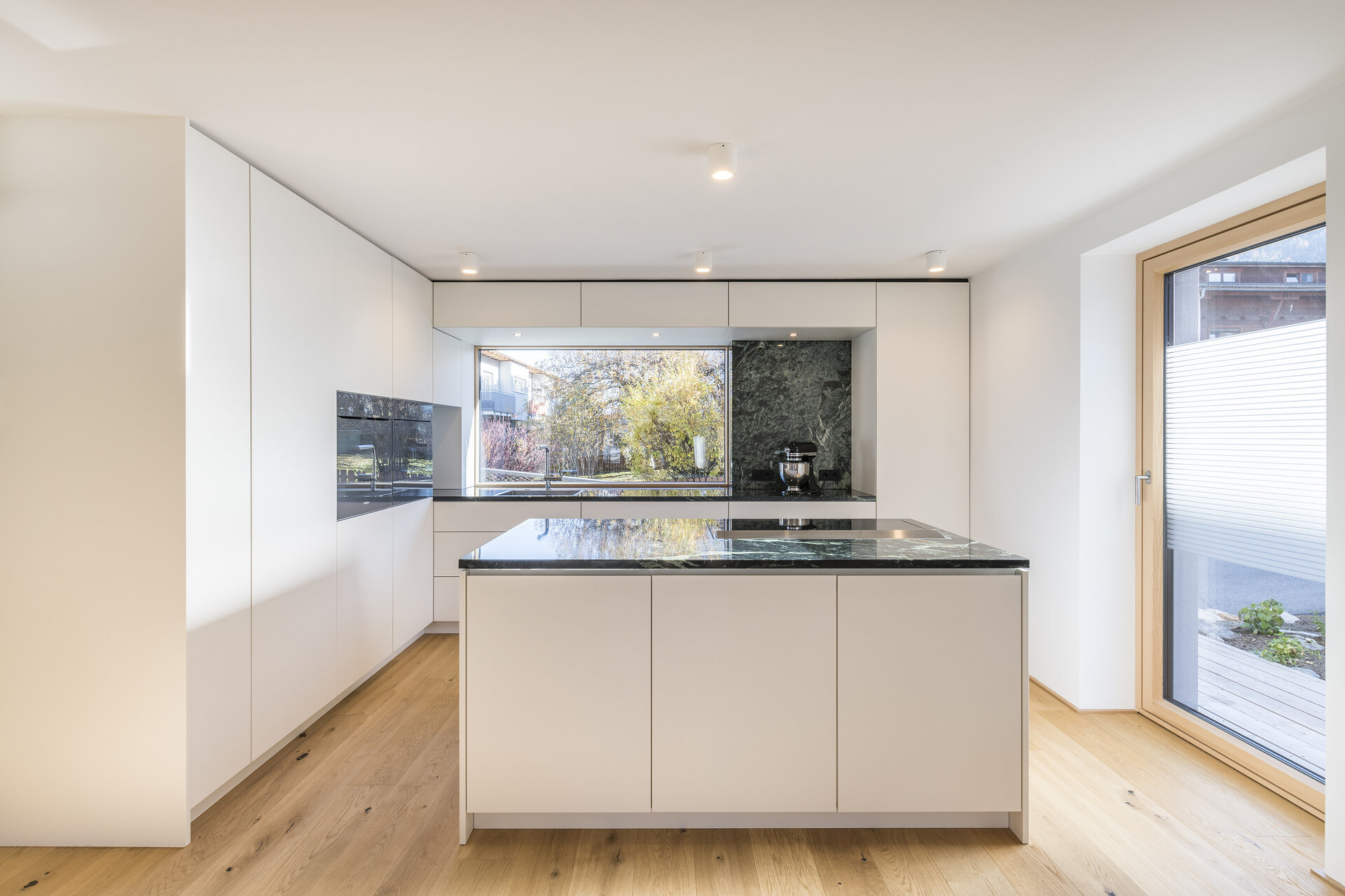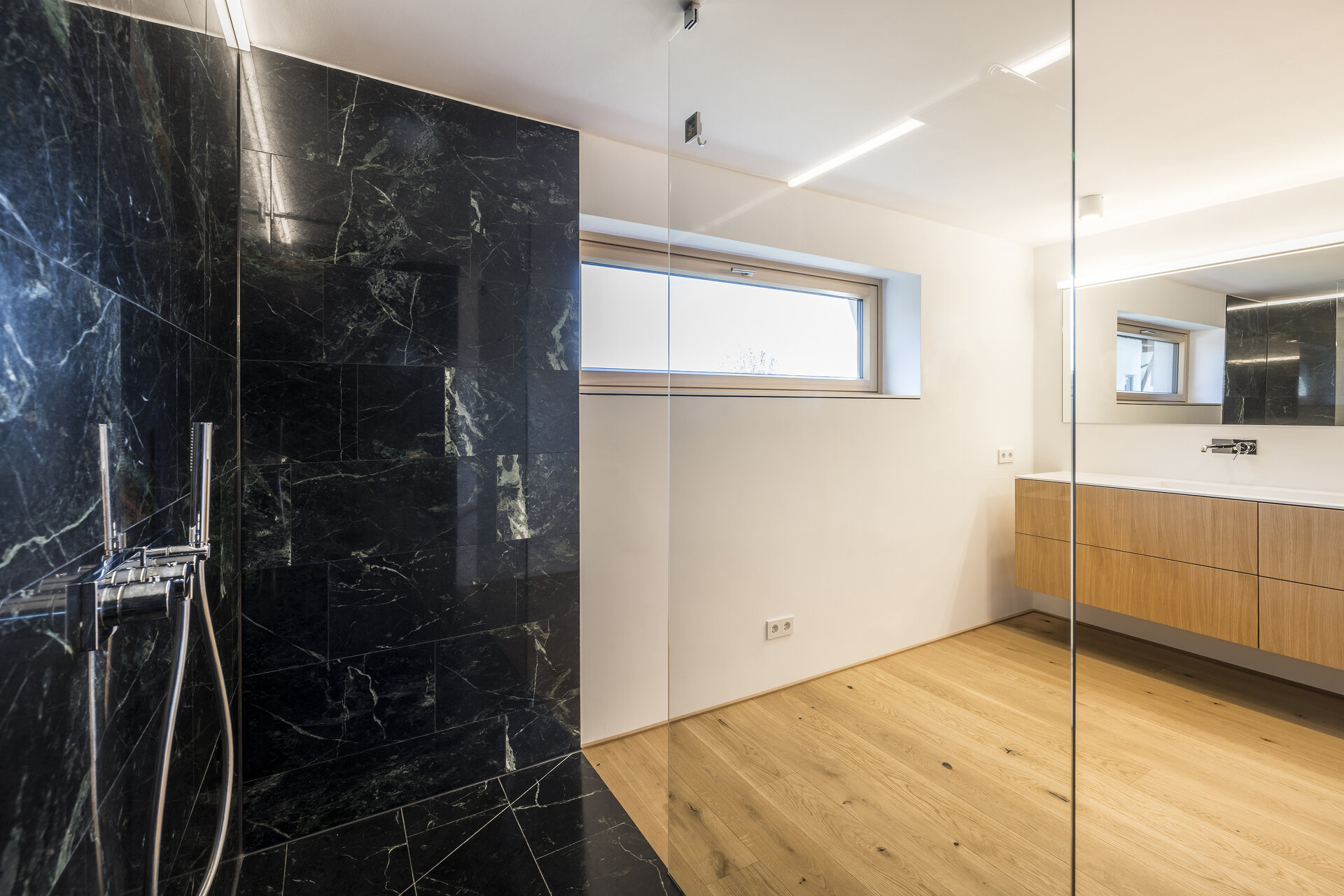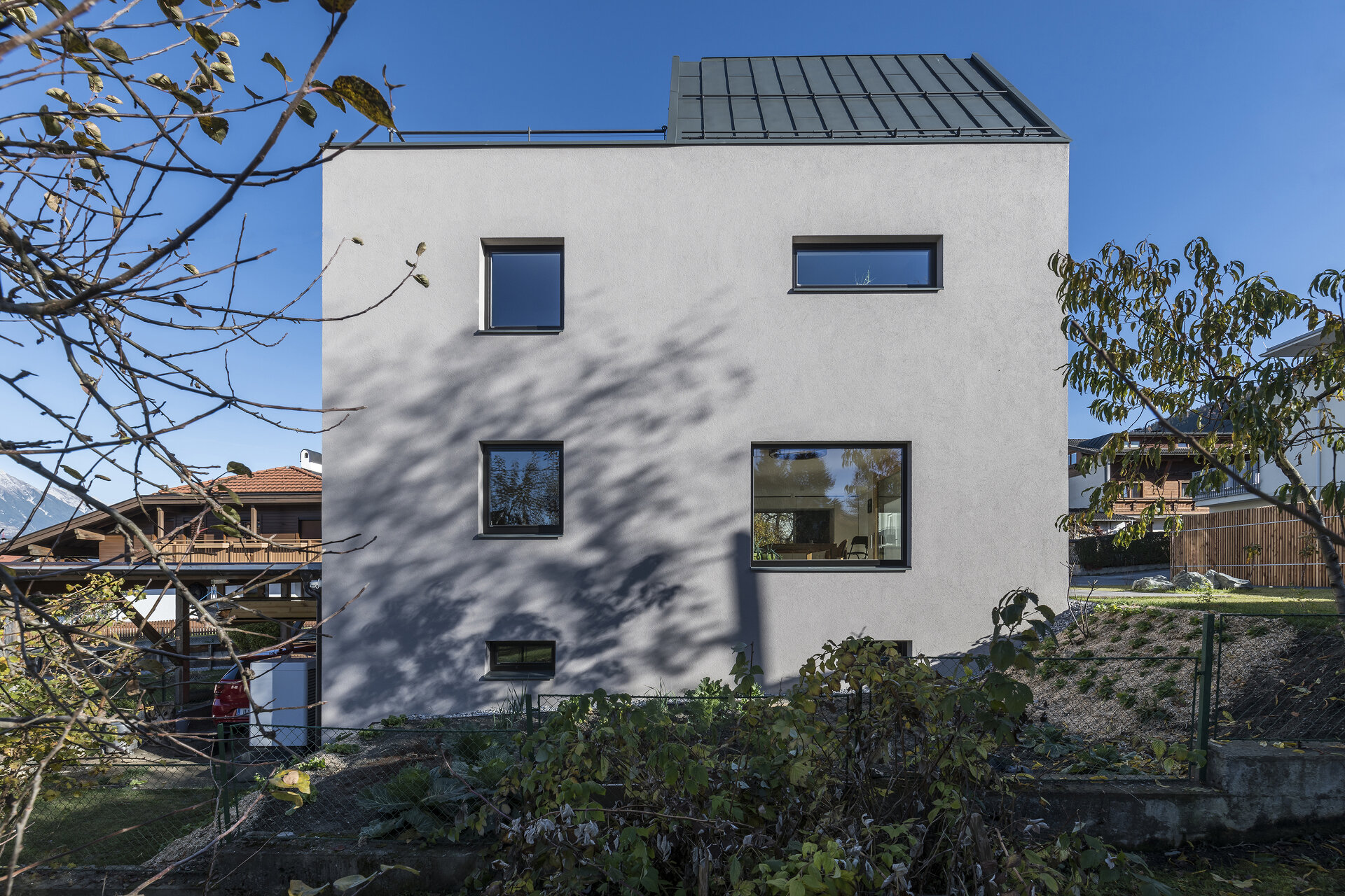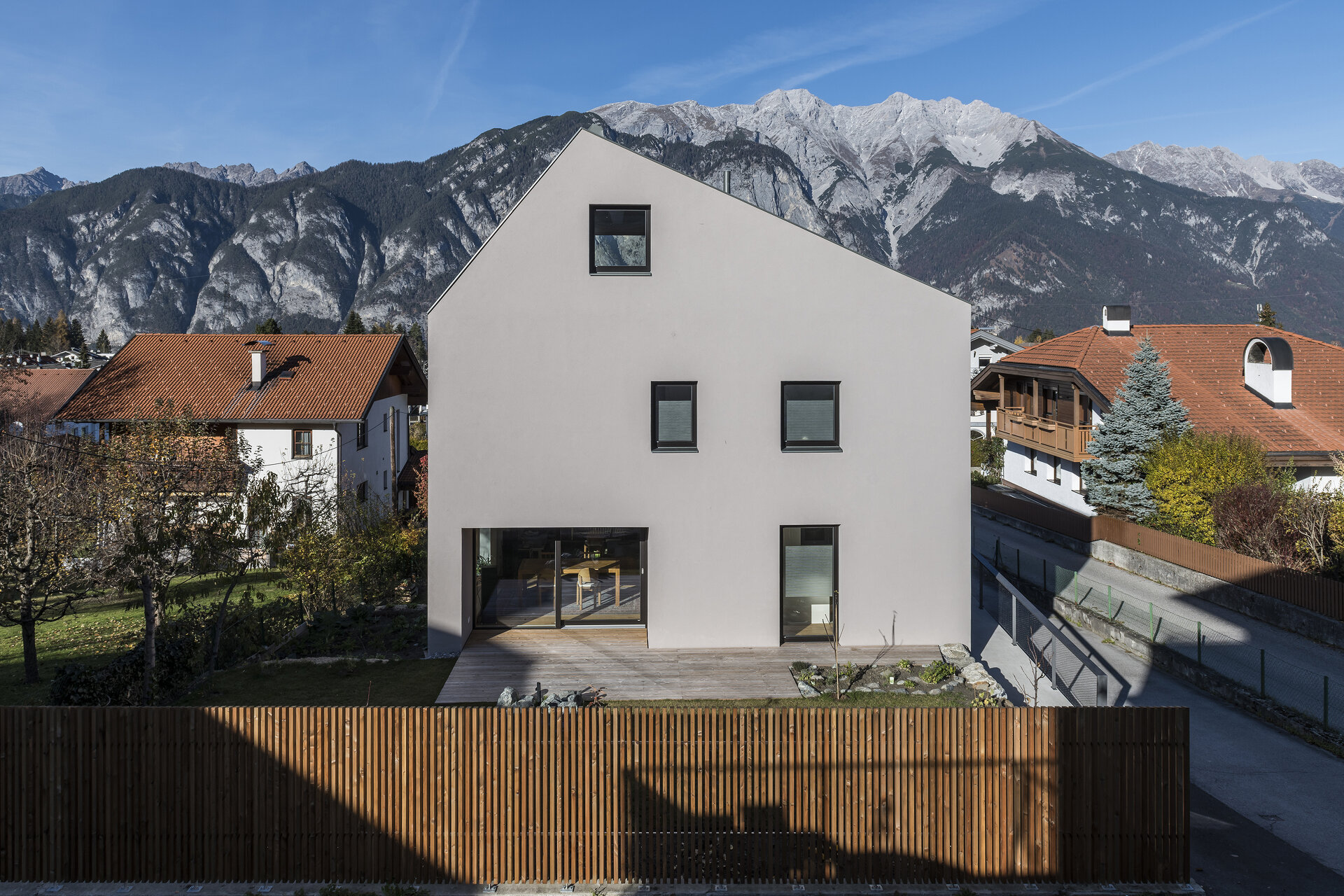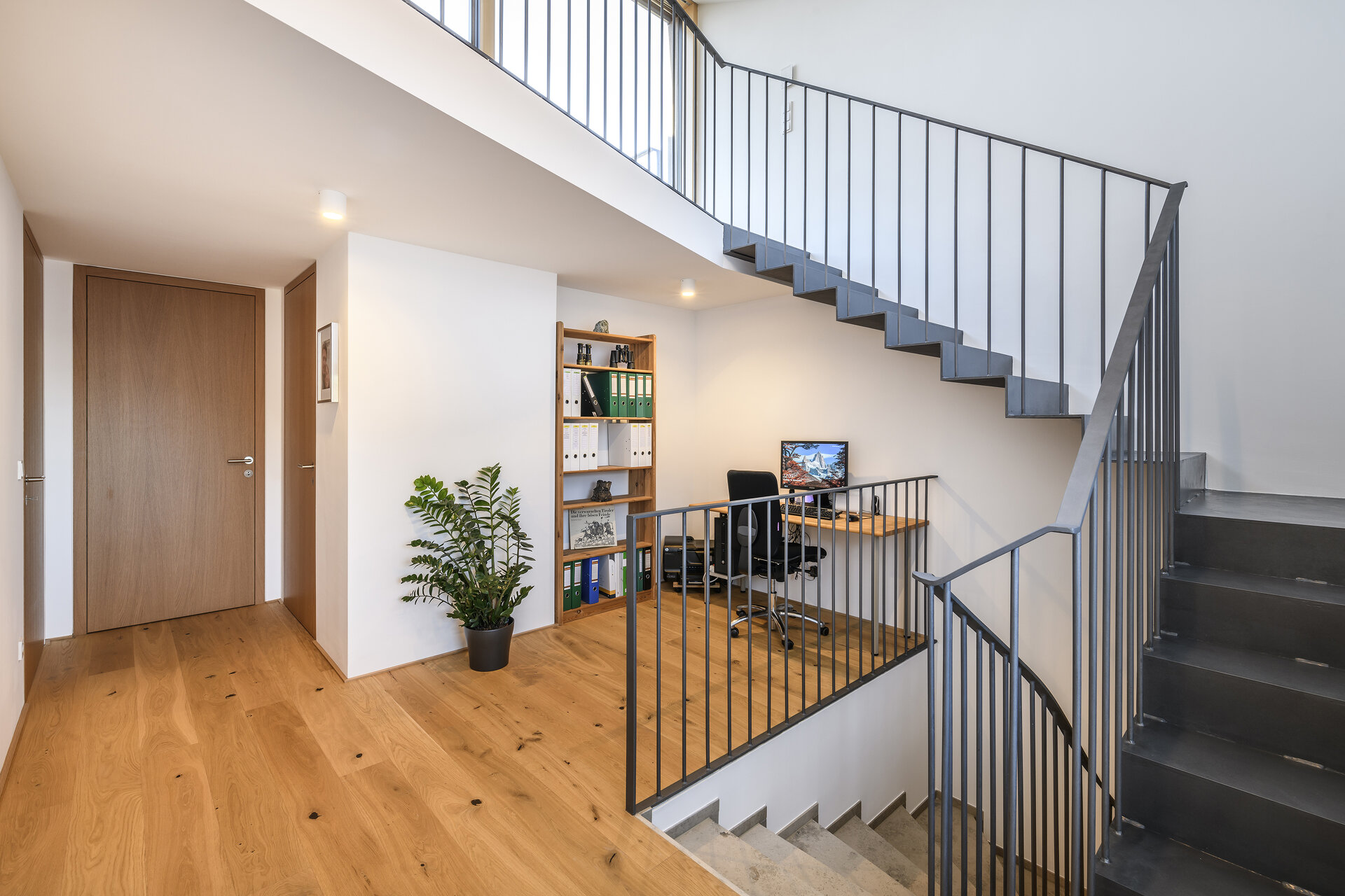 Im Erdgeschoß wurden drei kleine Zimmer in einen offenen Wohn-Essbereich transformiert, der sich über vergrößerte Fensterflächen auf die Terrasse und in den Garten öffnet. Im Obergeschoß sind die Schlafzimmer und Bäder untergebracht, außerdem wurde ein kleiner Arbeitsplatz eingerichtet, der über das offene Stiegenhaus von oben belichtet wird. Das bestehende Treppenhaus setzt sich in einer neu errichteten, frei im Luftraum schwebenden Treppe aus gekantetem Stahlblech fort, die ins ausgebaute Dachgeschoss hinauf führt. Dort wurde – der Grundstruktur des Bestandes folgend – ein Viertel des Daches nach Westen für eine Dachterrasse geöffnet. Durch die außermittige Verschiebung des Firstes konnte ein überhöhter, spannender Wohnraum mit Zugang zur Dachterrasse geschaffen werden, von der sich in der Abendsonne die Aussicht auf die umliegende Bergwelt genießen lässt. Eine neue Sichtbetonrampe ermöglicht die barrierefreie Erschließung des Gebäudes, dessen Innenräume durch Türen und Tischlermöbel in Eichenfurnier und unter Verwendung von heimischem Naturstein ein einheitliches Gesamtbild erhielten. (Text: Architekten, bearbeitet)