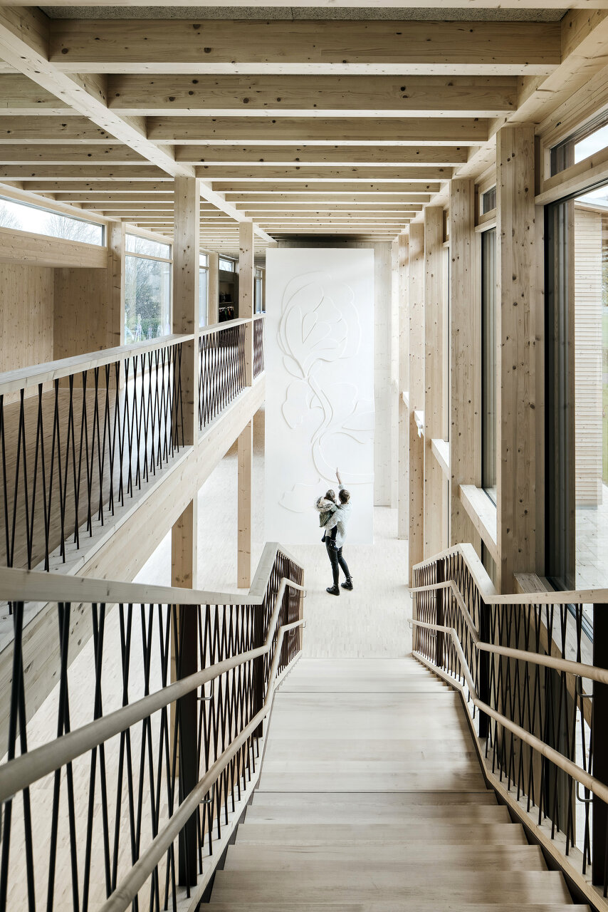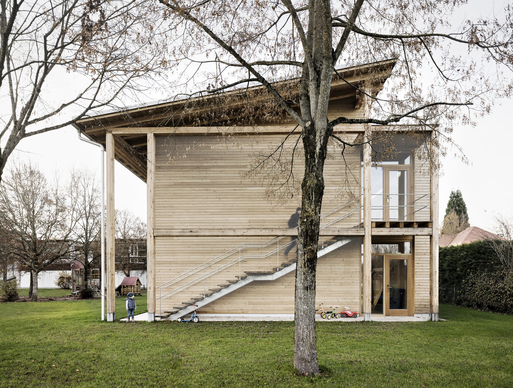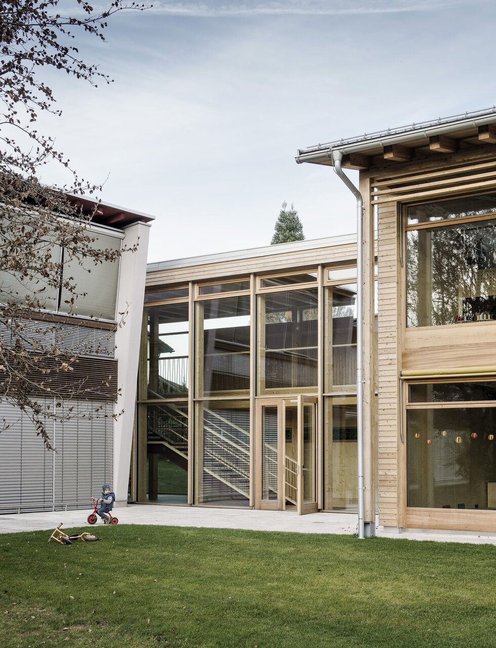 Der Neubau in Gestalt eines langgestreckten zweigeschossigen Baues führt sowohl den Typus, den Maßstab und Geschoßigkeit des Bestandbaus fort und bildet mit diesem eine winkelförmige Gesamtfigur. Das „Gelenk“ zwischen Alt und Neu fungiert als transparente, geschoßübergreifende Kommunikationszone und bildet den Zugang zum großen bestehenden Garten mit schönem Baumbestand. Sämtliche Gruppen- und Bewegungsräume orientieren sich zu dieser qualitätvollen Freifläche mit vorgelagerter Terrassen- und Balkonzone. Ein-, Aus- und Durchblicke sorgen für mehrseitige natürliche Belichtung und ein differenziertes Raumerlebnis.