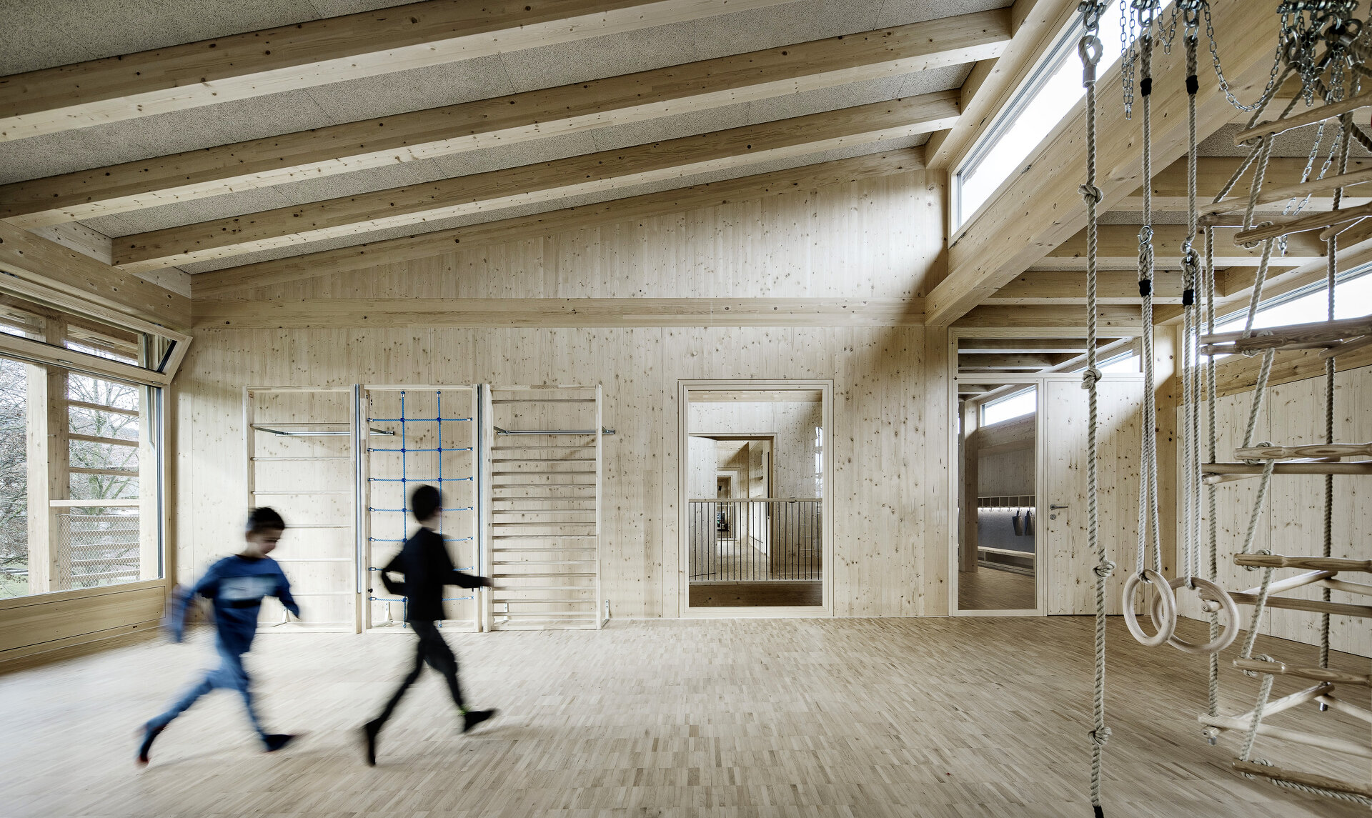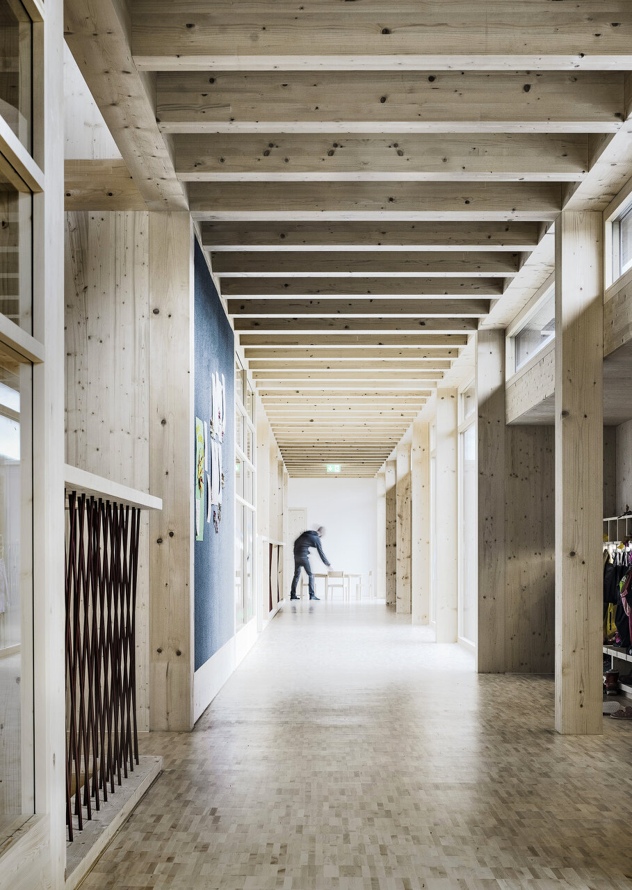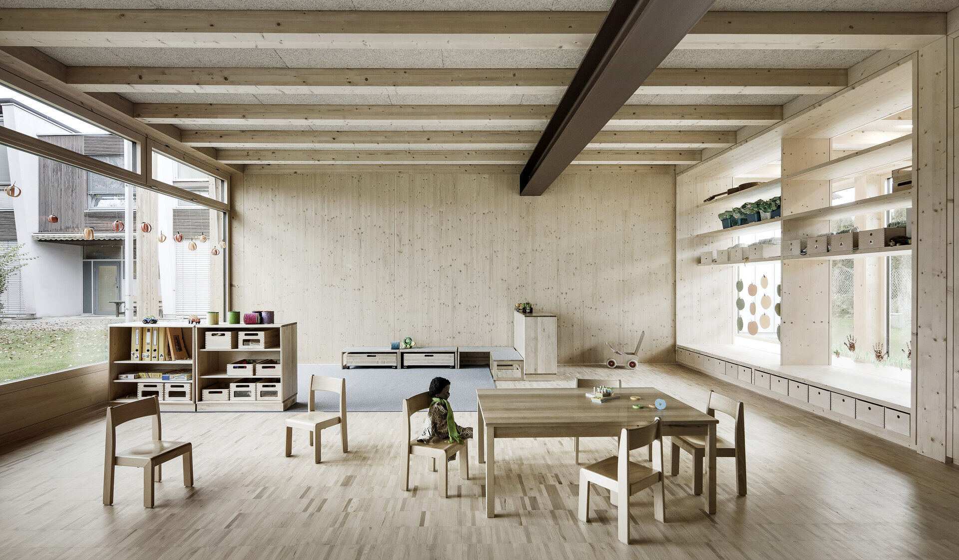 Auffälligster Unterschied zwischen dem Bestand und der Erweiterung liegt in der Verwendung des Materials. Handelt es sich beim Bestand um einen klassischen Massivbau, so wurde der Neubautrakt nunmehr in einer Massivholzkonstruktion umgesetzt. In Konstruktion und Raumkonfiguration wurde dabei besonders auf die Maßstäblichkeit aus dem Blickwinkel von Kleinkindern Bedacht genommen wurde. (Text: Roman Höllbacher nach einem Text der Architekten)