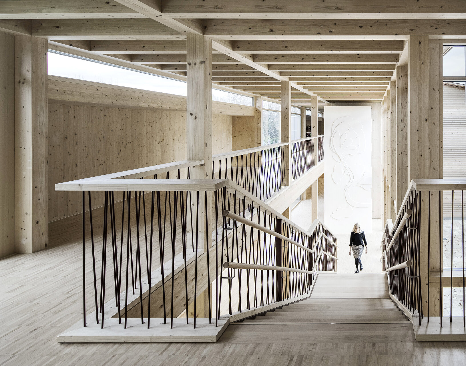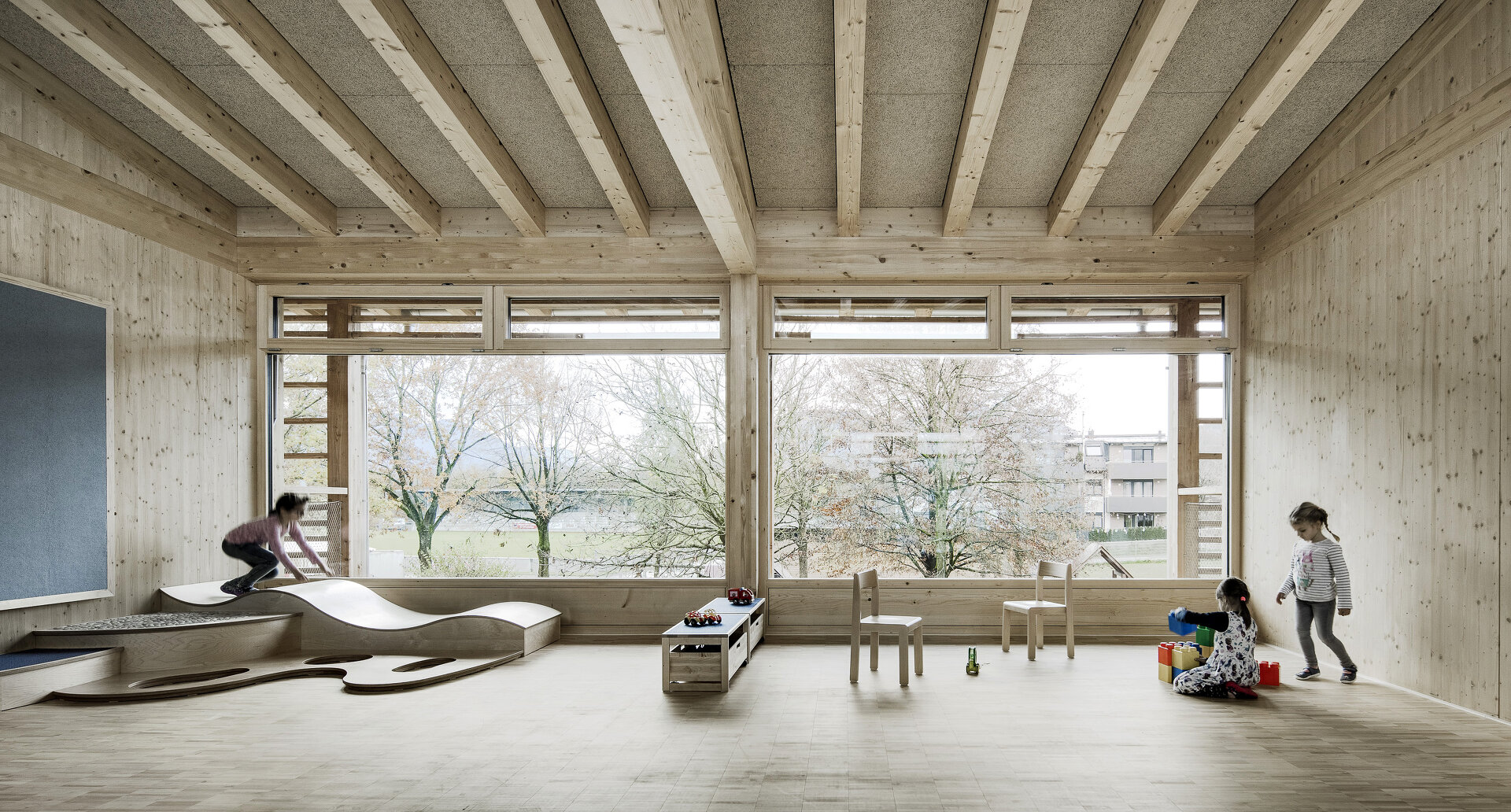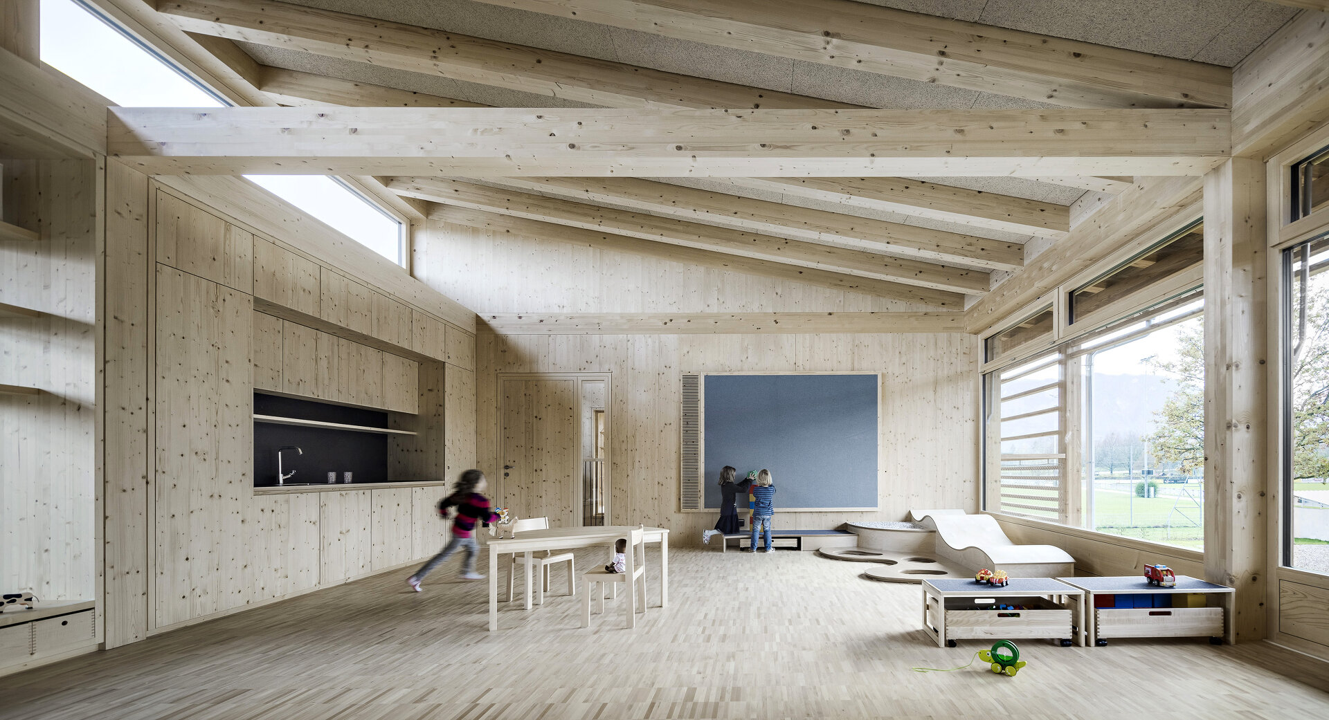 Auffälligster Unterschied zwischen dem Bestand und der Erweiterung liegt in der Verwendung des Materials. Handelt es sich beim Bestand um einen klassischen Massivbau, so wurde der Neubautrakt nunmehr in einer Massivholzkonstruktion umgesetzt. In Konstruktion und Raumkonfiguration wurde dabei besonders auf die Maßstäblichkeit aus dem Blickwinkel von Kleinkindern Bedacht genommen wurde. (Text: Roman Höllbacher nach einem Text der Architekten)