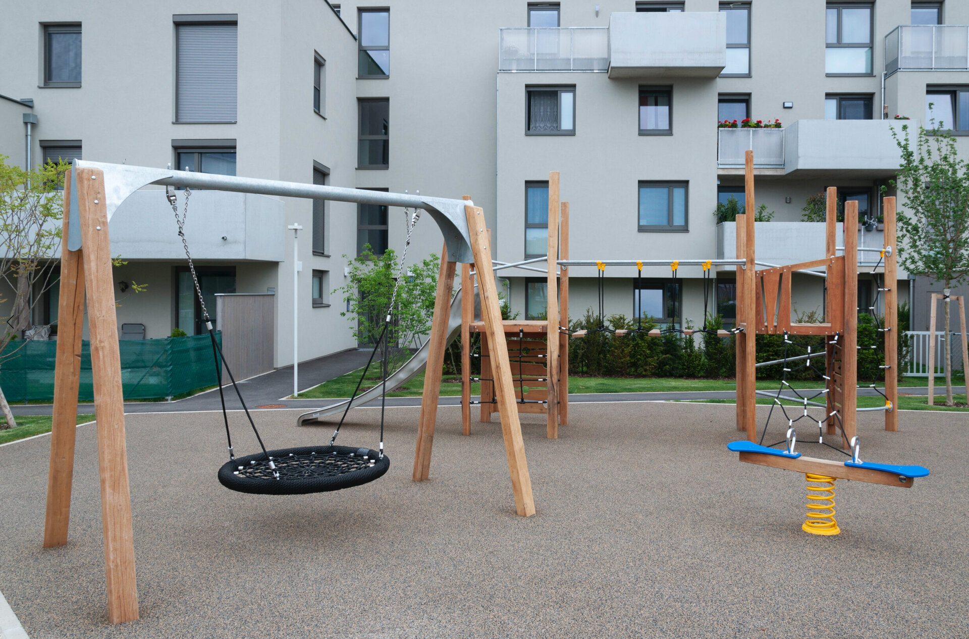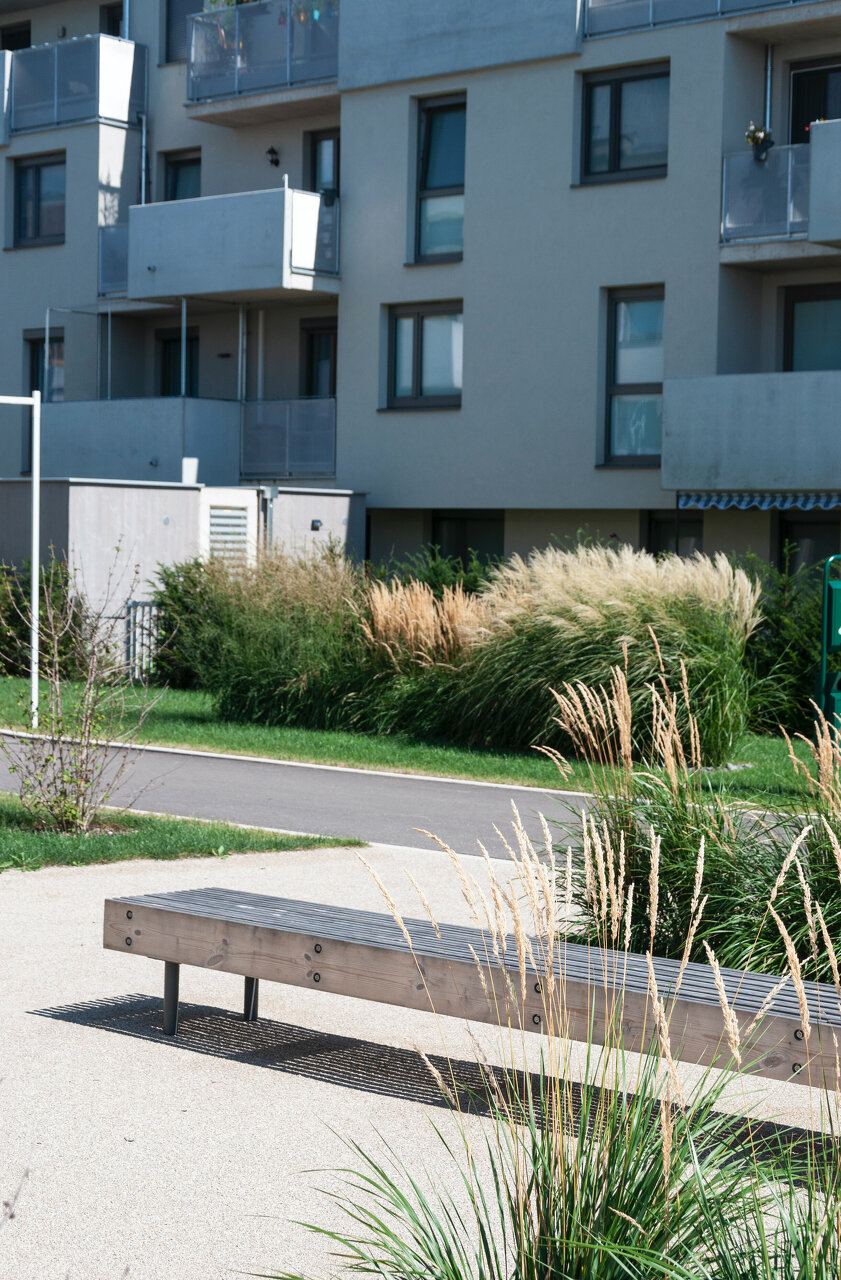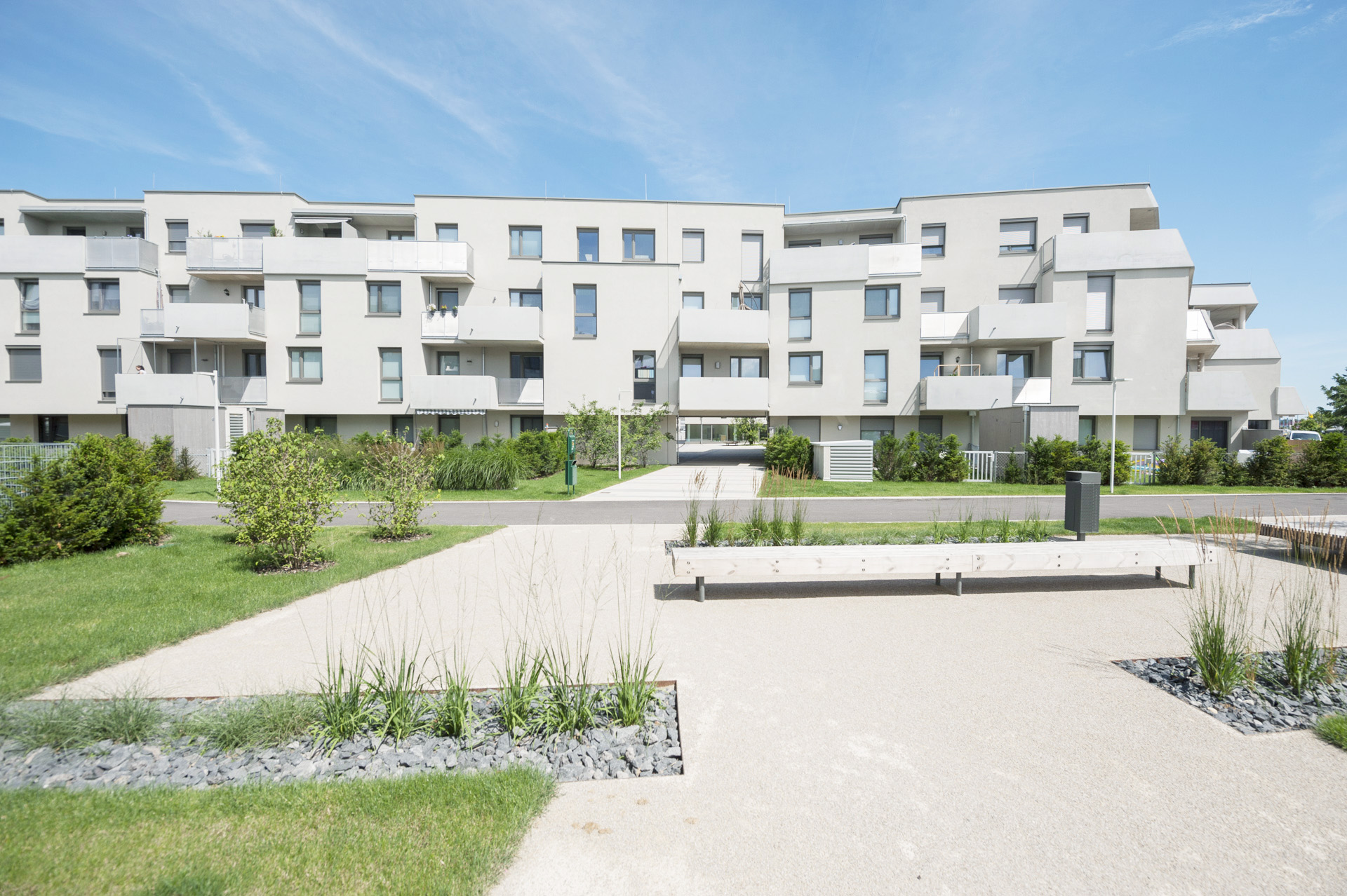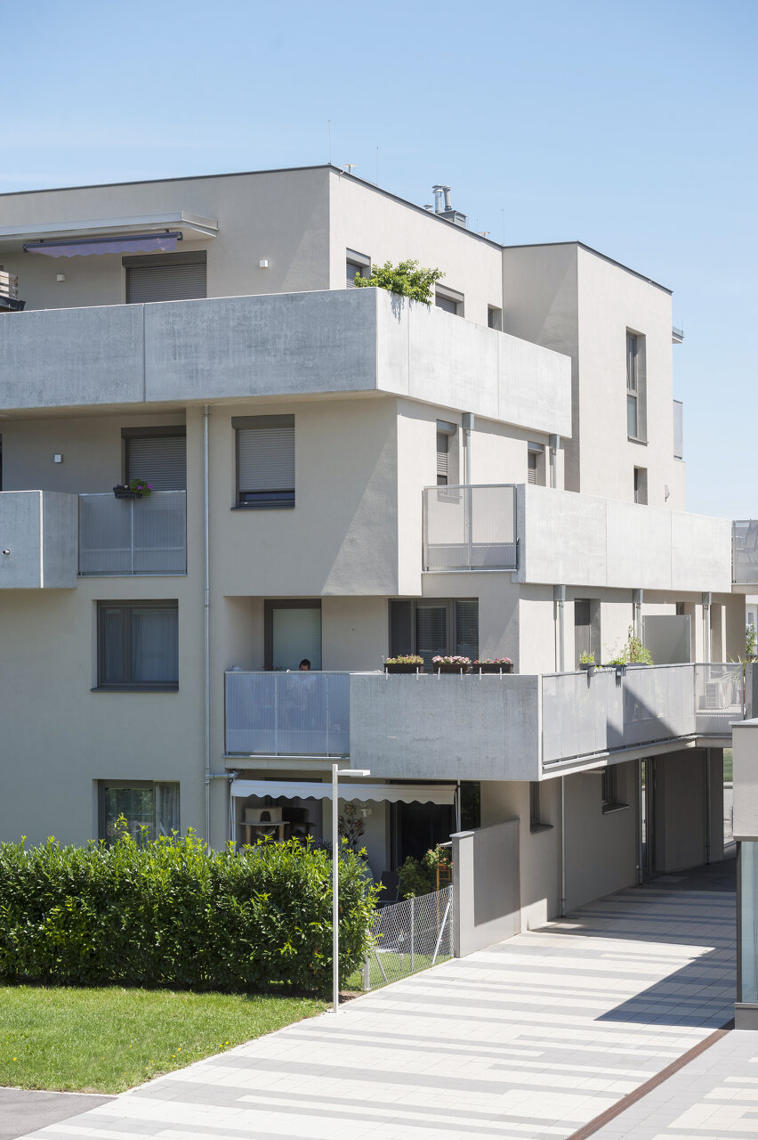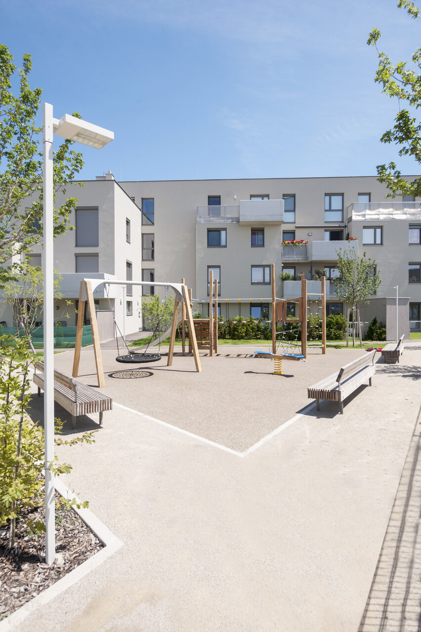 Das Bauvorhaben besteht aus vier viergeschossigen, leicht zueinander verschwenkten Bauteilen mit insgesamt 146 Wohnungen und einem Geschäftslokal. Vom Bründlfeldweg kommend führt ein breiter Durchgang am Geschäftslokal vorbei zum zentralen Quartiersplatz zwischen diesen Bauteilen, der von einer markanten dreigeschossigen Laubenganganlage mit Sichtbetonbalkonen räumlich gefasst wird und mittels Pflasterung gestalterisch akzentuiert ist. Ein Durchgang unter Bauteil 3 führt in Richtung Westen schließlich zu Bauteil Stiege 4, ebenfalls etwa in Nord-Süd Richtung orientiert. Zum Winzerweg und zur Rudolf-von-Eichthal-Strasse wird das Grundstück von einem als Spielplatz genutzten Freiraum begrenzt. Die Aufteilung des gesamten Volumens auf diese vier länglichen Bauteile führt zu einer kleinteiligeren, in einen abwechslungsreichen Freiraum eingebundenen Struktur und ermöglicht ein differenziertes Angebot an Wohnungstypen mit spezifischen Qualitäten.