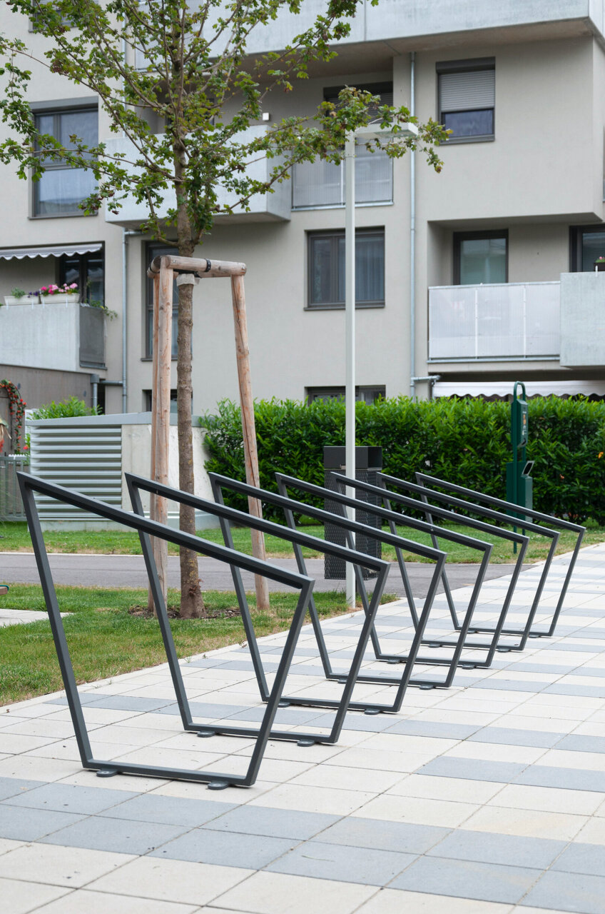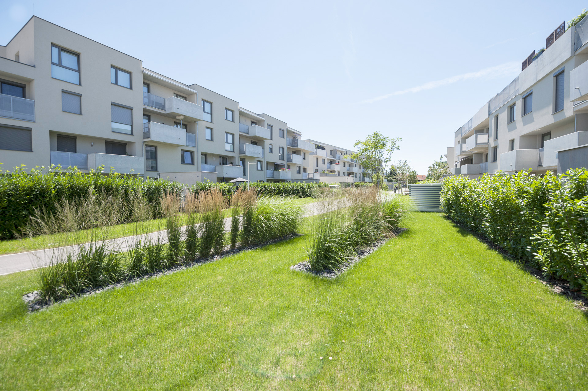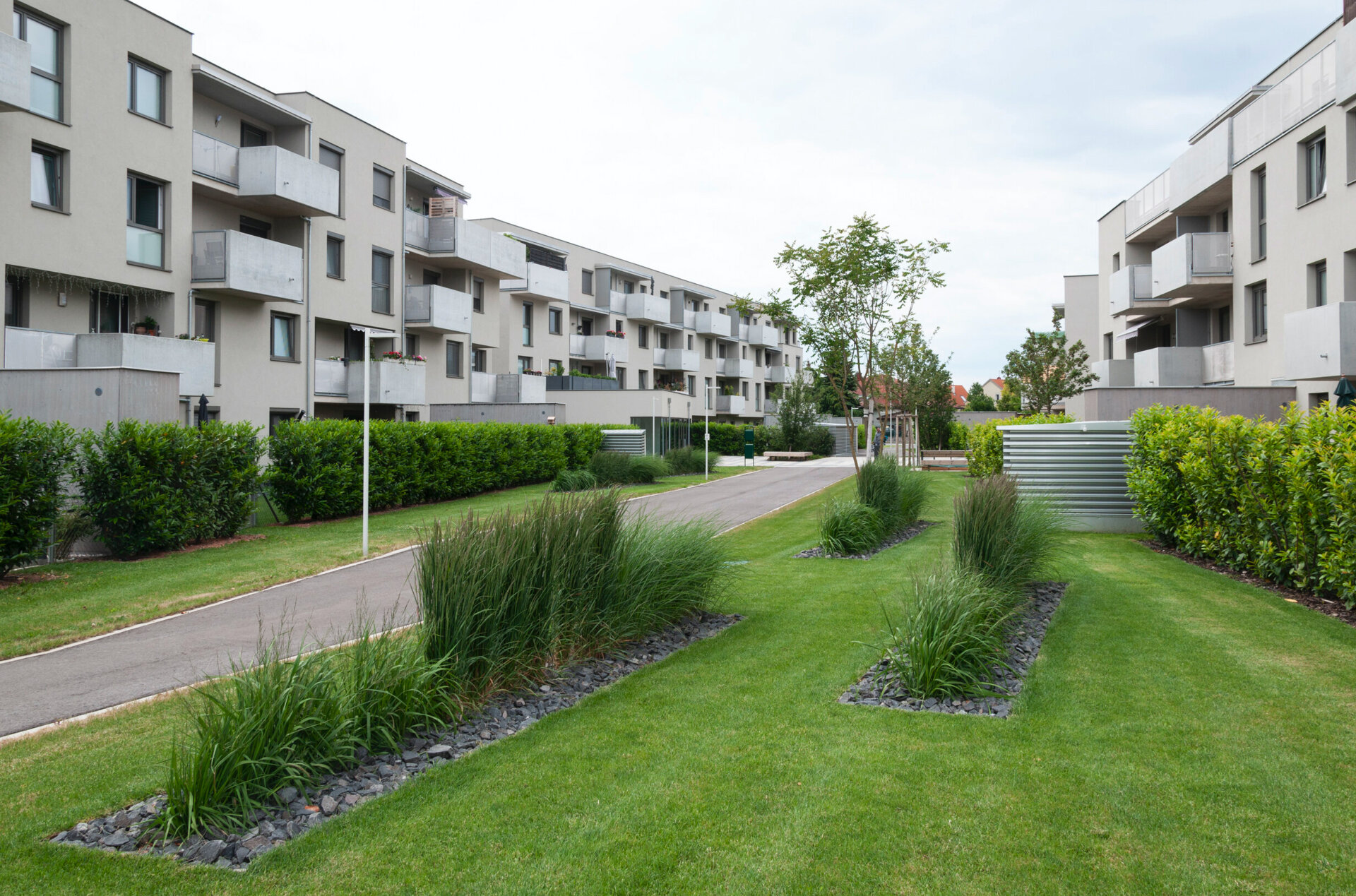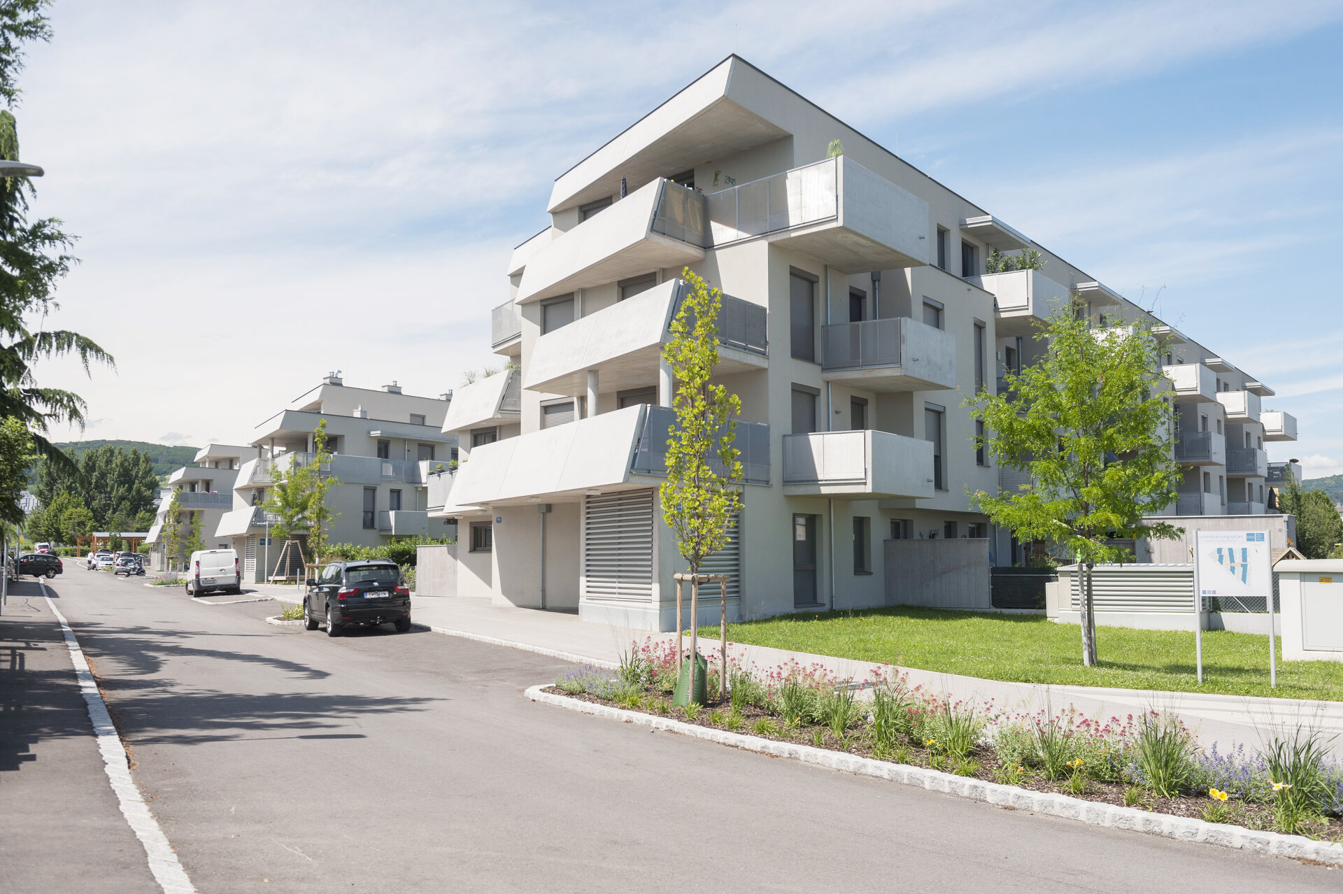 Das Bauvorhaben besteht aus vier viergeschossigen, leicht zueinander verschwenkten Bauteilen mit insgesamt 146 Wohnungen und einem Geschäftslokal. Vom Bründlfeldweg kommend führt ein breiter Durchgang am Geschäftslokal vorbei zum zentralen Quartiersplatz zwischen diesen Bauteilen, der von einer markanten dreigeschossigen Laubenganganlage mit Sichtbetonbalkonen räumlich gefasst wird und mittels Pflasterung gestalterisch akzentuiert ist. Ein Durchgang unter Bauteil 3 führt in Richtung Westen schließlich zu Bauteil Stiege 4, ebenfalls etwa in Nord-Süd Richtung orientiert. Zum Winzerweg und zur Rudolf-von-Eichthal-Strasse wird das Grundstück von einem als Spielplatz genutzten Freiraum begrenzt. Die Aufteilung des gesamten Volumens auf diese vier länglichen Bauteile führt zu einer kleinteiligeren, in einen abwechslungsreichen Freiraum eingebundenen Struktur und ermöglicht ein differenziertes Angebot an Wohnungstypen mit spezifischen Qualitäten.