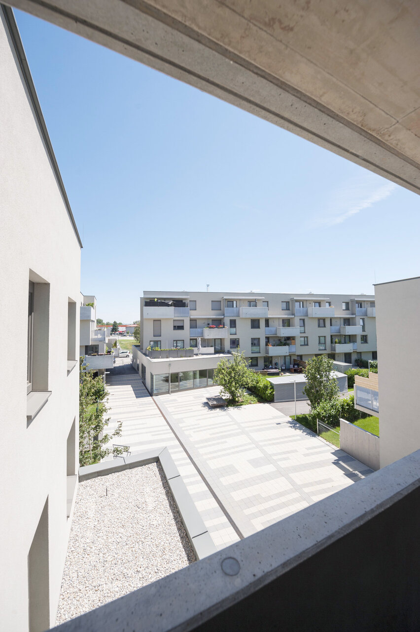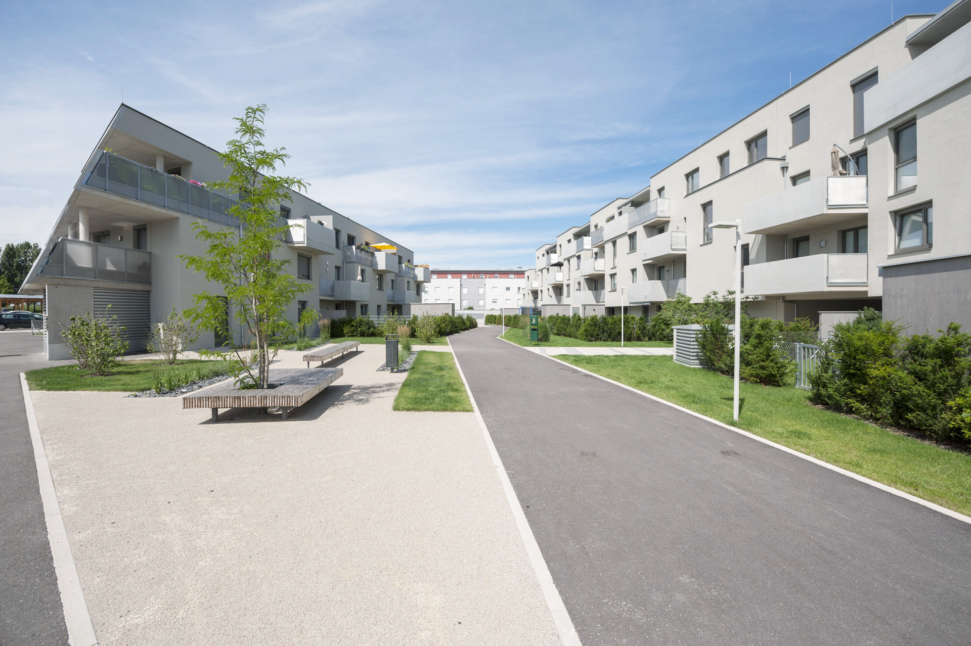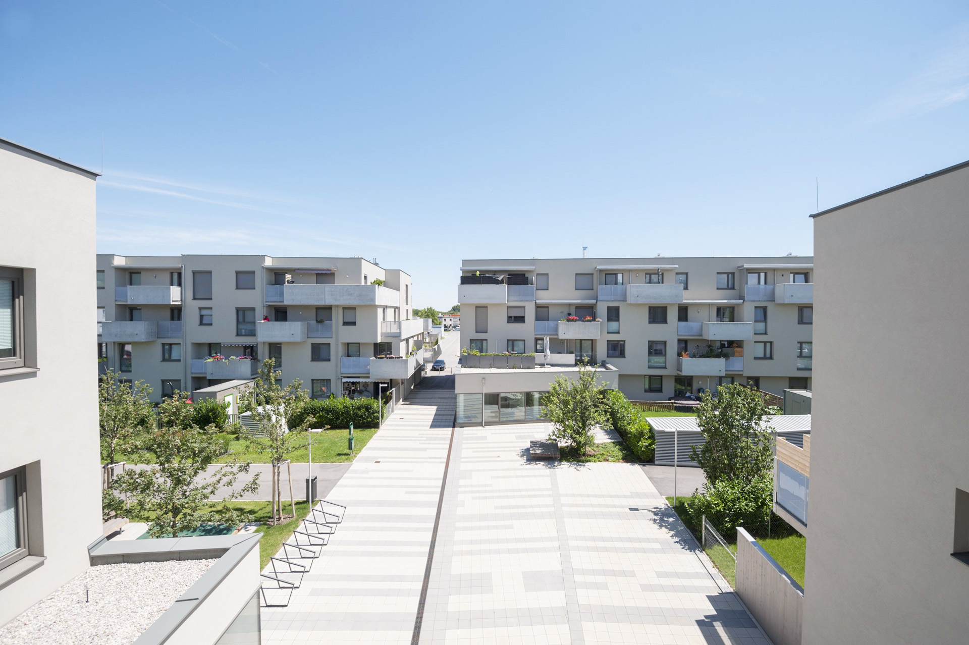 Die Erschließung aller Bauteile erfolgt über je einen zentral gesetzten Gebäudezugang mit Treppenhaus und Aufzug sowie mittig liegenden Innengängen, die zweihüftig die einzelnen Wohneinheiten erschließen. Dies ermöglicht kompakte und wirtschaftliche Gebäudetrakttiefen bei guter Belichtung und Besonnung der Aufenthaltsräume. Zur Steigerung der Freiraumqualitäten wurde die Erdgeschoßzone vom ruhenden Verkehr komplett freigespielt. Dafür wurden die vorgeschriebenen Pflichtstellplätze (2 pro WE) in einer eingeschossigen Tiefgarage unter Niveau angeordnet. Die unterschiedliche Positionierung der Balkone und Loggien, sowie der Fassade verhindern den Eindruck der Monotonie der länglichen, verschiedenen Baukörper. Bei den von der „Stadtseite“ Bründlfeldweg weiter weg befindlichen Bauteilen 3 und 4 wurde das vierte Obergeschoß teilweise zurückgesetzt, um so auf die vorgefundene städtebauliche Abstufung von urban zu ländlich zu reagieren und eine bessere Besonnung der Innenhöfe zu ermöglichen.