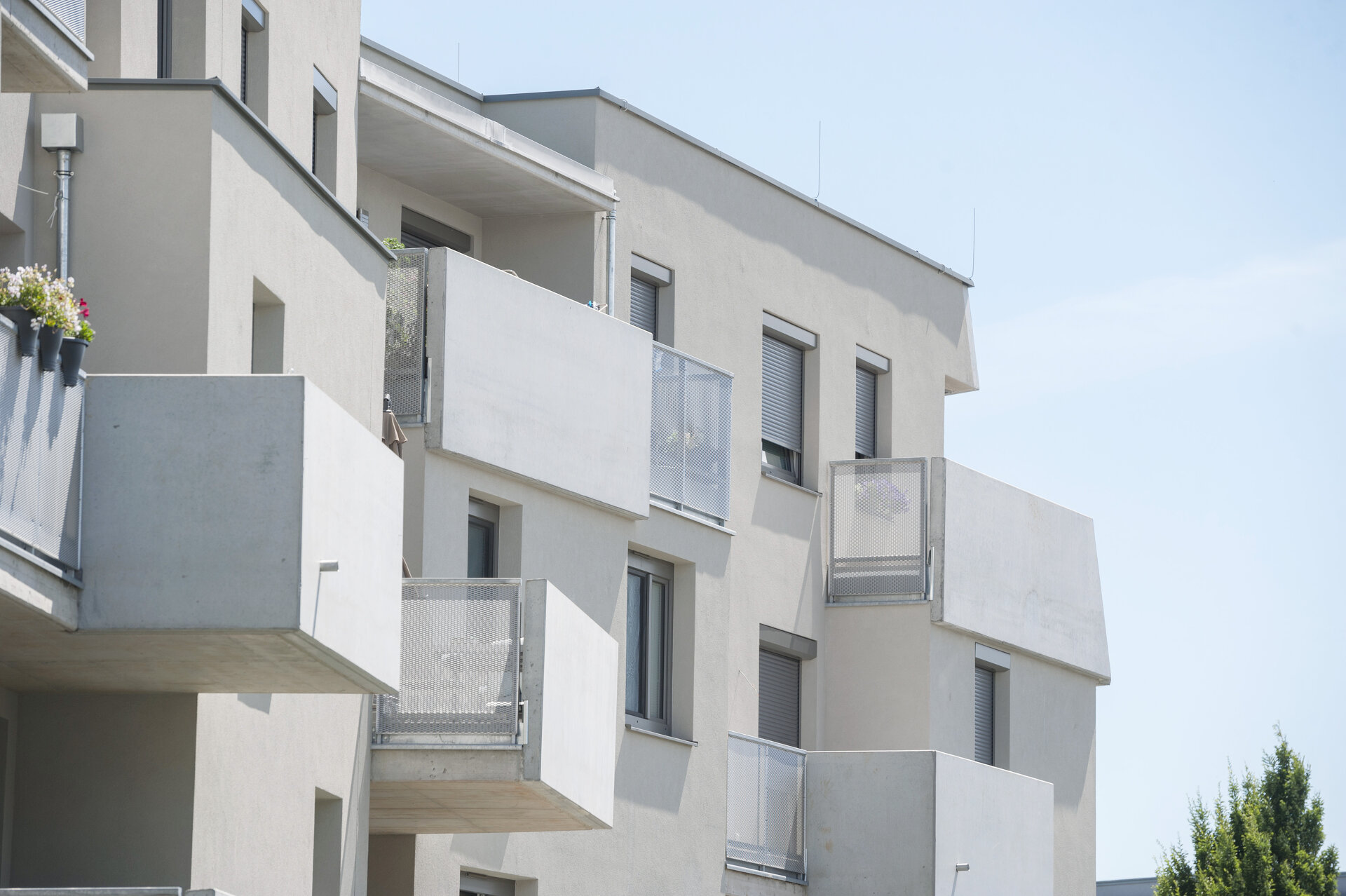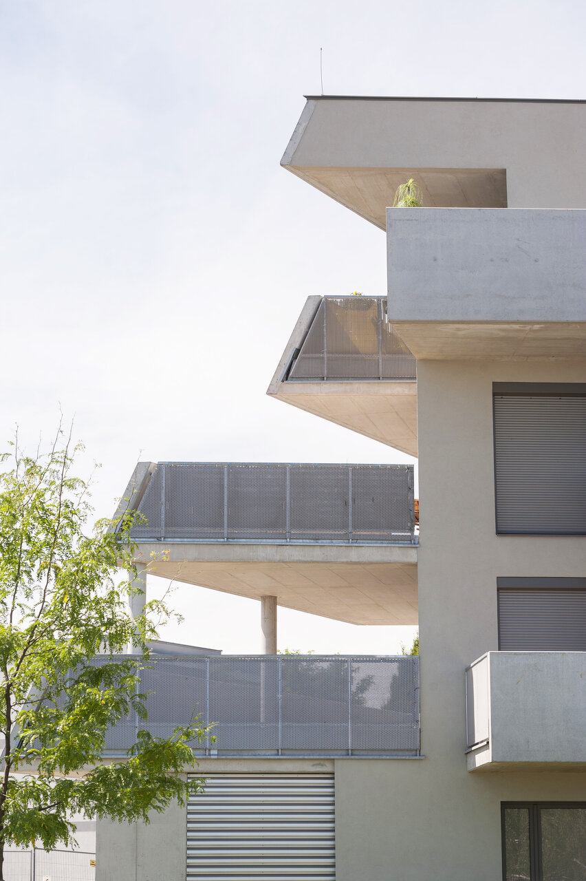 Zur niedrigeren und kleinteiligeren Bebauung in Richtung Süden vermitteln die einzelnen Bauteile durch abgeschrägte Balkonbrüstungen an der Stirnseite, die dem Wohnbau einen hohen Wiedererkennungswert mit spannungsvollen räumlichen Qualitäten verleihen. (Text: Architekten)
