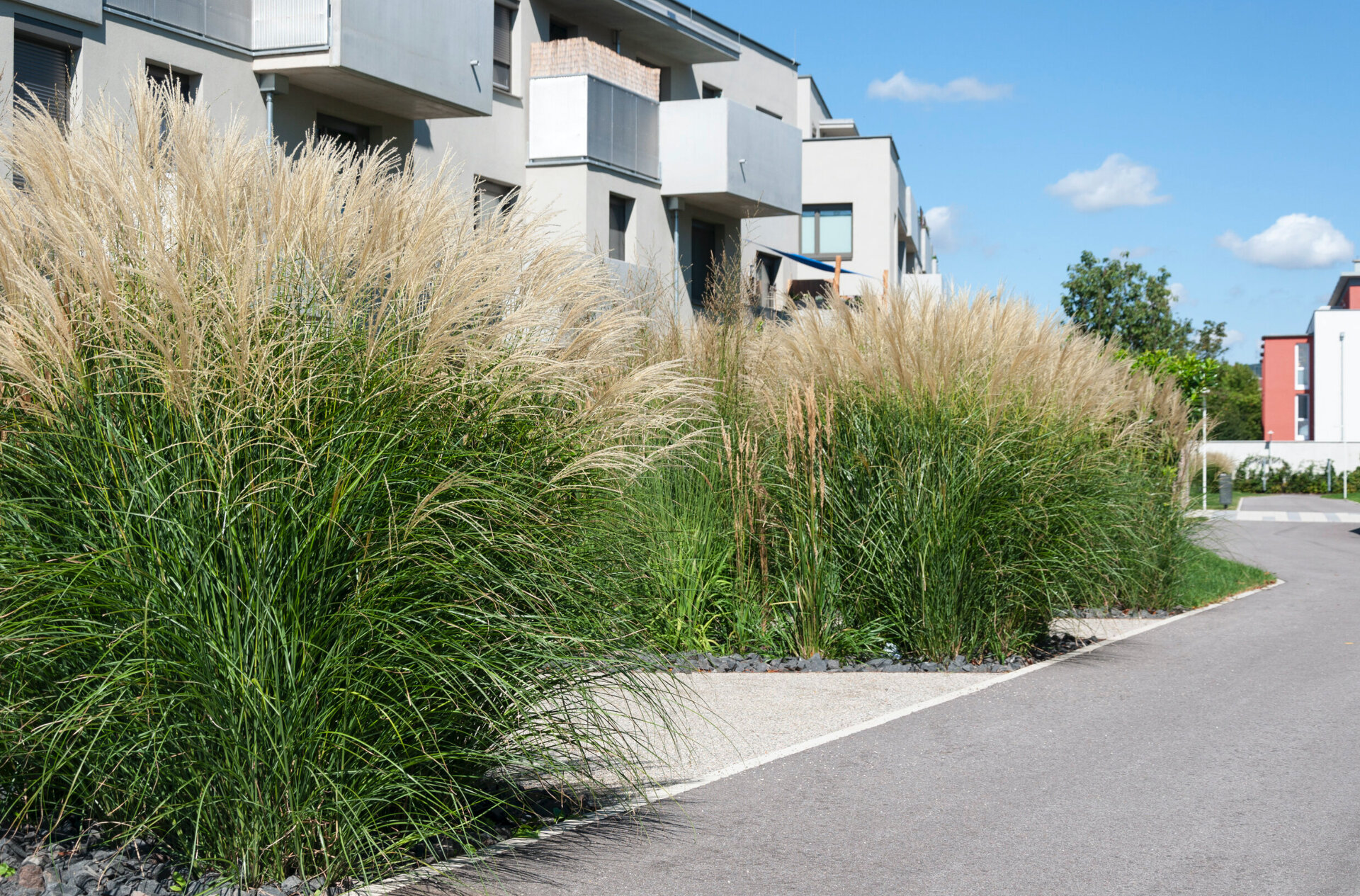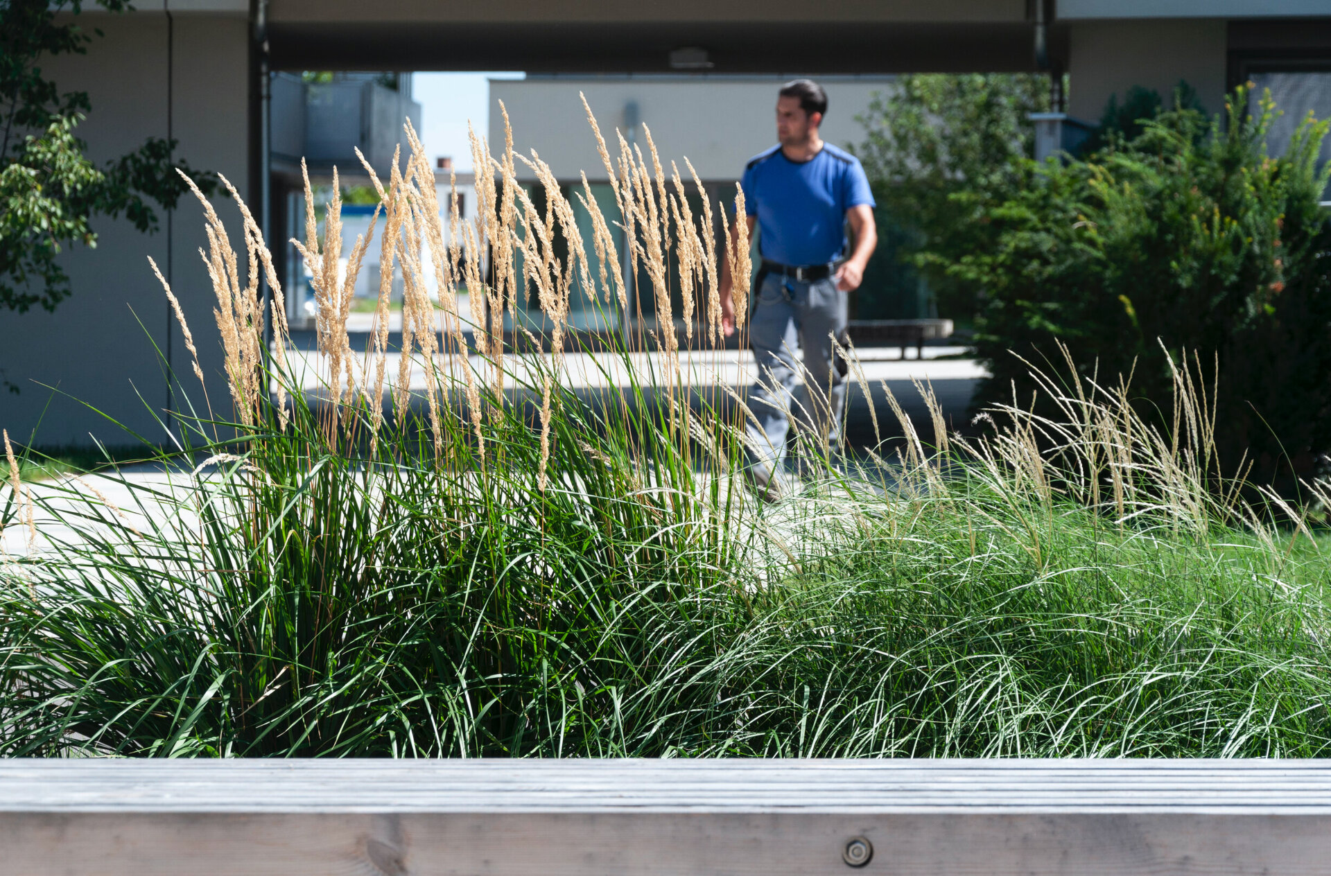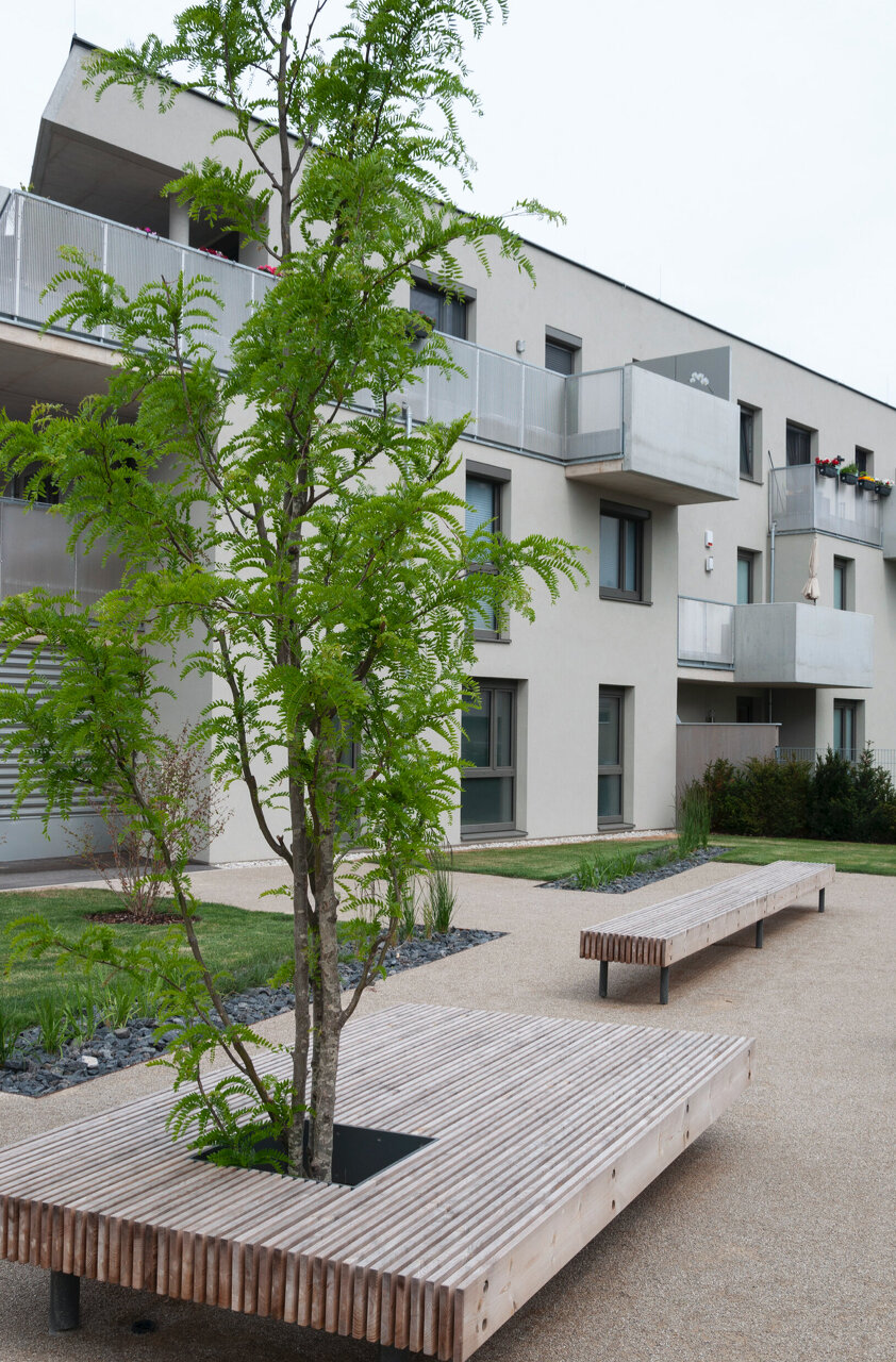 Bepflanzung: Lederhülsenbaum (Gleditsia triacanthos), Blasenbaum (Koelreuteria paniculata), Zier-Feldahorn (Acer campestre „Red shine“), Frühlingskirsche (Prunus subhirtella „Pandora“), Kupfer-Felsenbirne (Amelanchier lamarckii), Sommerschneeball (Viburnum plicata var. tomentosum, Kirschlorbeerhecke (Prunus laurocerasus) (Text: Landschaftsarchitekt)