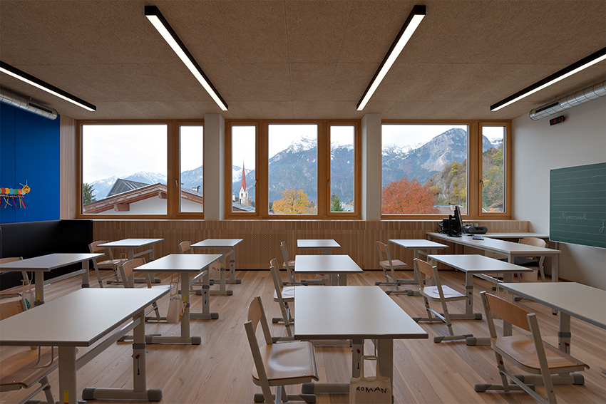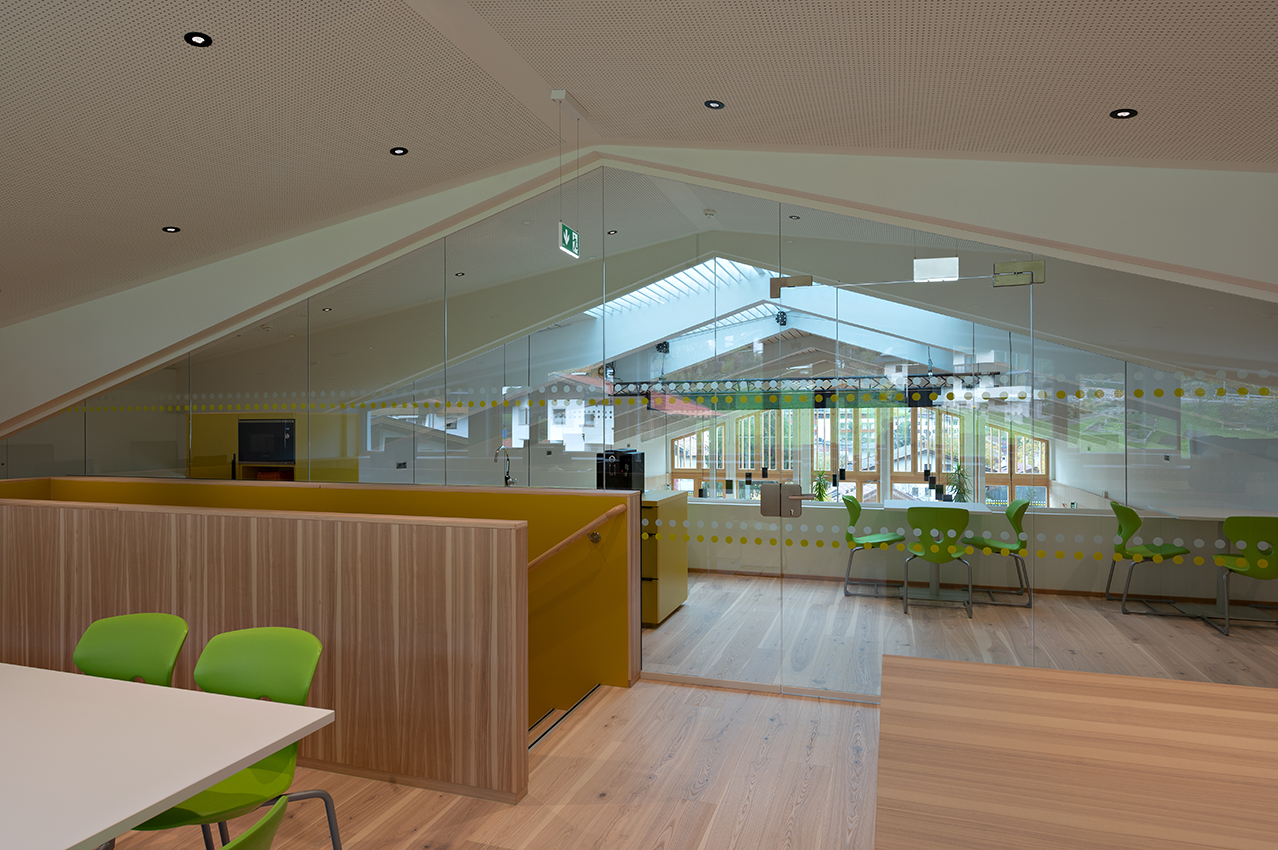 In den rein schulintern genutzten Flächen im Erd- und Obergeschoß, die über mobile Schiebeelemente komplett abgetrennt werden können, wurde die grundsätzliche räumliche Konfiguration mit jeweils 4 Klassenräumen beidseitig der Aula beibehalten. Im Süden wurde jeweils eine nicht wirklich genutzte Terrasse in den Baukörper integriert und in eine flexibel nutzbare Zone für das Arbeiten in Kleingruppen verwandelt. Die Räume für Verwaltung und Lehrpersonal wurden im Norden zusammengefasst, der im 2. Obergeschoß liegende Arbeits- und Sozialraum wurde vergrößert und durch eine neue interne Treppe besser erschlossen.