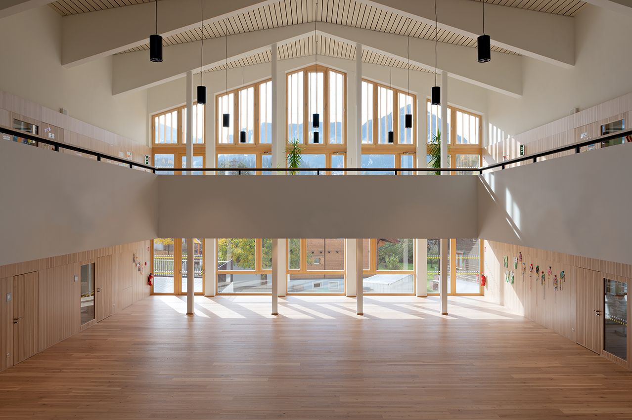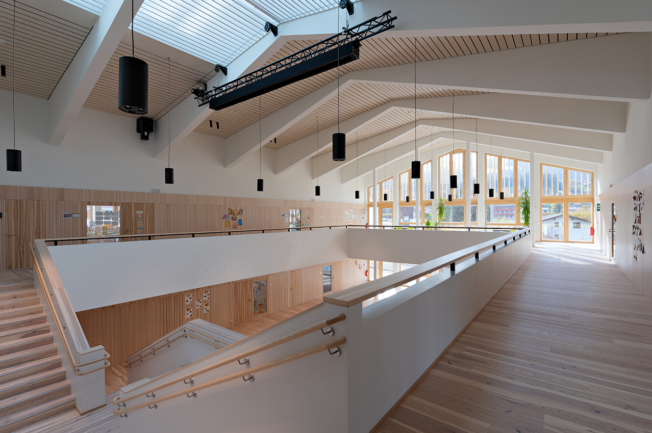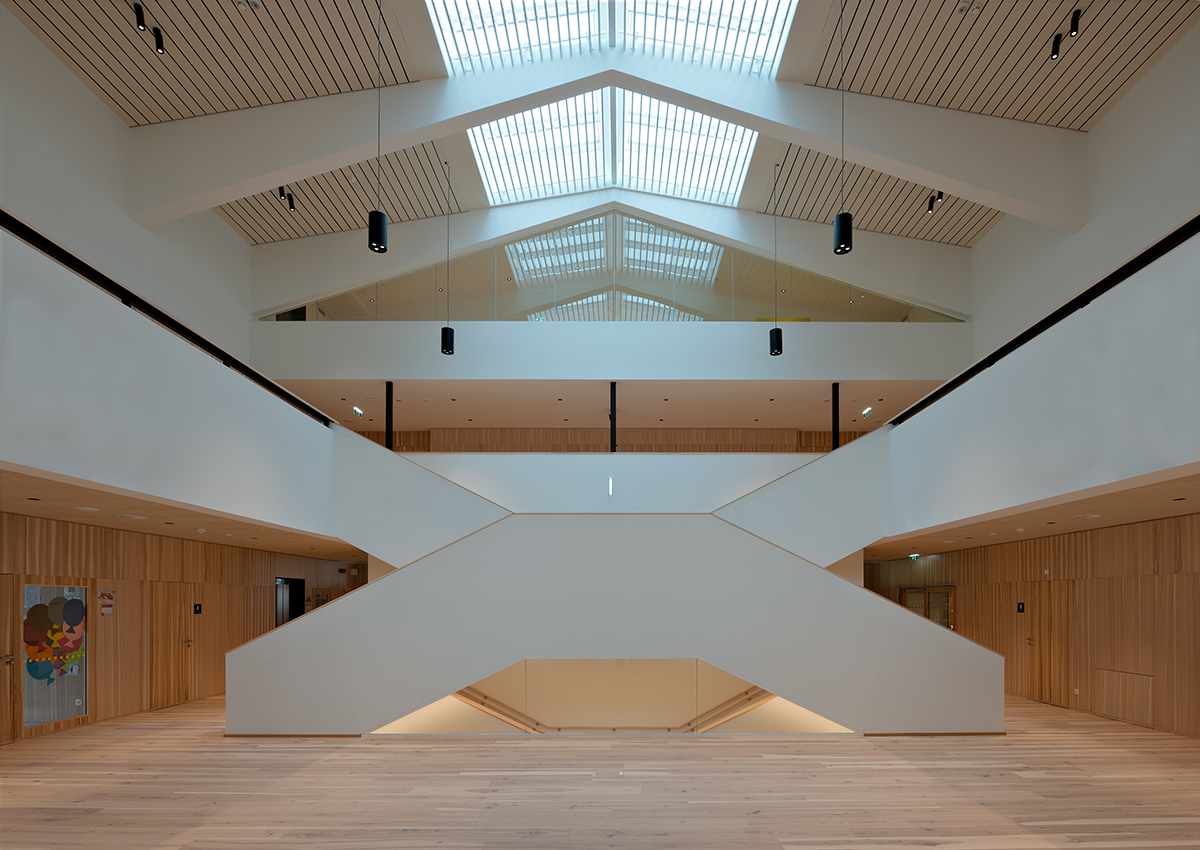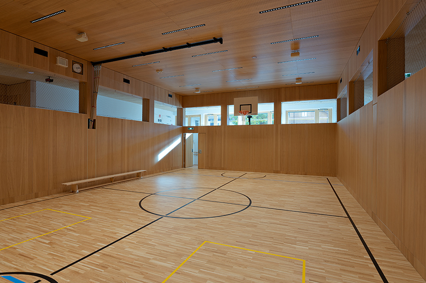 Von diesem neuen Eingangsbereich aus werden die Klassenräume, Aula, Bibliothek und Verwaltung über die bestehende Treppe und den neuen, alle Geschoße barrierefrei verbindenden Aufzug erschlossen. Das Untergeschoß, das aufgrund der Topographie zum Teil ebenerdig ist, wurde komplett umstrukturiert. Über den neukonzipierten Nebeneingang im Süden werden die weiteren, außerschulisch genutzte Flächen im Untergeschoß erschlossen. Anstelle von Bibliothek, Zentralgarderobe und eines nicht mehr genutzten Schwimmbads wurden zum einen entlang der Nordseite ein Werk- und ein Kreativraum geschaffen, die dadurch mit natürlichem Licht versorgt werden, dass eine kleine Garage abgetragen und durch einen Lichthof ersetzt wurde. Zum anderen wurde ein von oben belichteter Turnsaal mit angrenzenden Tribünen unter die Aula geschoben. Dafür musste der Boden zum Teil abgesenkt und die Decke adaptiert werden, die bestehende Haupttragekonstruktion konnte allerdings bestehen bleiben. Ebenfalls komplett neu organisiert wurde der ebenerdig liegende Bereich für die Nachmittagsbetreuung, der separat vom Westen aus erschlossen ist.