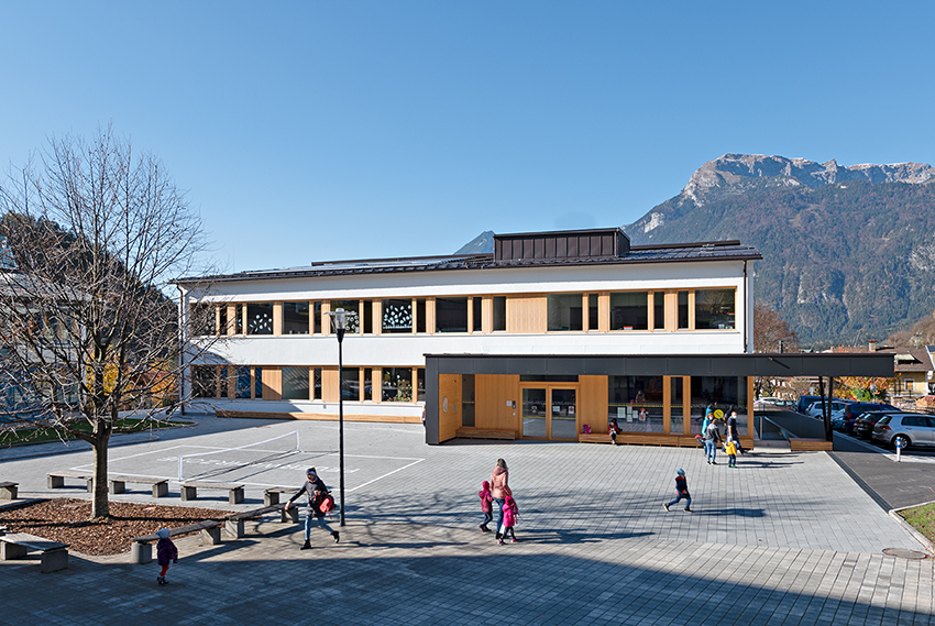 Das dafür von Raimund Wulz und Todorka Iliova entwickelte und von der Architekturhalle Wulz-König realisierte Konzept geht behutsam mit dem Bestand um und führt durch gezielt gesetzte Eingriffe zu einer wesentlichen funktionalen und räumlichen Aufwertung des Schulgebäudes. Die entscheidendste Veränderung bestand darin, den Haupteingang vom Norden und damit von der Straßenseite in den Osten zu verlegen. In dem die dort vorher situierten Parkplätze verlagert wurden konnte ein großzügiger Freibereich entstehen, der den umliegenden Bildungseinrichtungen als gemeinsamer Pausenhof dient. Ein auskragendes Vordach markiert den neuen Eingang und bietet den Schüler:innen einen geschützten Eingangsbereich, der weiter zu den Garderoben, in die Aula und zur Bibliothek führt – einem zusammenhängenden Bereich, in dem auch Veranstaltungen stattfinden können.