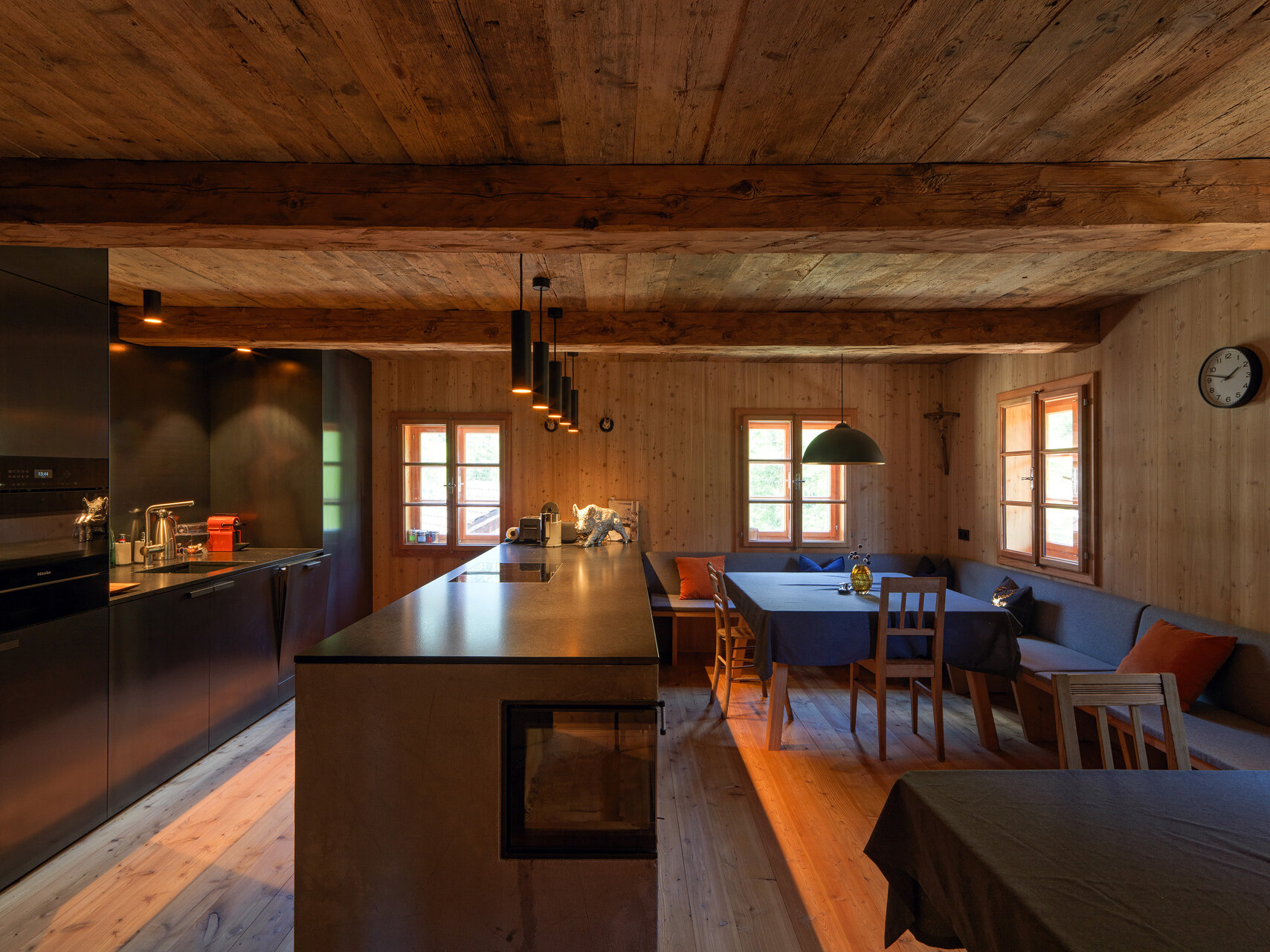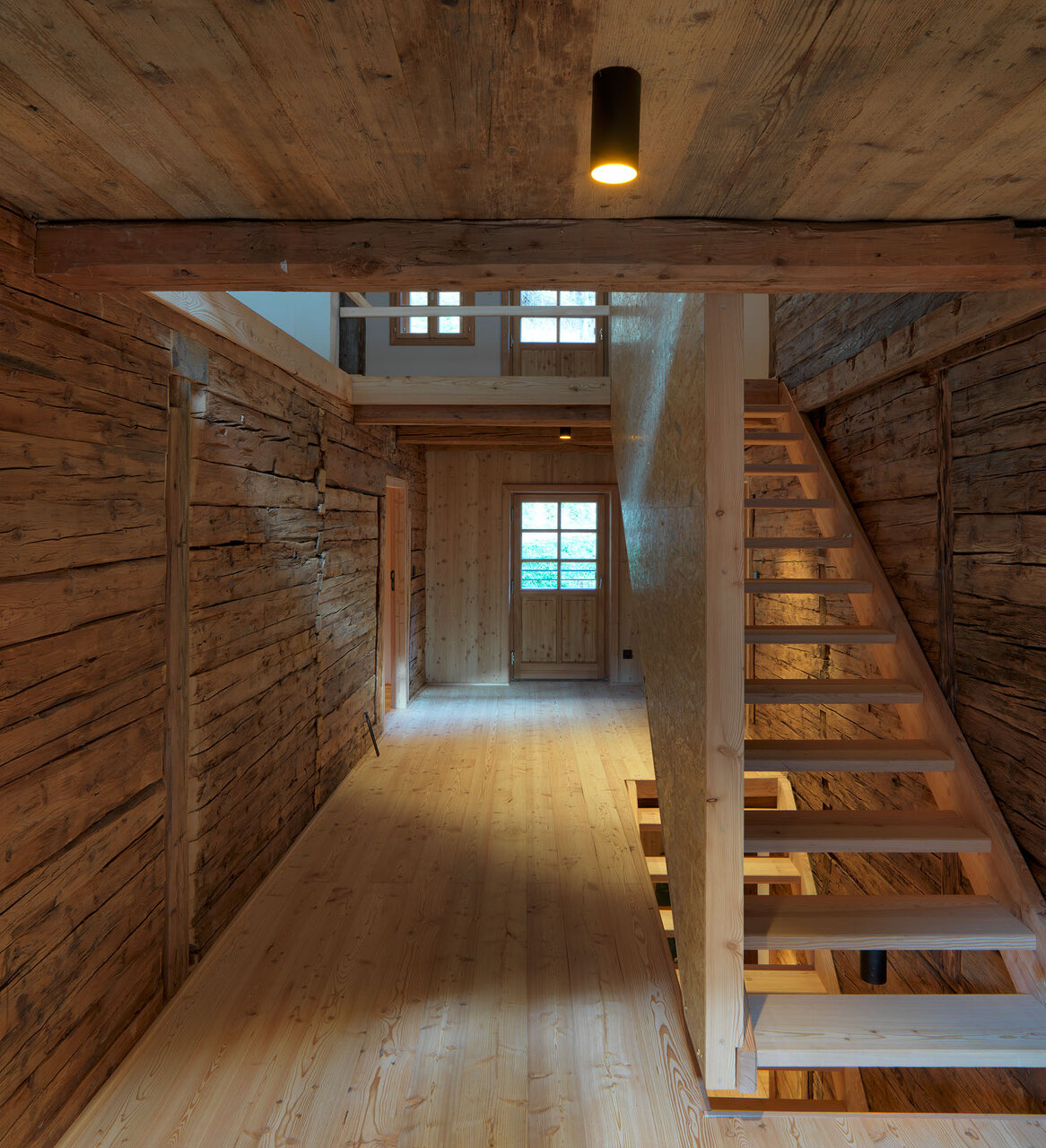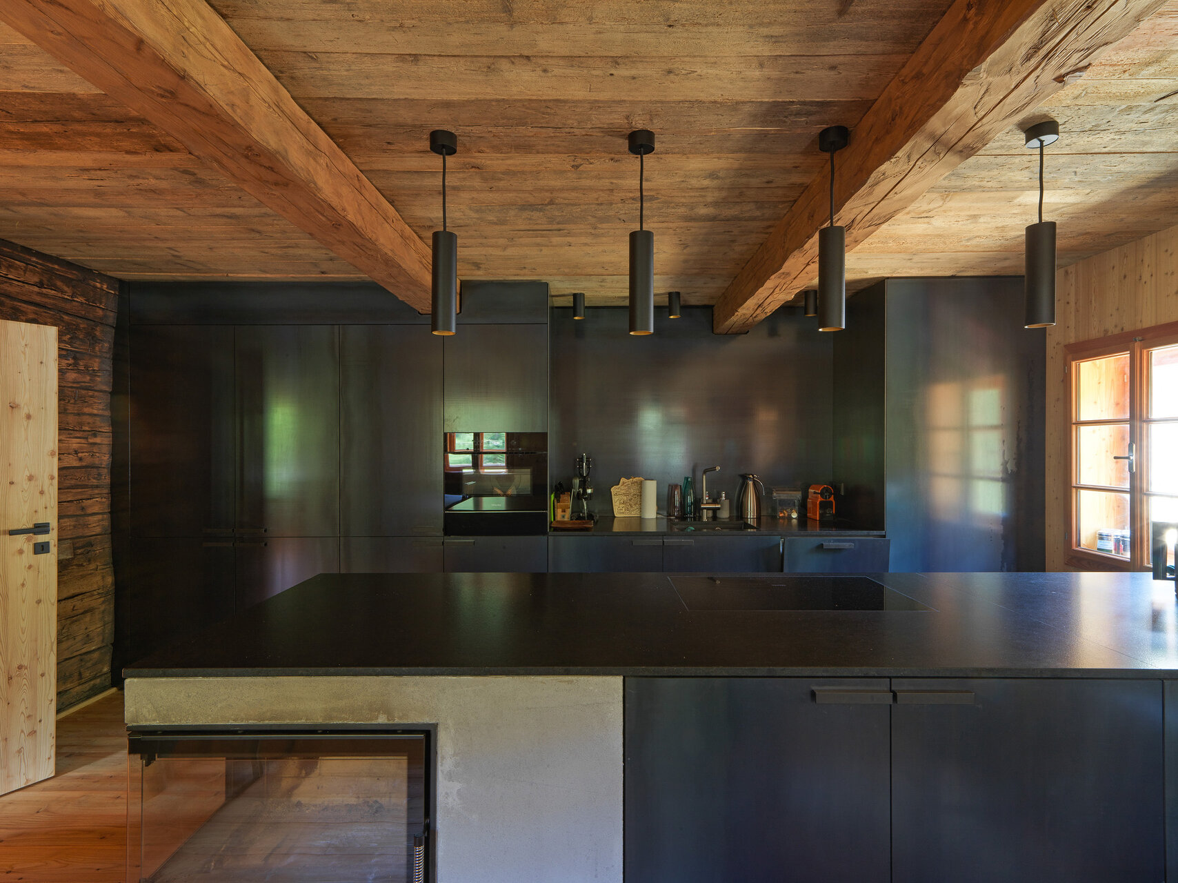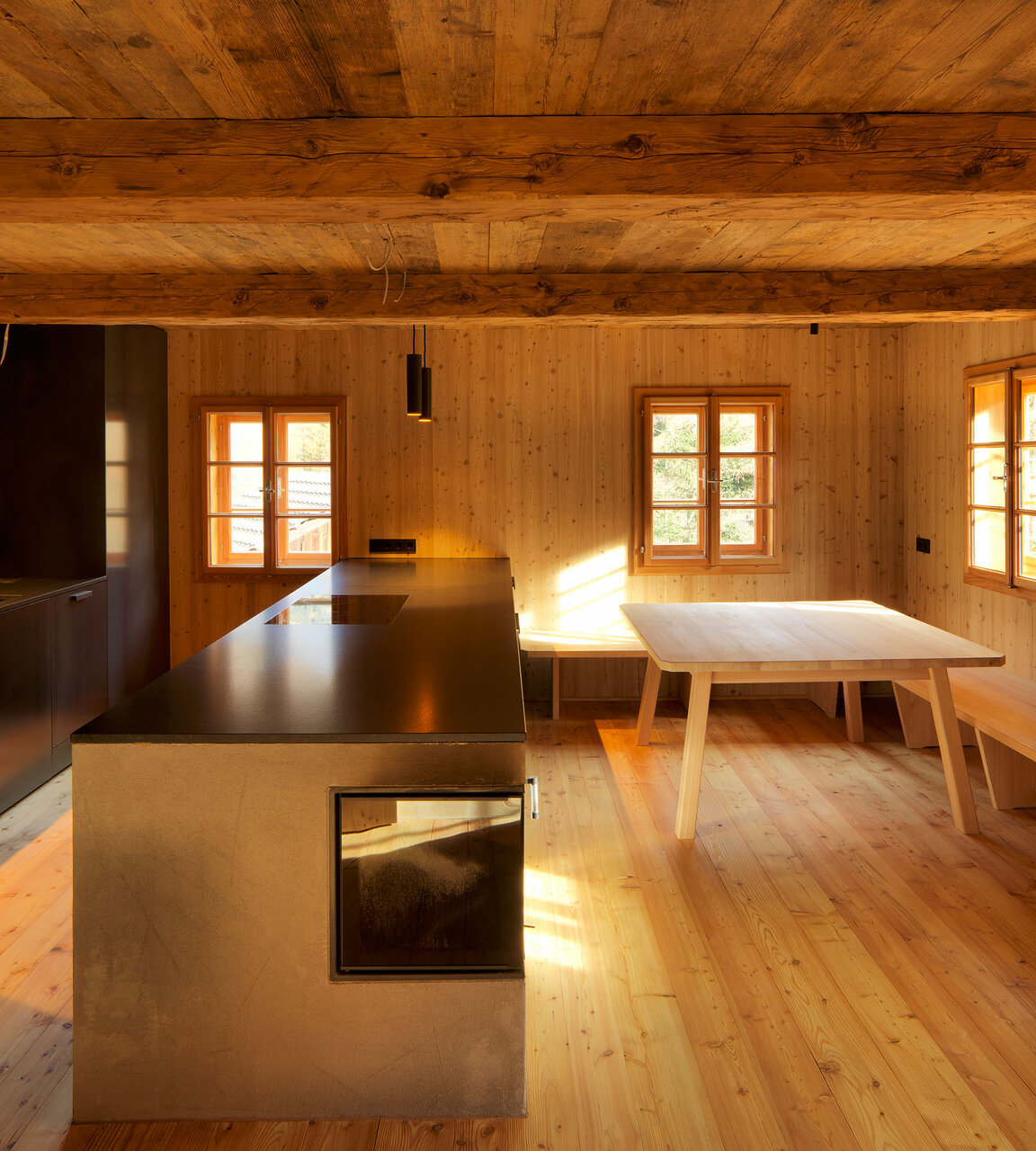 Im Dachgeschoß wurde eine offene Büroebene geschaffen, die viel Licht über die südseitig komplett verglaste Giebelwand erhält. Die Decke zwischen Dach- und Obergeschoß wurde im Bereich des Mittelgangs wurde aufgebrochen, womit ein zweigeschoßiger Luftraum entstand, der räumliche Großzügigkeit in das eher kleinteilig strukturierte Bauernhaus bringt. Das Innere wurde weitgehend im Originalzustand belassen, die Holzböden mussten allerdings komplett erneuert werden. Im Erdgeschoß entstand eine neue Küche mit einem Betonofen, dort wurde genauso wie bei anderen Eingriffen auf Schwarzstahl zurückgegriffen. (Text: Claudia Wedekind)