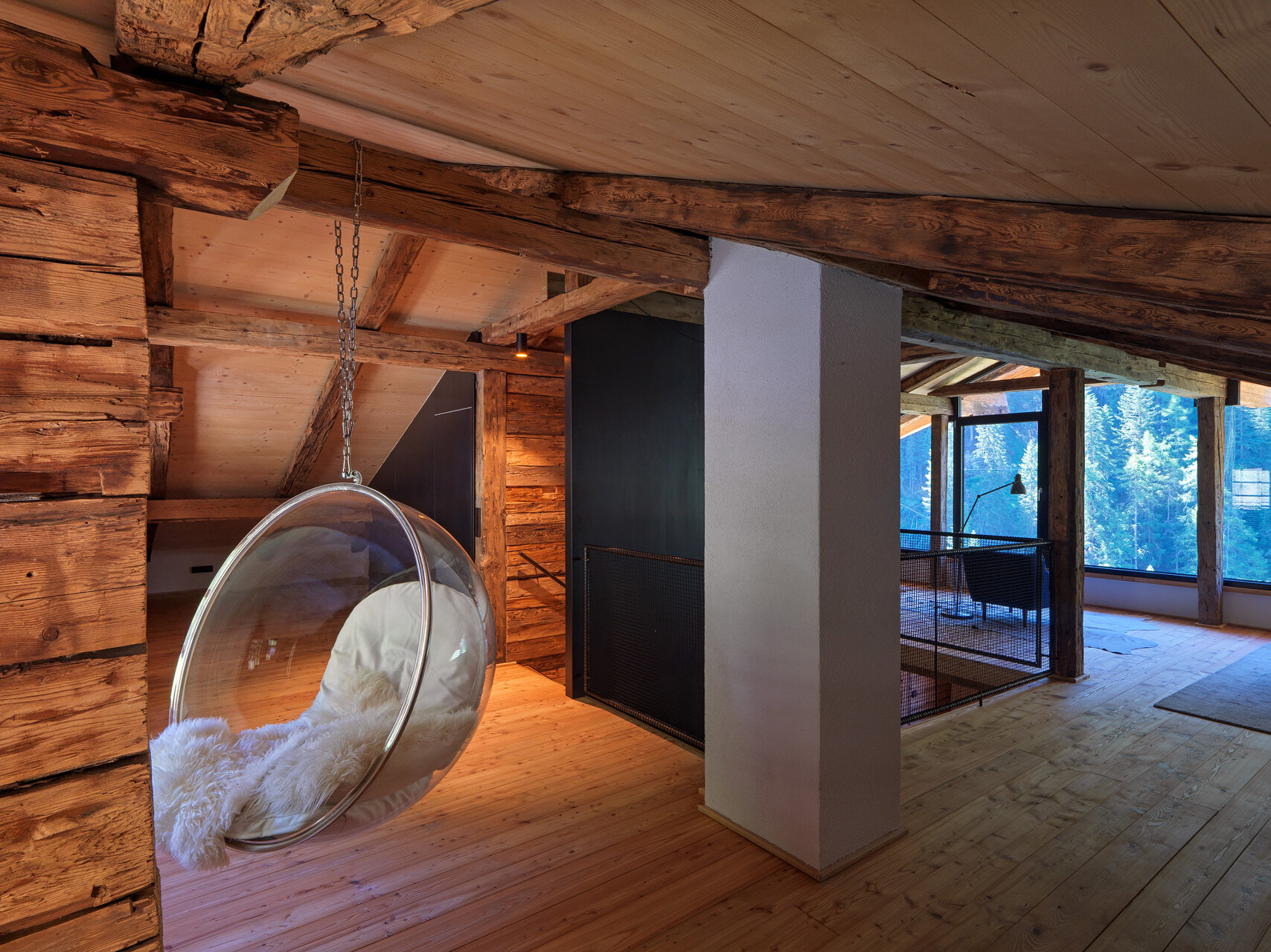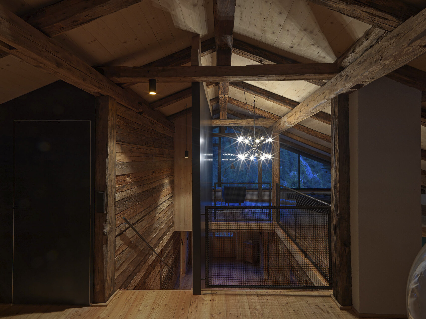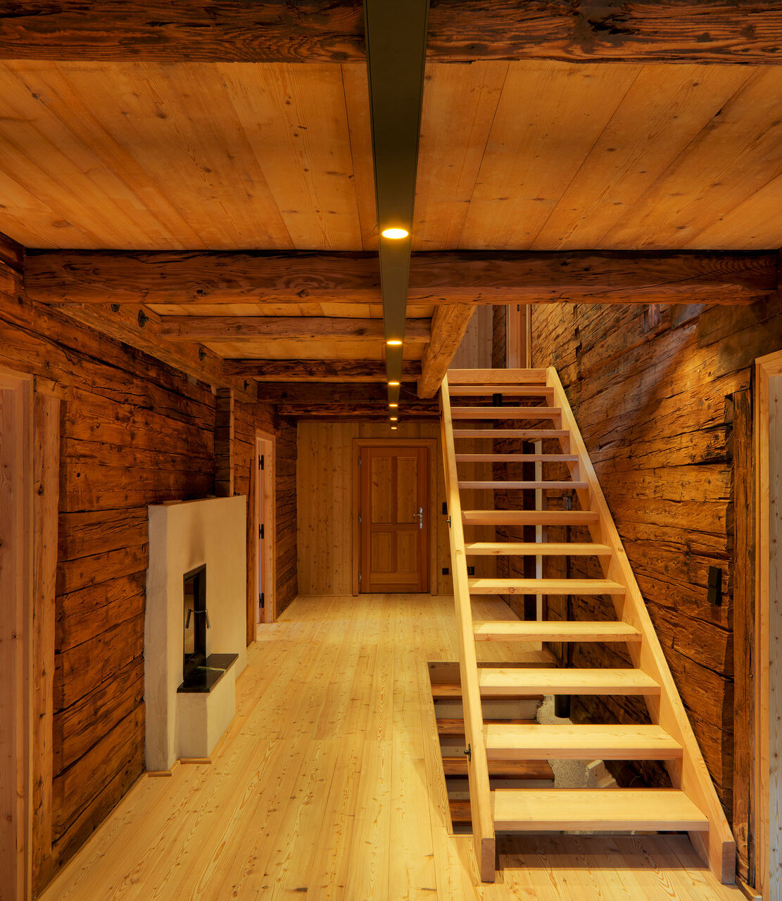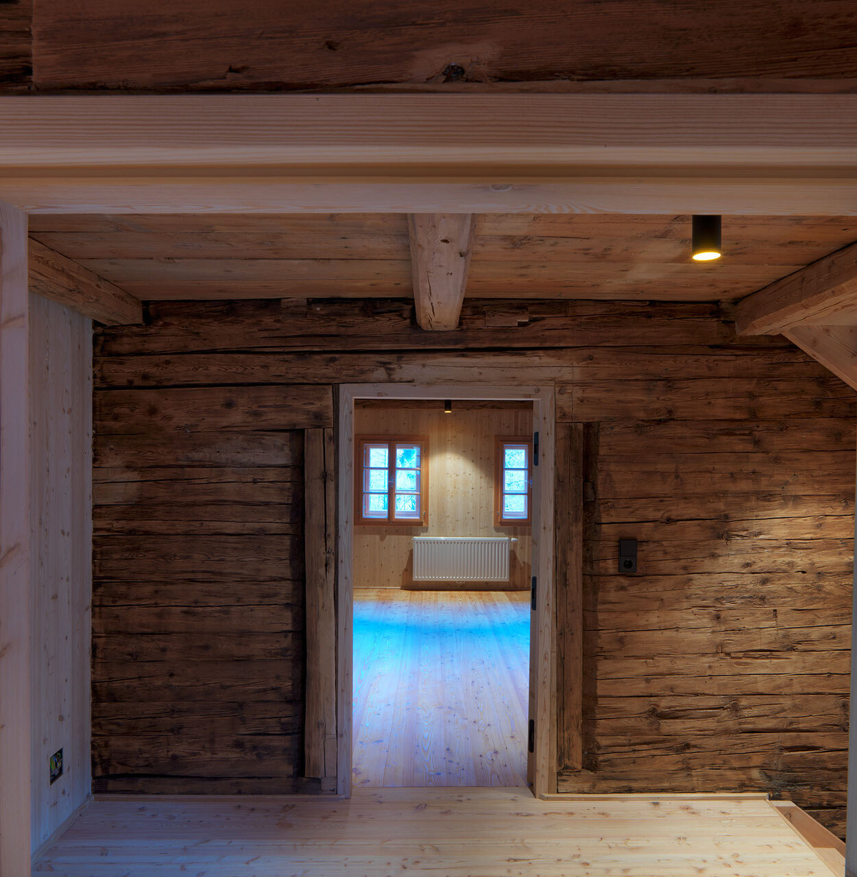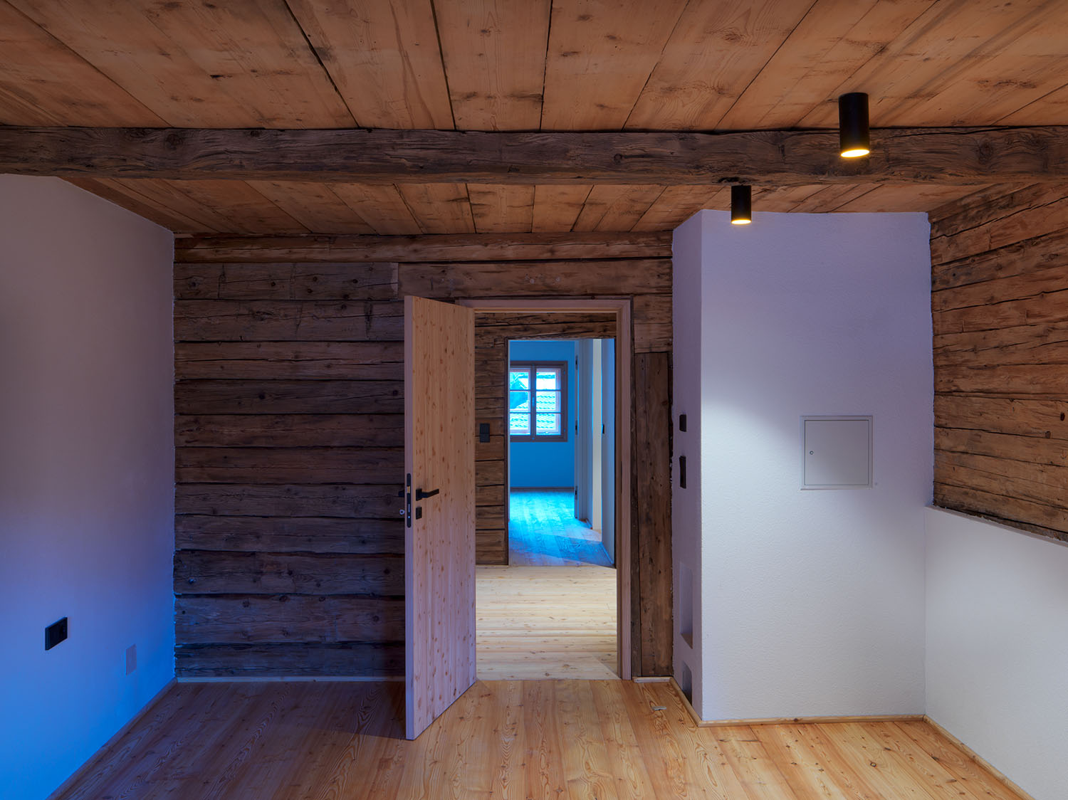 Im Dachgeschoß wurde eine offene Büroebene geschaffen, die viel Licht über die südseitig komplett verglaste Giebelwand erhält. Die Decke zwischen Dach- und Obergeschoß wurde im Bereich des Mittelgangs wurde aufgebrochen, womit ein zweigeschoßiger Luftraum entstand, der räumliche Großzügigkeit in das eher kleinteilig strukturierte Bauernhaus bringt. Das Innere wurde weitgehend im Originalzustand belassen, die Holzböden mussten allerdings komplett erneuert werden. Im Erdgeschoß entstand eine neue Küche mit einem Betonofen, dort wurde genauso wie bei anderen Eingriffen auf Schwarzstahl zurückgegriffen. (Text: Claudia Wedekind)