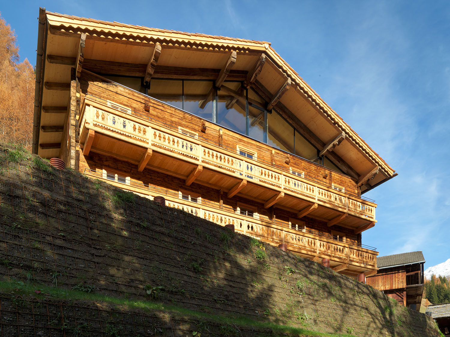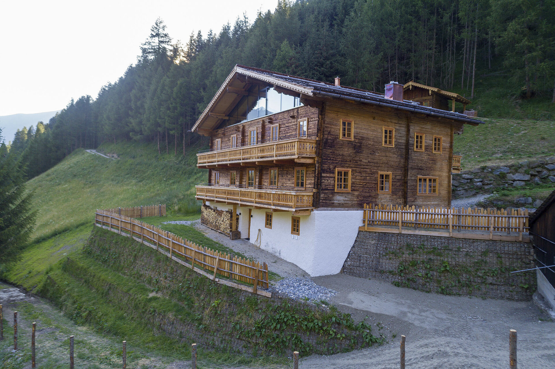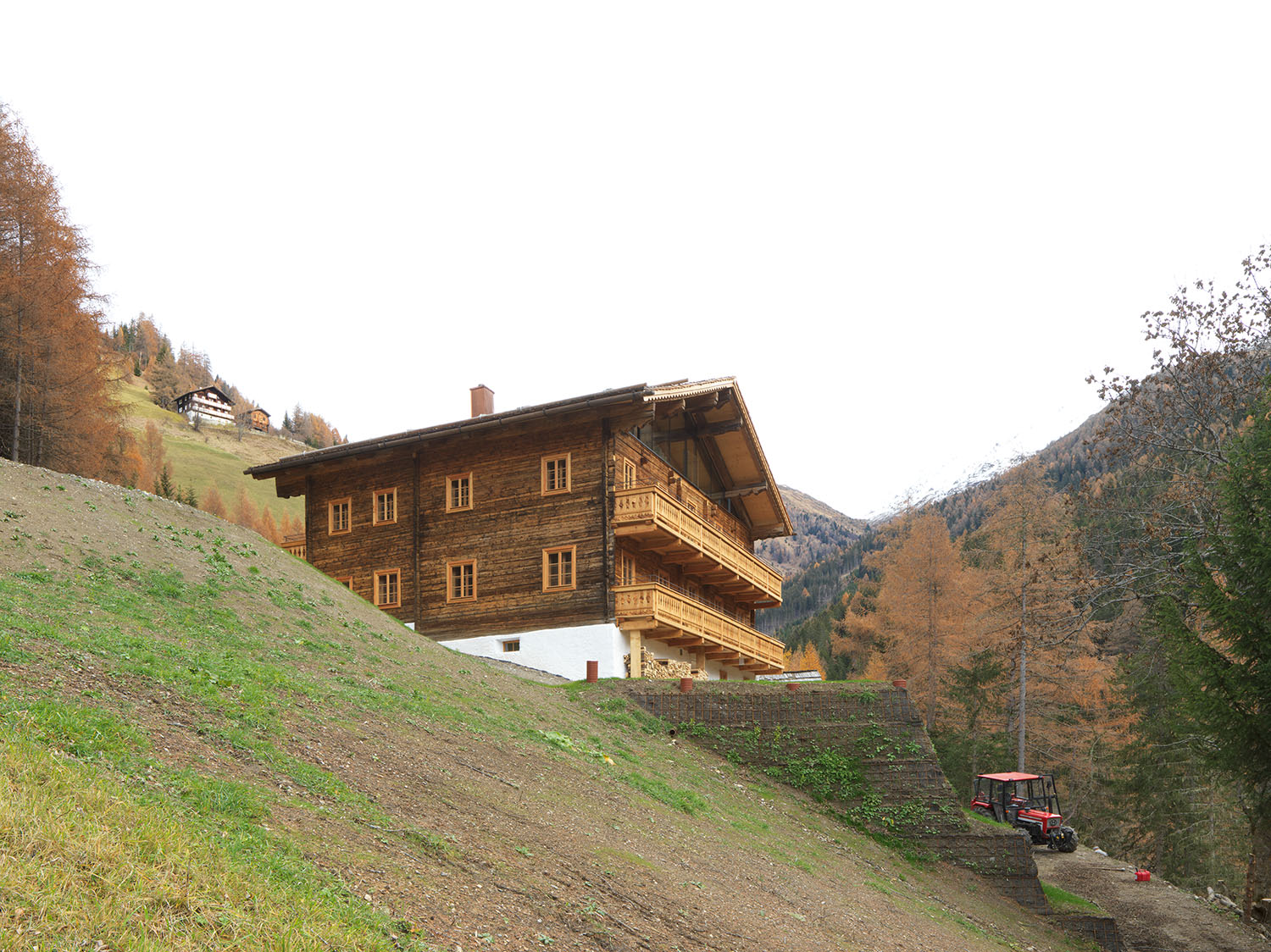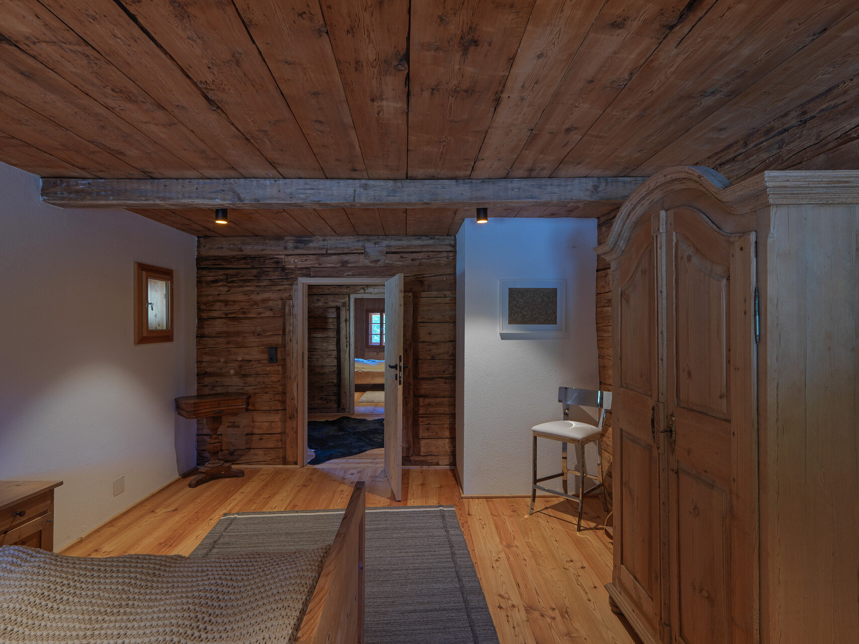 Im Dachgeschoß wurde eine offene Büroebene geschaffen, die viel Licht über die südseitig komplett verglaste Giebelwand erhält. Die Decke zwischen Dach- und Obergeschoß wurde im Bereich des Mittelgangs wurde aufgebrochen, womit ein zweigeschoßiger Luftraum entstand, der räumliche Großzügigkeit in das eher kleinteilig strukturierte Bauernhaus bringt. Das Innere wurde weitgehend im Originalzustand belassen, die Holzböden mussten allerdings komplett erneuert werden. Im Erdgeschoß entstand eine neue Küche mit einem Betonofen, dort wurde genauso wie bei anderen Eingriffen auf Schwarzstahl zurückgegriffen. (Text: Claudia Wedekind)