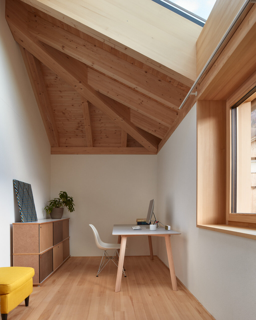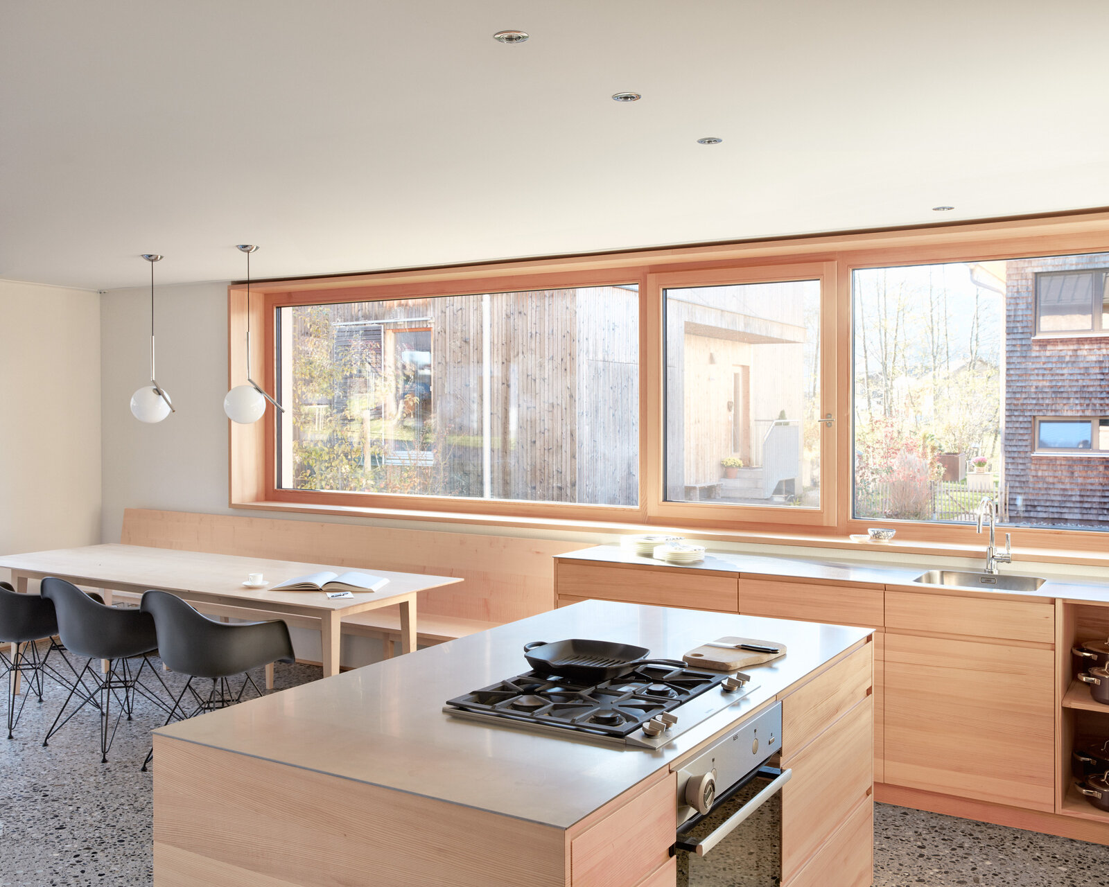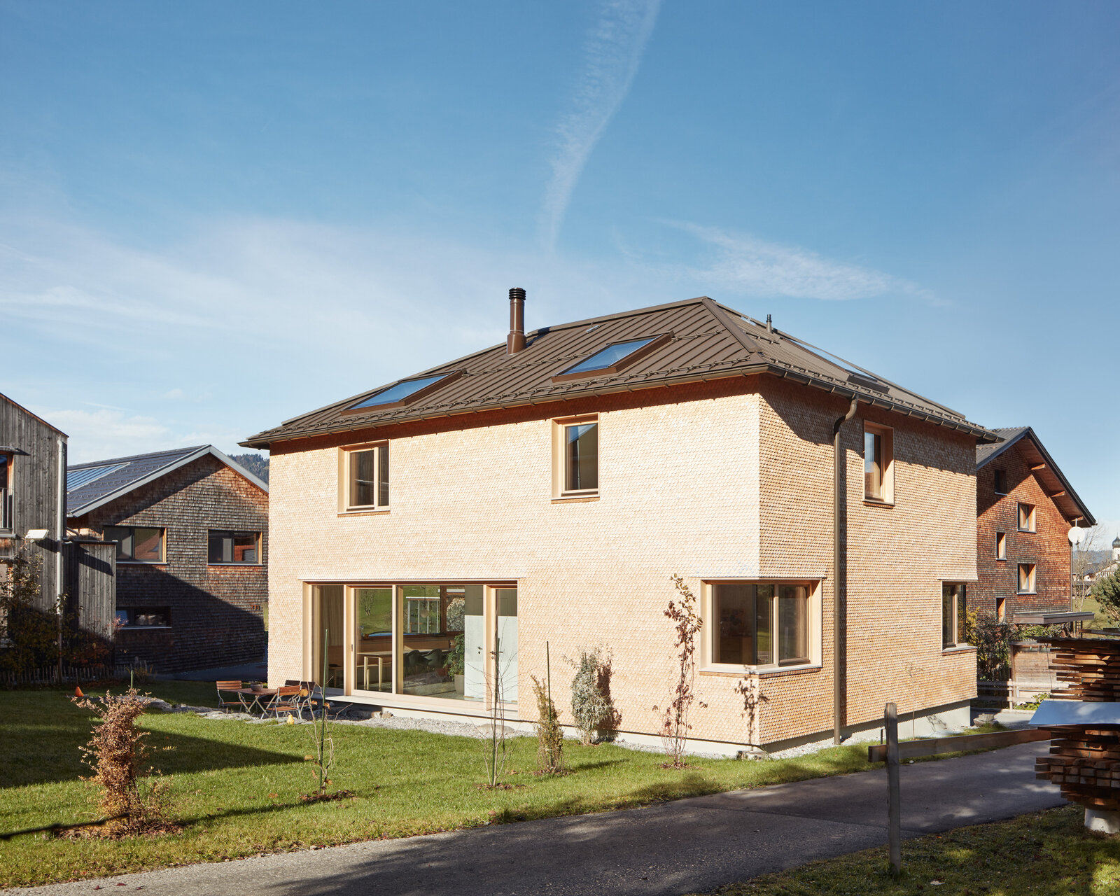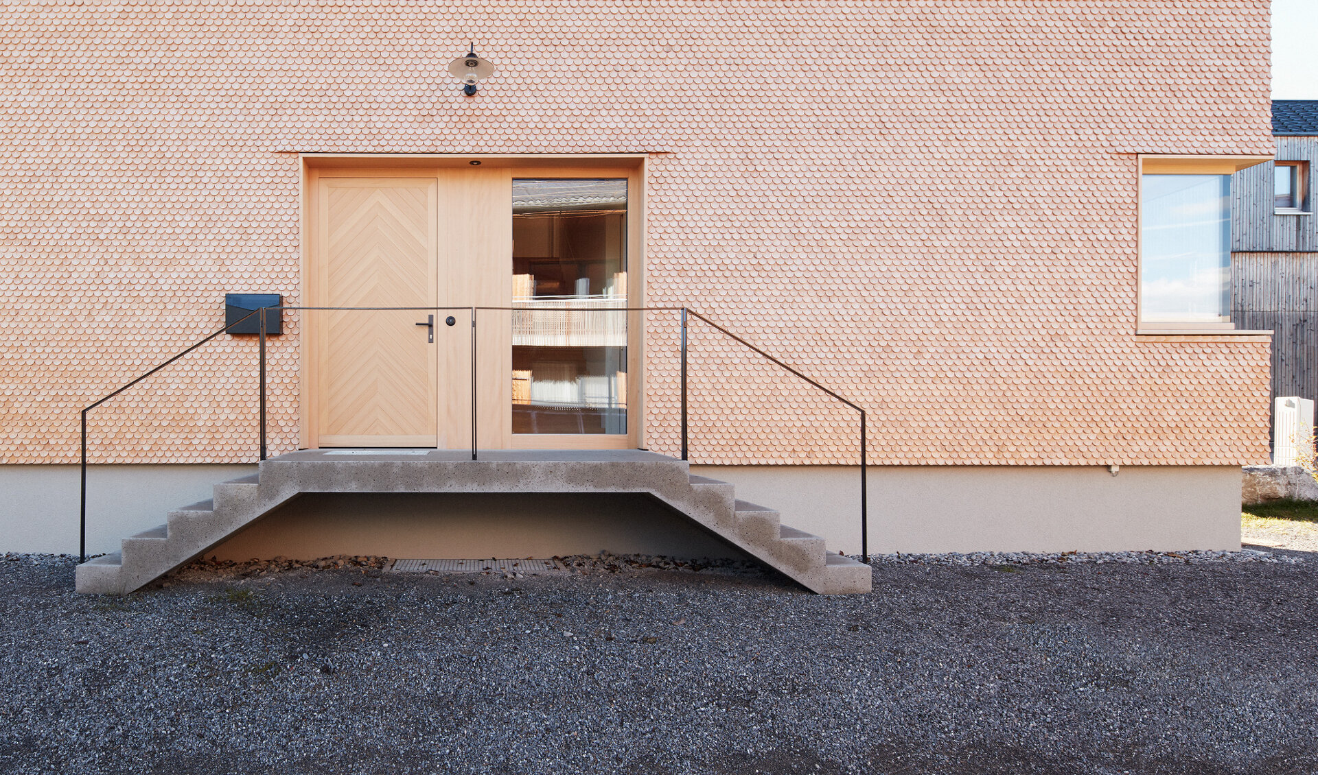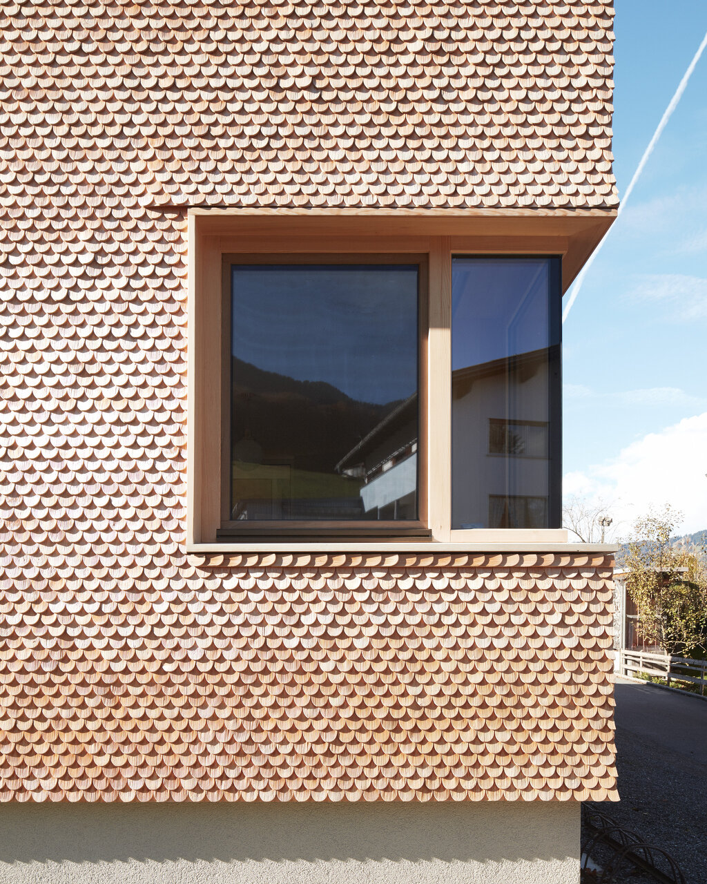 Mit Ausnahme der großen Öffnung in den Garten verzichteten die Architektinnen wegen der engen Nachbarschaftsbebauung auf raumhohe Verglasungen. Stattdessen weiten Über-Eck-Fenster die Perspektive in die Umgebung. Die Materialwahl ist vom Standort geprägt. Holz und einige typische Elemente der Bregenzerwälder Bautradition – wie z. B. die Fischgrät-Haustüre oder der „Wurf“ als konstruktiver Wetterschutz über den Fenstern – bestimmen das Erscheinungsbild des Hauses. (Text: Architektinnen, bearbeitet)