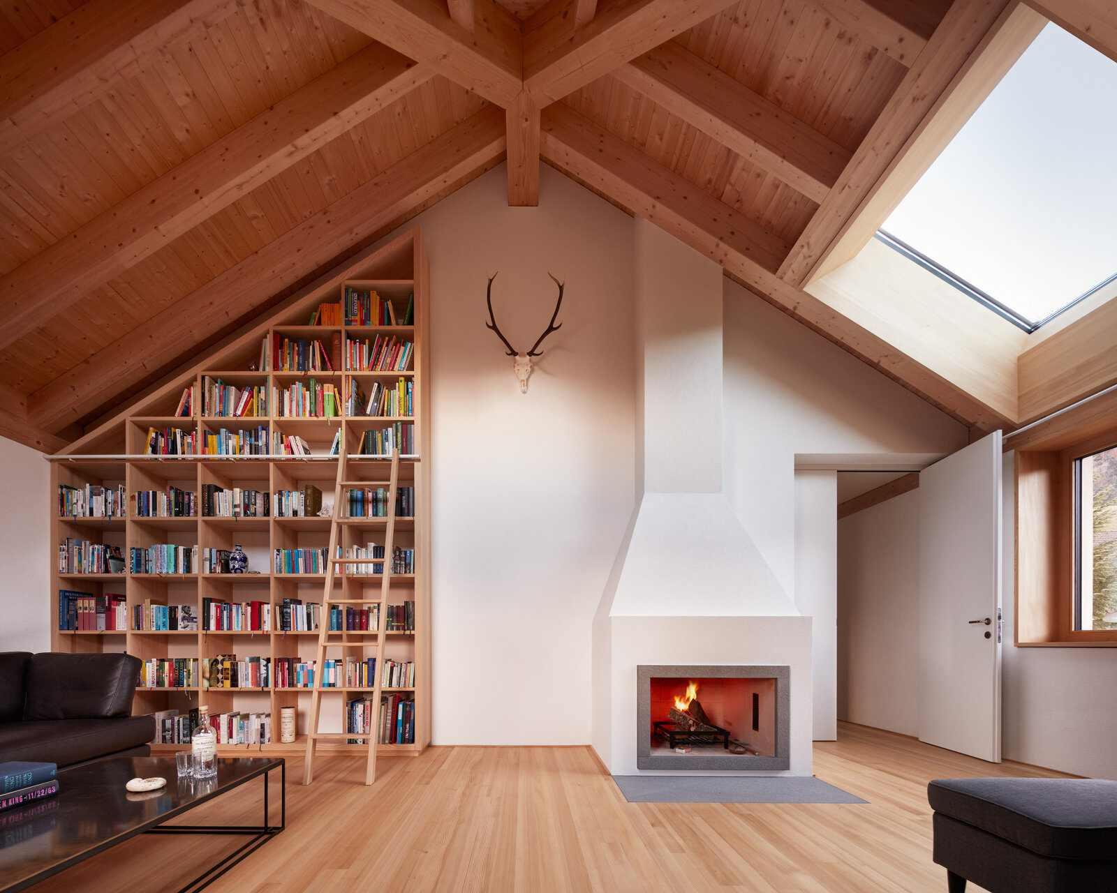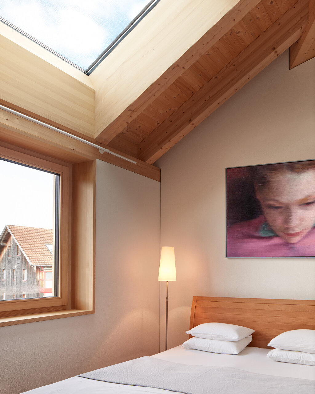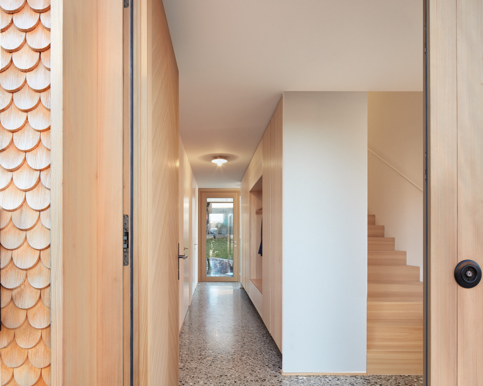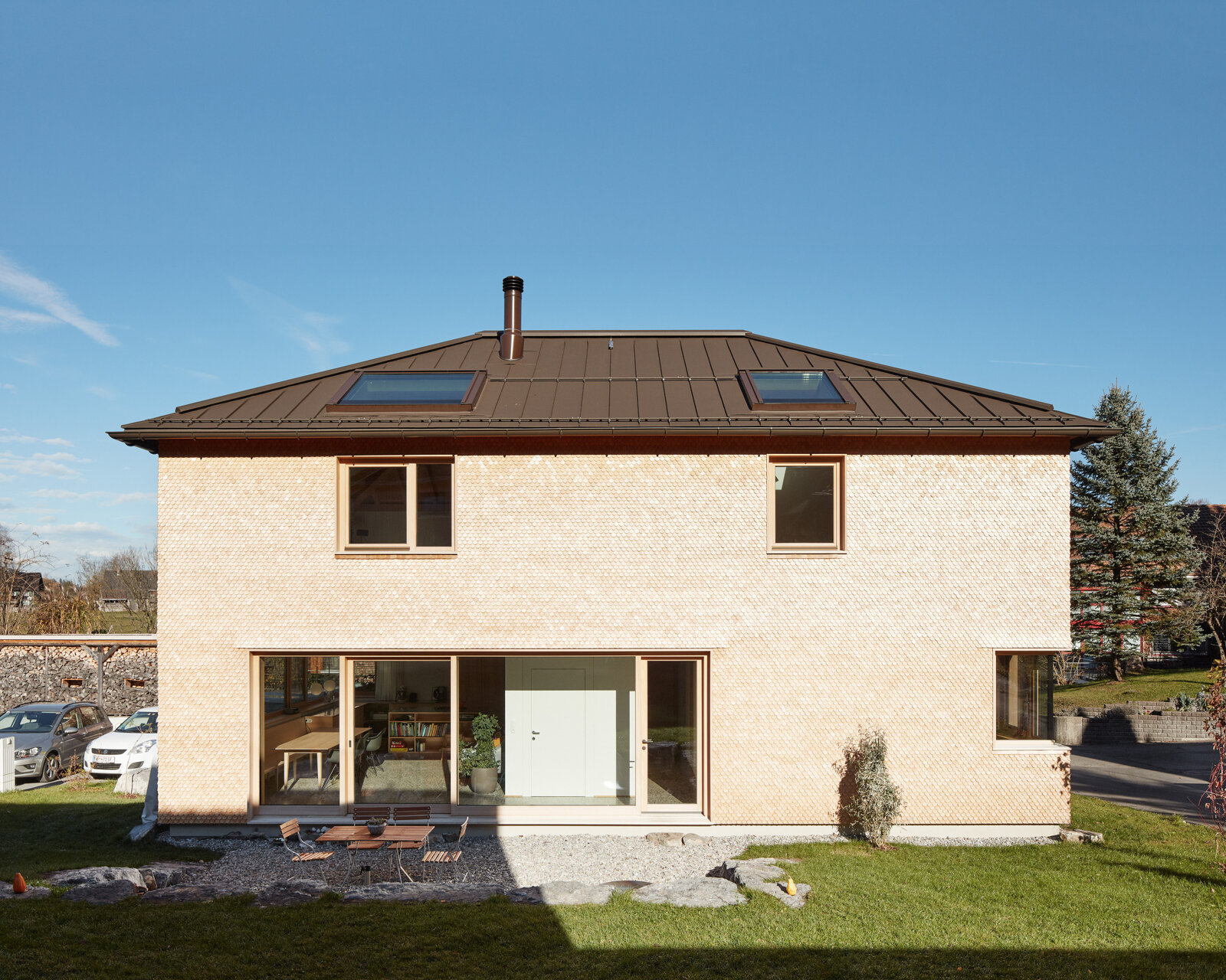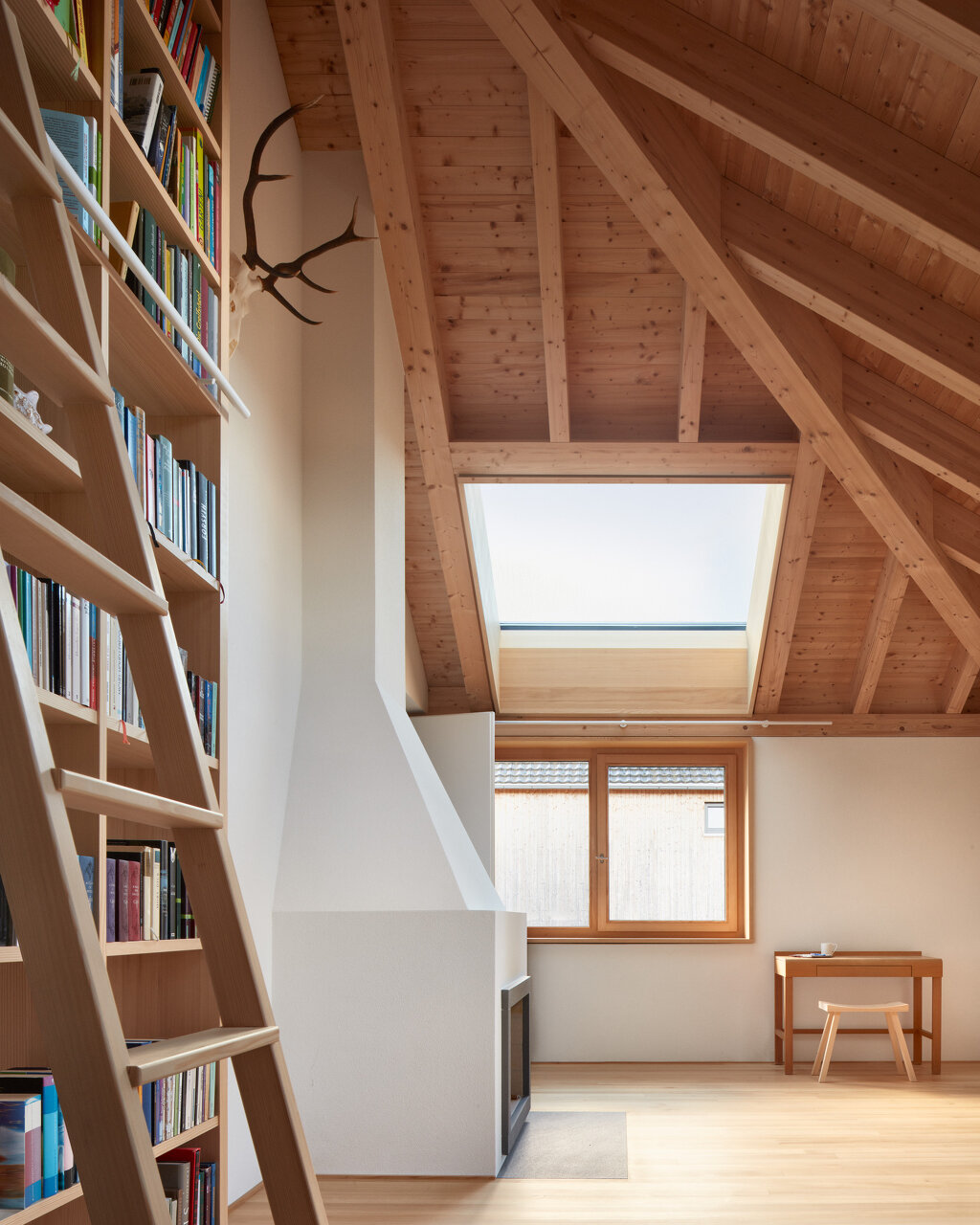 Mit Ausnahme der großen Öffnung in den Garten verzichteten die Architektinnen wegen der engen Nachbarschaftsbebauung auf raumhohe Verglasungen. Stattdessen weiten Über-Eck-Fenster die Perspektive in die Umgebung. Die Materialwahl ist vom Standort geprägt. Holz und einige typische Elemente der Bregenzerwälder Bautradition – wie z. B. die Fischgrät-Haustüre oder der „Wurf“ als konstruktiver Wetterschutz über den Fenstern – bestimmen das Erscheinungsbild des Hauses. (Text: Architektinnen, bearbeitet)