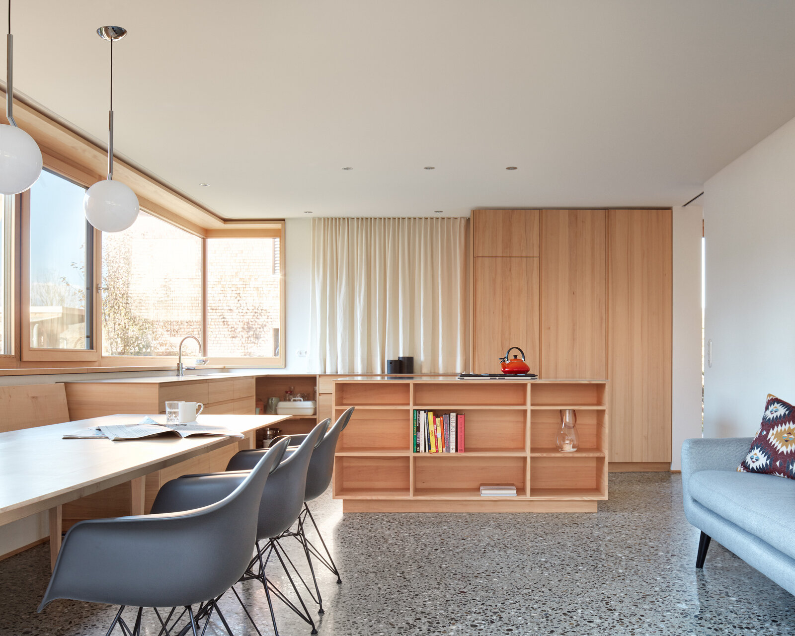 Die zwei Geschoße des Gebäudes lassen sich bei Bedarf auch als getrennte Einheiten nutzen. Im Westen sind dabei jeweils die gemeinschaftlich genutzten Wohnräume angeordnet, im Osten die persönlichen Rückzugsbereiche und Sanitärfunktionen. Die Erschließung ist mittig positioniert. Das komplette Haus ist unterkellert, um ausreichend Stauraum zu schaffen.