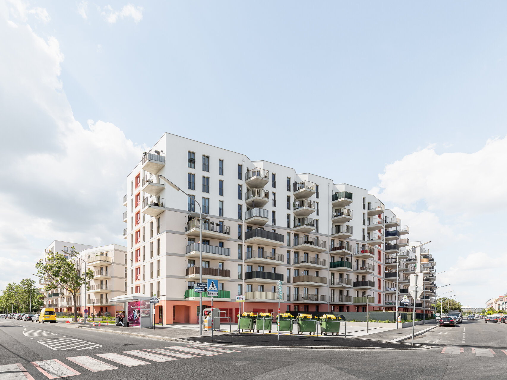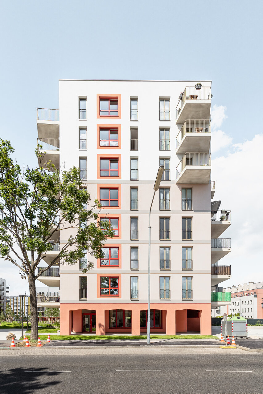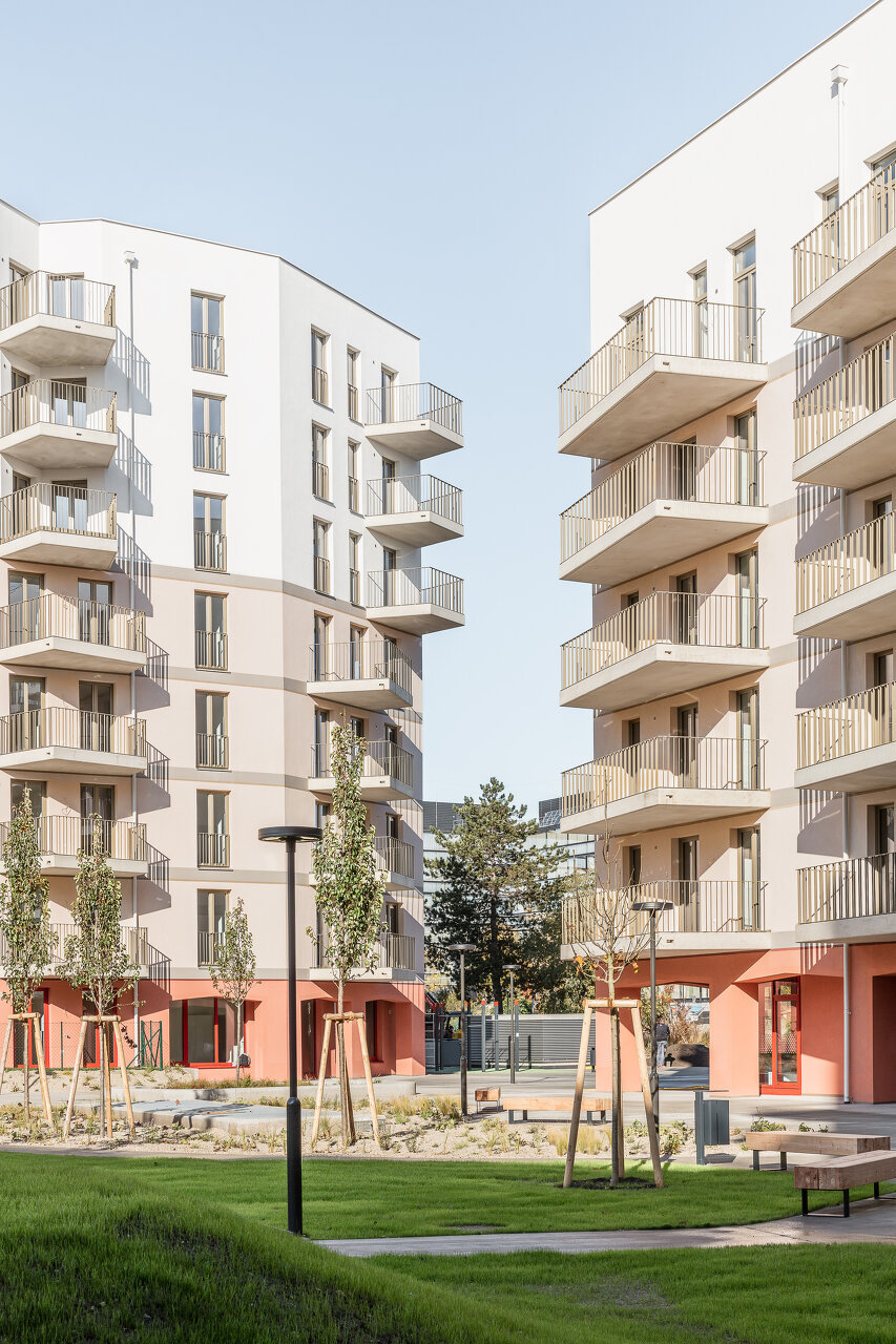 Nahezu jede der zumeist gefällig in eher öffentliche und eher private Zonen unterteilten Wohnungen profitiert vom Ausblick, wahlweise in den Hof hinein oder nach außen über die angrenzenden Grünflächen des Donauspitals, einen Einfamilienhausteppich oder mäßig hohen Geschosswohnungsbau in unmittelbarer Nähe hinweg.