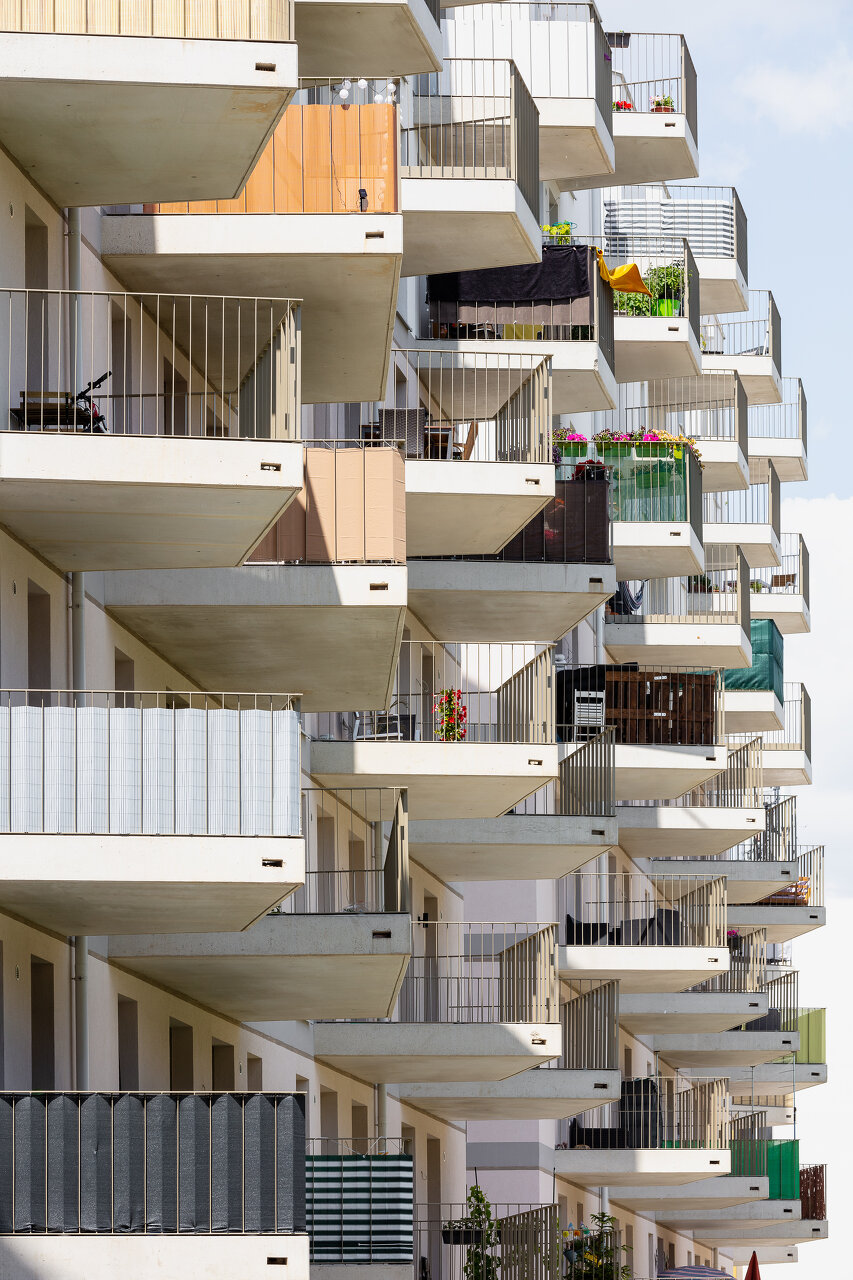 Dazu gehören auch die Balkone – meist übereinander angeordnet und sich so gegenseitig schützend. Ihre kommunikative Offenheit kommt nicht jedem Mieter entgegen, und so zeigen die Brüstungen bereits eine große Bandbreite an Sichtschutzmaterialien. … und sorgen so für weitere Belebung im gezielt und diszipliniert durch Simse, subtile Farbabtönungen und Faschen strukturierten Erscheinungsbild.