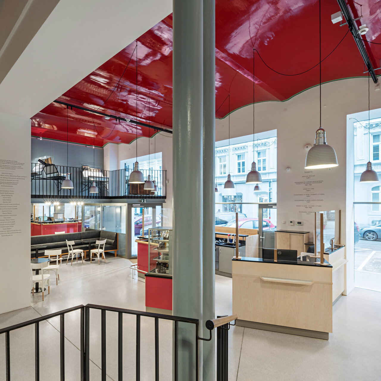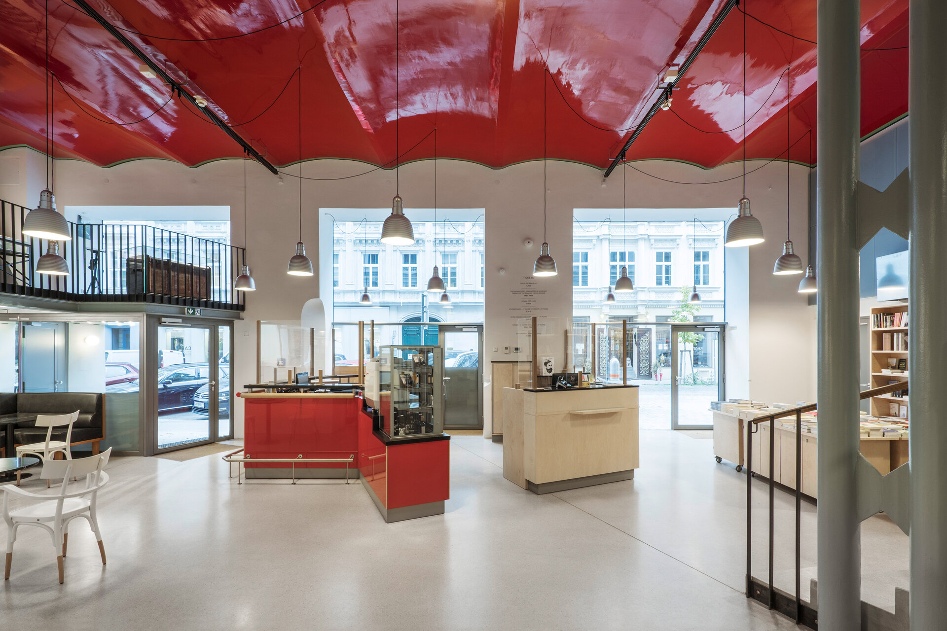Nun öffnen sich auch die übrigen drei Fensterachsen des neuen Foyers mit bodentiefen, breiten verglasten Öffnungen zur Straße. Der Raum wurde in seiner ganzen Höhe und mit seiner Kappendecke freigelegt. Diese erhielt eine leuchtend rote Färbelung. Im Foyer fließen auf zwanglose Weise Kaffeehaus, Ticketkassa und (Buch)Geschäft ineinander. Auch der Ausstellungbereich wurde mit dem Foyer räumlich verschränkt: Die neue Stiege setzt sich in Form einer Galerie als Ausstellungsfläche in das Foyer fort.