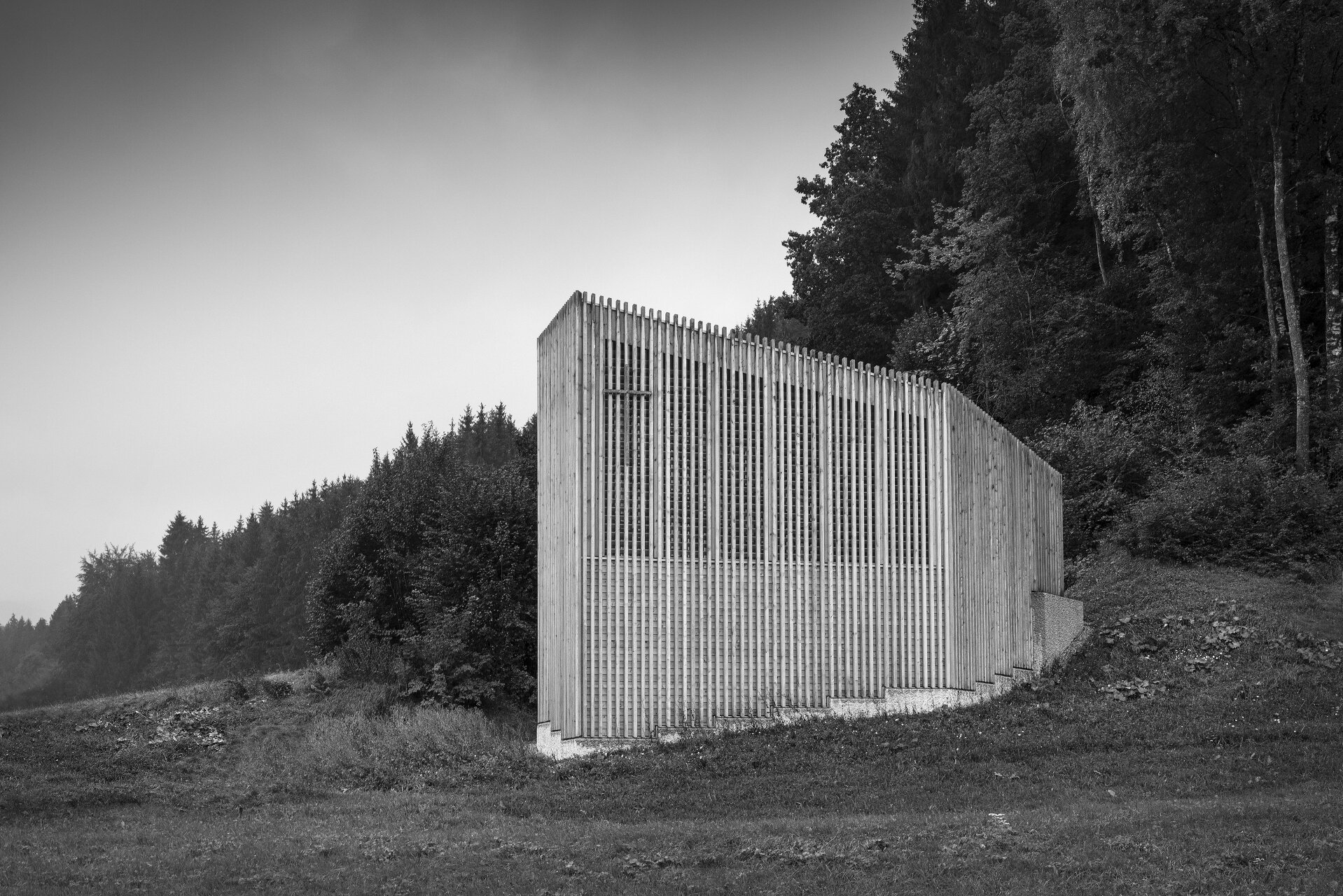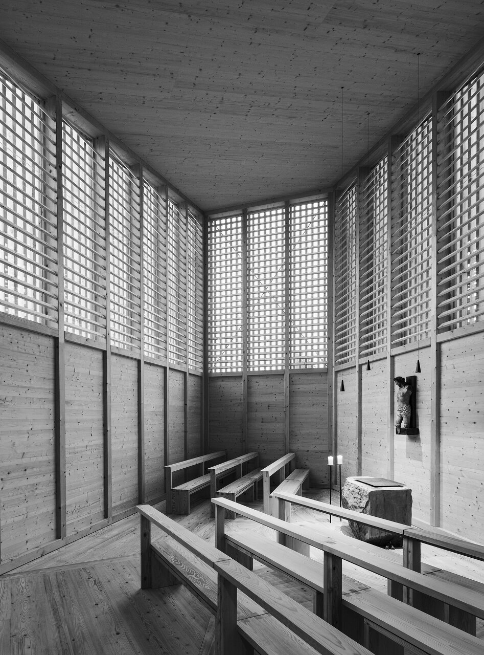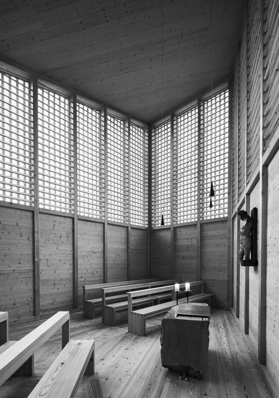 Reduktion auf Konstruktion und Materialität – Lärchenholz, Fichtenholz, gespitzter Beton – bewirken die ruhevolle, besinnlich-abgeschiedene Atmosphäre des Raums. Nach oben hin lösen sich die geschlossenen, raumbildenden Wände auf. Das Zusammenspiel aus tragenden Elementen, vertikaler Fassadenstruktur und horizontalen Lamellen sorgt für die charakteristische, stimmungsvolle Licht- und Raumwirkung im Inneren der Kapelle.