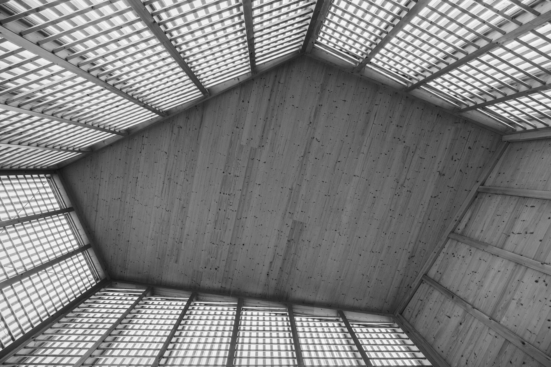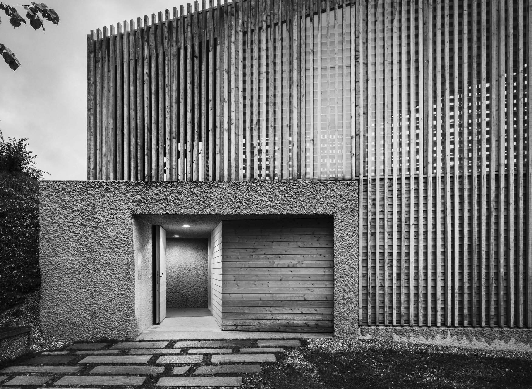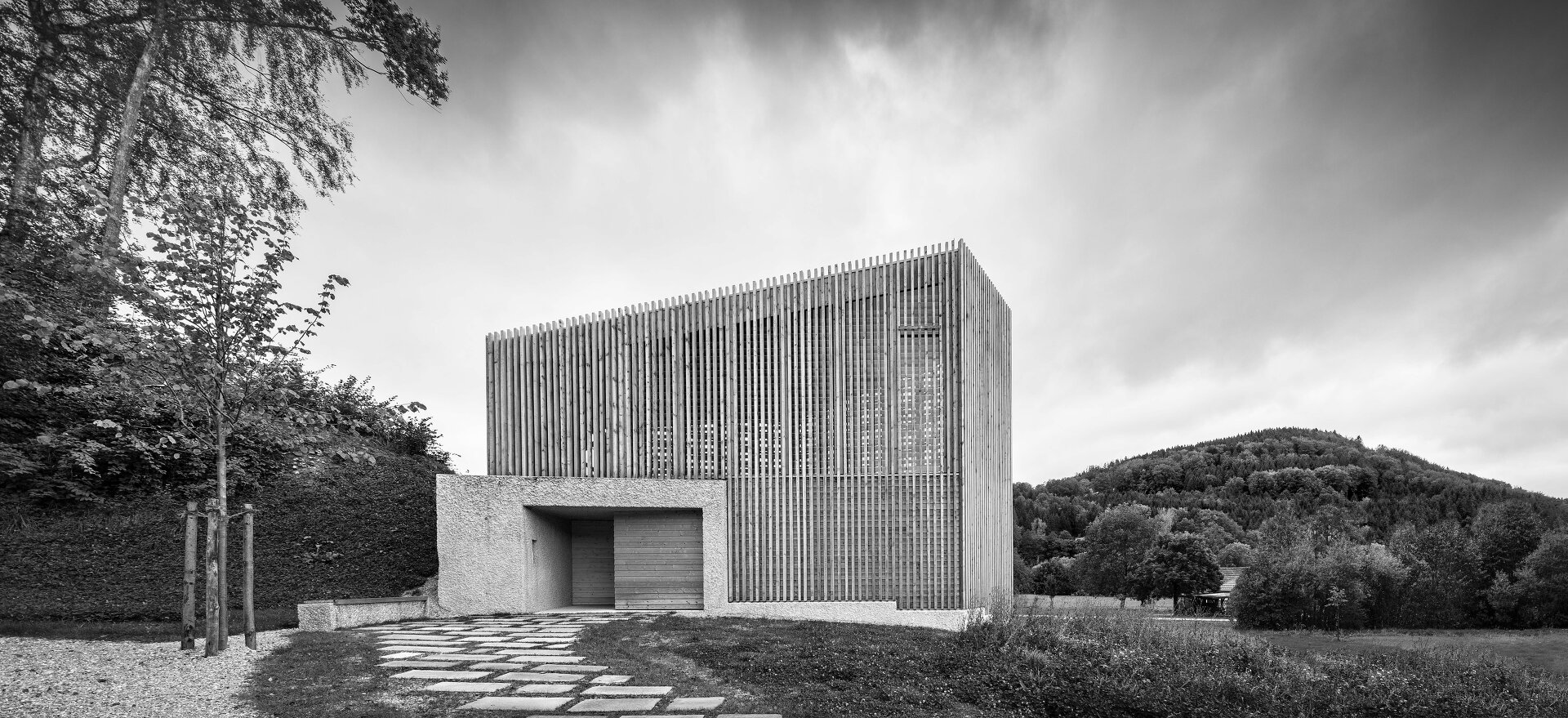 Reduktion auf Konstruktion und Materialität – Lärchenholz, Fichtenholz, gespitzter Beton – bewirken die ruhevolle, besinnlich-abgeschiedene Atmosphäre des Raums. Nach oben hin lösen sich die geschlossenen, raumbildenden Wände auf. Das Zusammenspiel aus tragenden Elementen, vertikaler Fassadenstruktur und horizontalen Lamellen sorgt für die charakteristische, stimmungsvolle Licht- und Raumwirkung im Inneren der Kapelle.