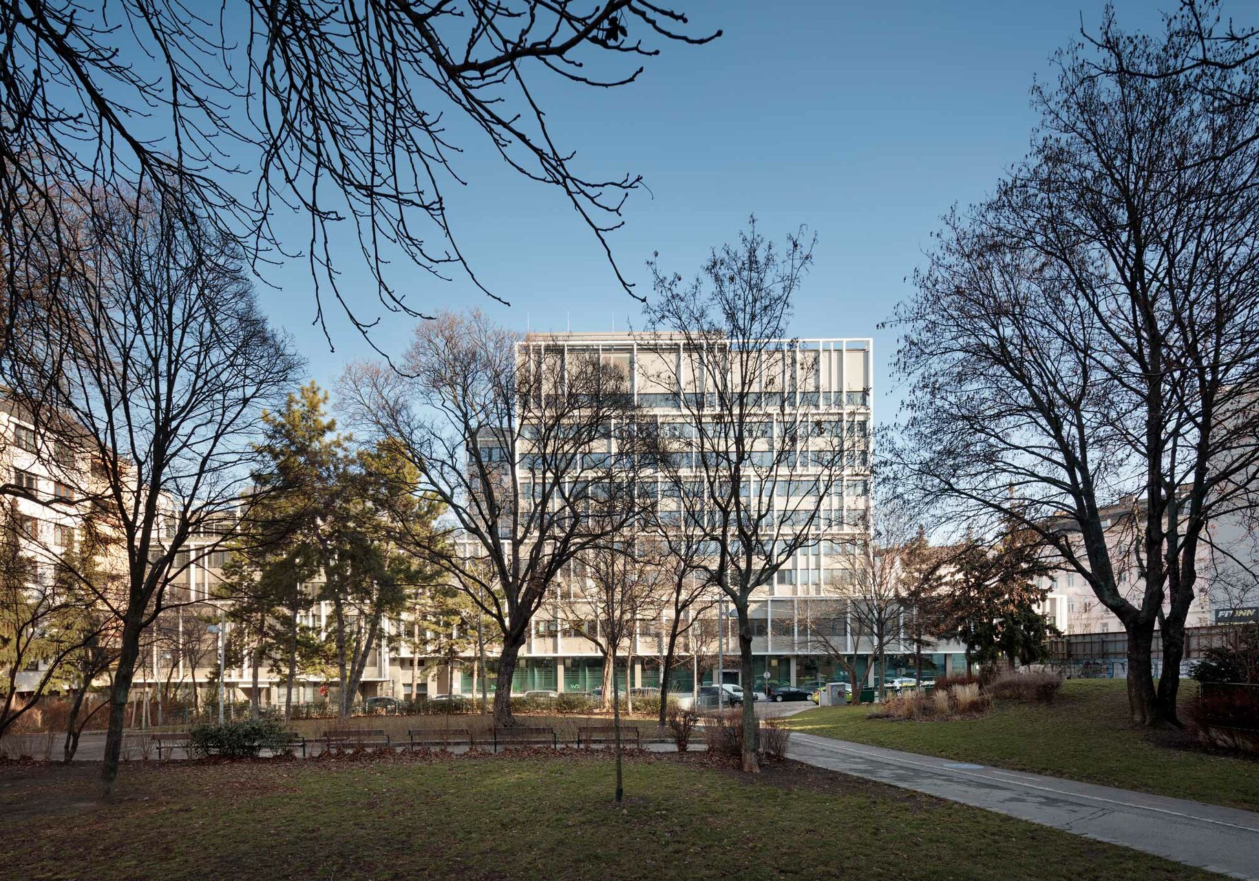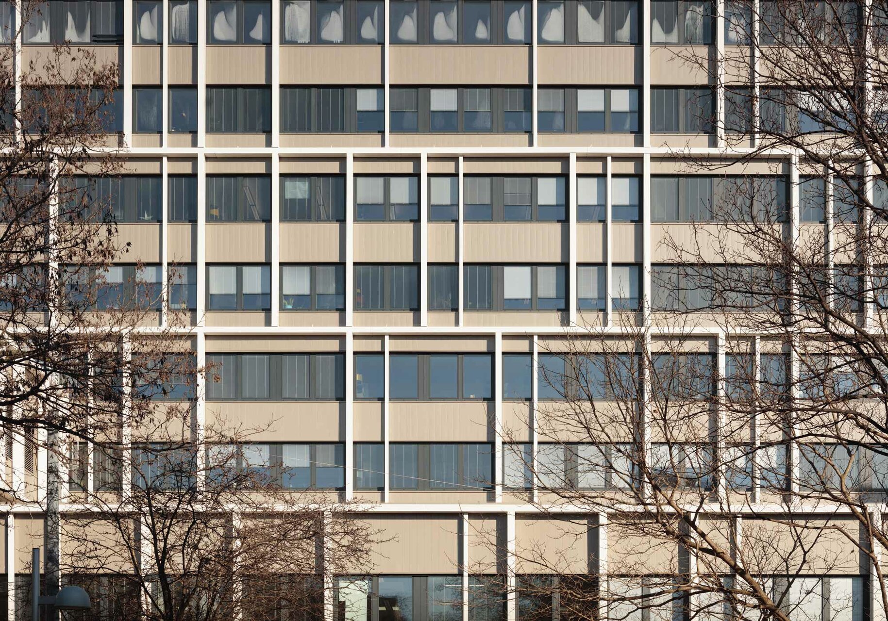 Während die neue, hinterlüftete, bronzefarbene Metallfassade die warmen Pastelltöne der umliegenden Gründerzeitgebäude fortsetzt, bestimmen die vorgesetzten weißen Rahmen den neuen Rhythmus des Gebäudekomplexes – konzeptionell in Anlehnung an den Herzschlag. (Text: Architekt:innen, bearbeitet)