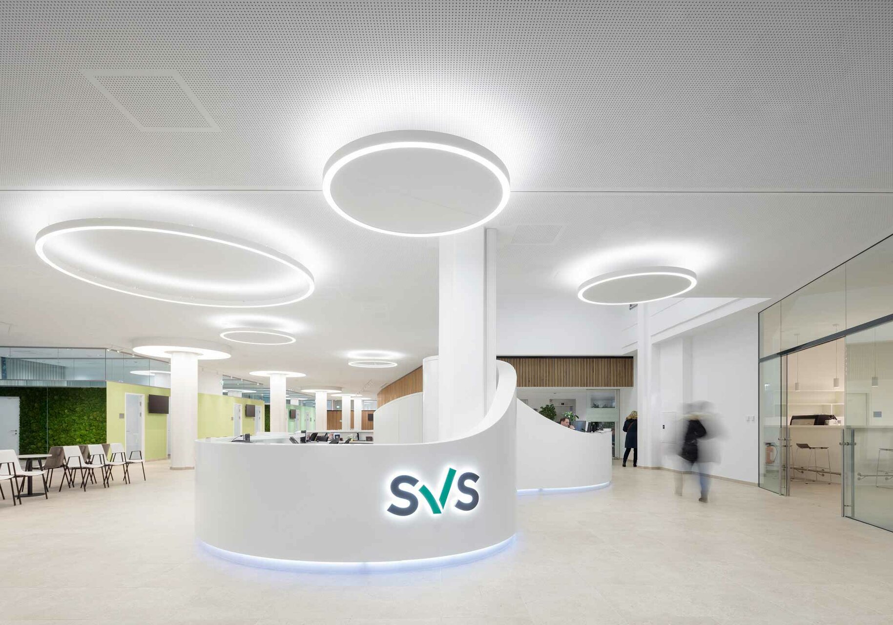 Der SVS-Gebäudekomplex gliedert sich funktional in das zirka 37 Meter hohe Beratungszentrum mit Offices sowie in den einige Jahre später errichteten Zubau, der als Sonderkrankenanstalt und Gesundheitszentrum genutzt wird. Der Baukörper blieb nahezu unverändert, während das Gebäudeinnere entkernt, saniert und auf den neuesten Stand der Technik gebracht wurde. Sämtliche Büros im Beratungs- und Gesundheitszentrum sind durchgängig in einem Ausbauraster von 2,50 Meter konzipiert, wodurch diese an künftige Veränderungswünsche flexibel angepasst werden können. Zentrales Element in der großzügigen, 3,5 Meter hohen Eingangshalle ist das expressiv geschwungene Infodesk. Dieses trennt die halböffentlichen Bereiche räumlich vom stark frequentierten Foyer. Das Erdgeschoss mit Beratungszentrum, Café und Kantine ist ebenso neu organisiert wie das angebaute Gesundheitszentrum beide sind über ein Stiegenhaus verbunden.