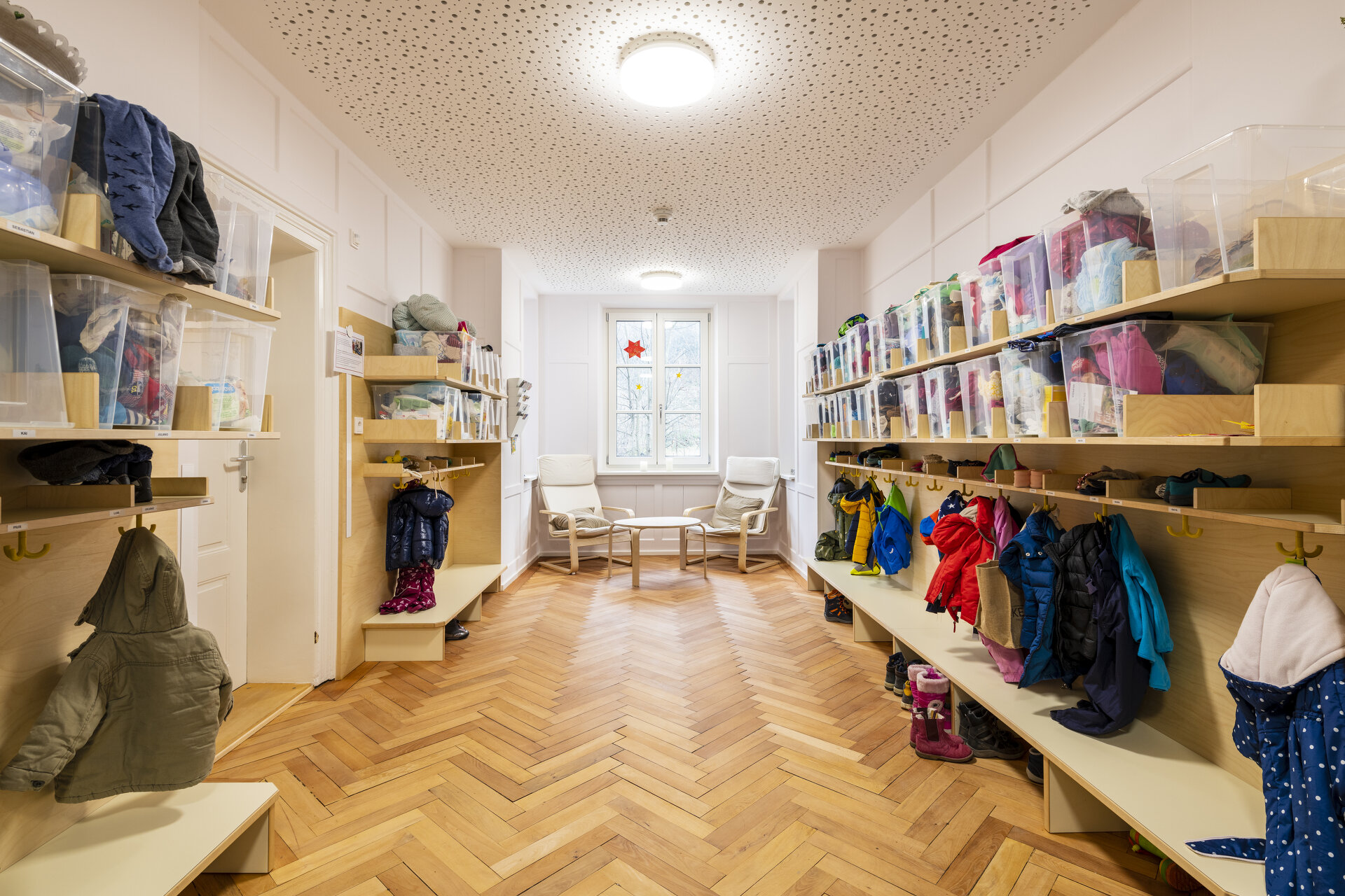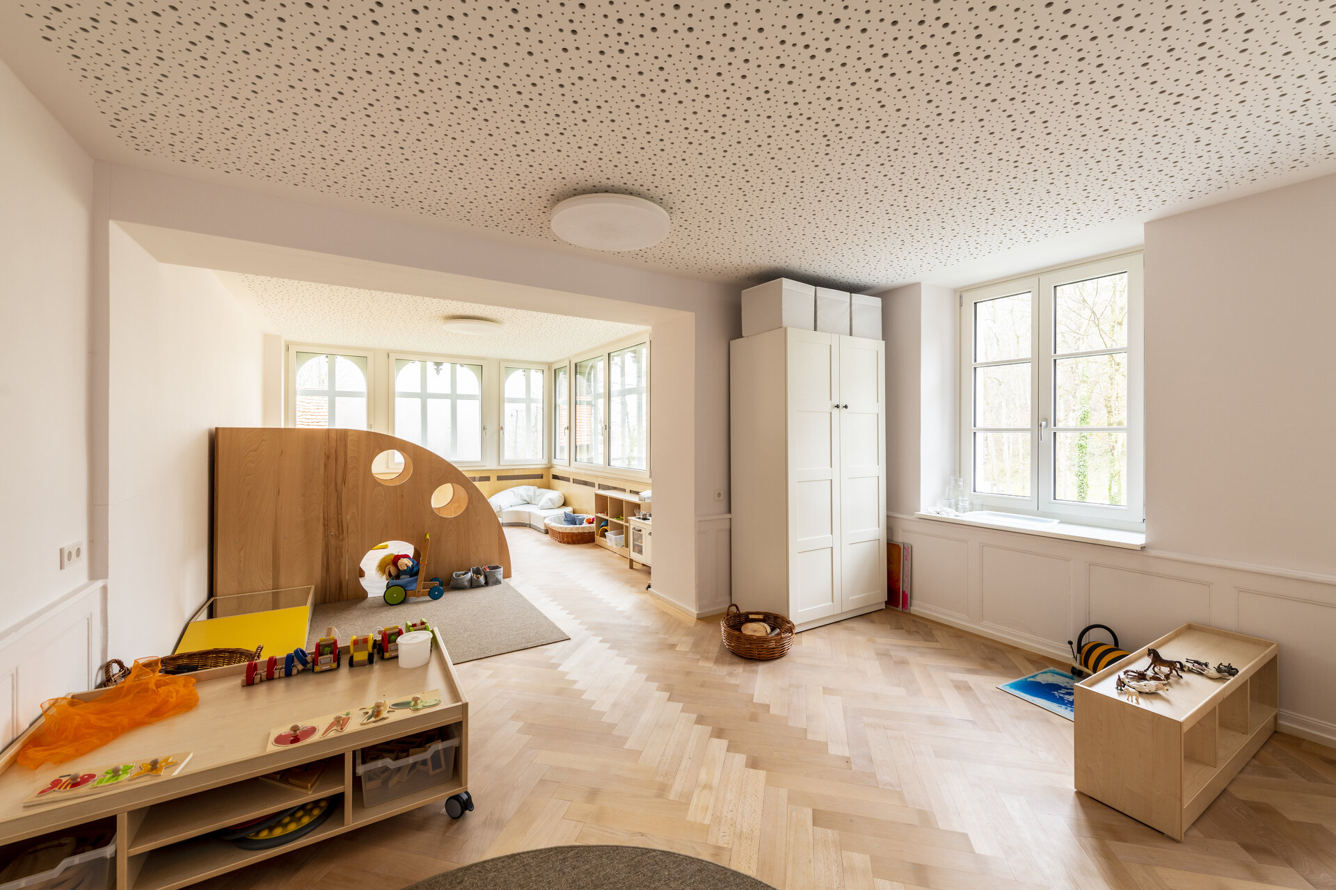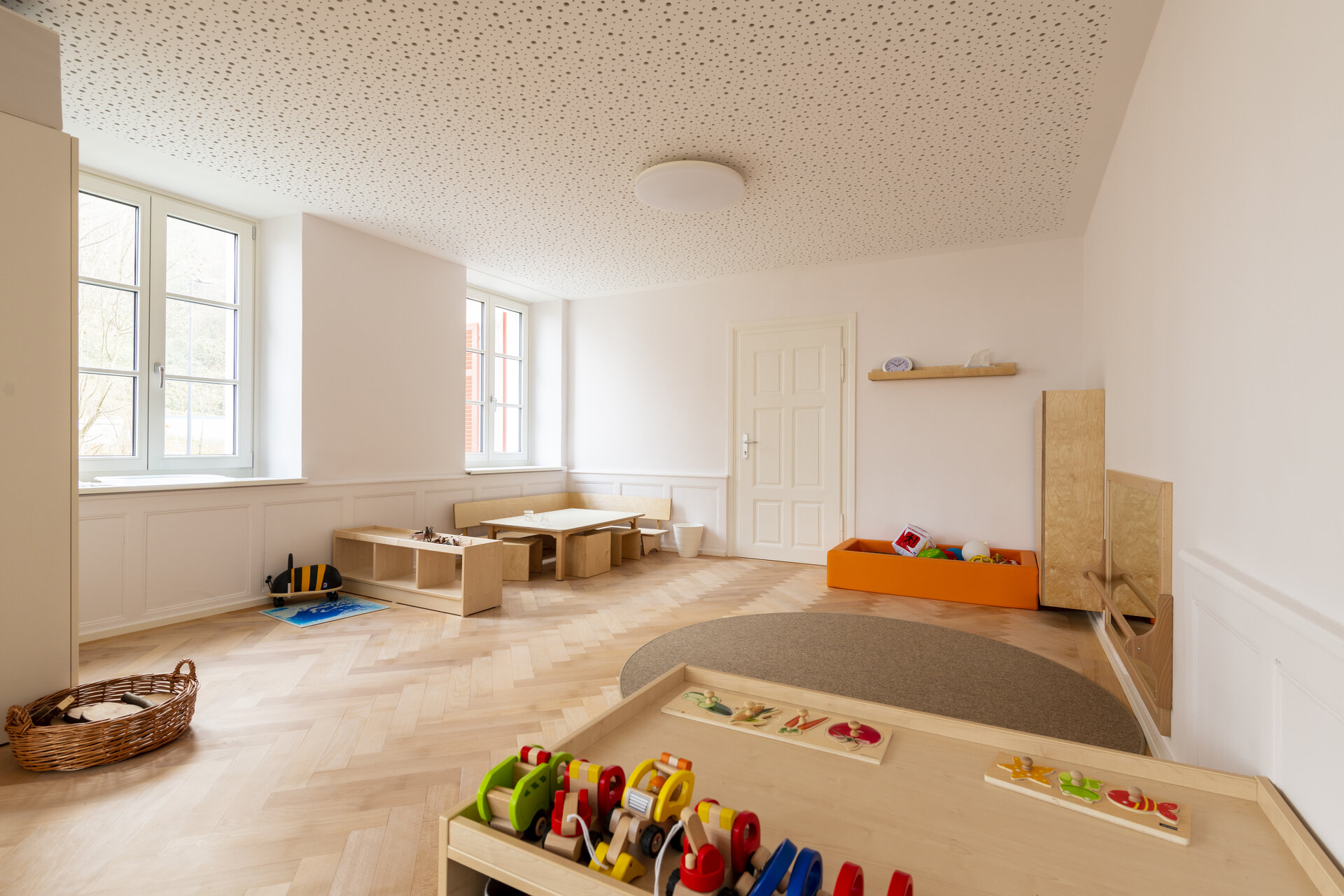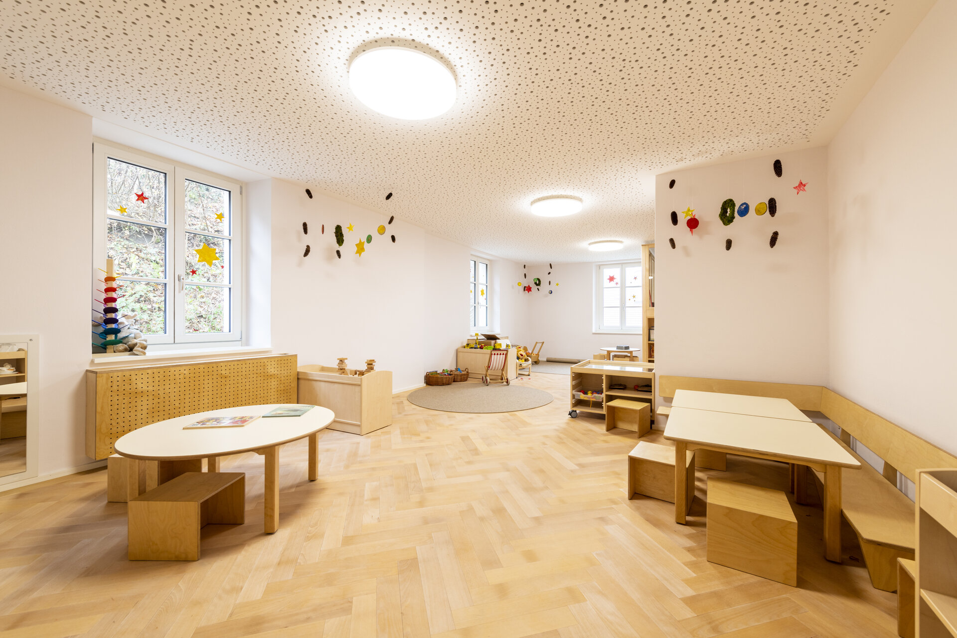 Im Erdgeschoß entstand durch einen kleinen, südseitigen Zubau ein neuer Eingangsbereich. Durch Mauerausbrüche wurden zwei Gruppenräume realisiert, eine Garderobe und ein Waschraum für die Kinder. Im ersten Obergeschoß wurden zwei bestehende Räume zum Bewegungsraum. Die angrenzende Veranda wird als Lager verwendet. Zwei Büroräume und ein Besprechungsraum sind genauso wie der Aufenthaltsraum dem Personal vorbehalten. Keller- und Dachgeschoß blieben unverändert.