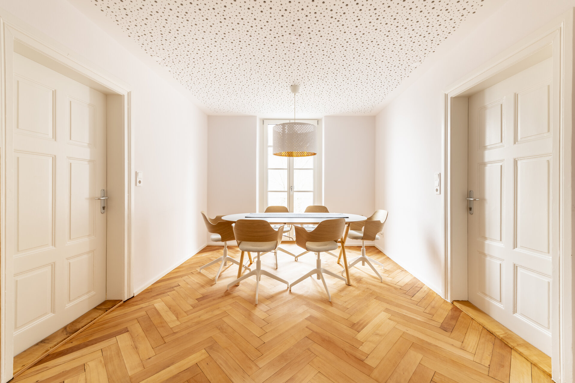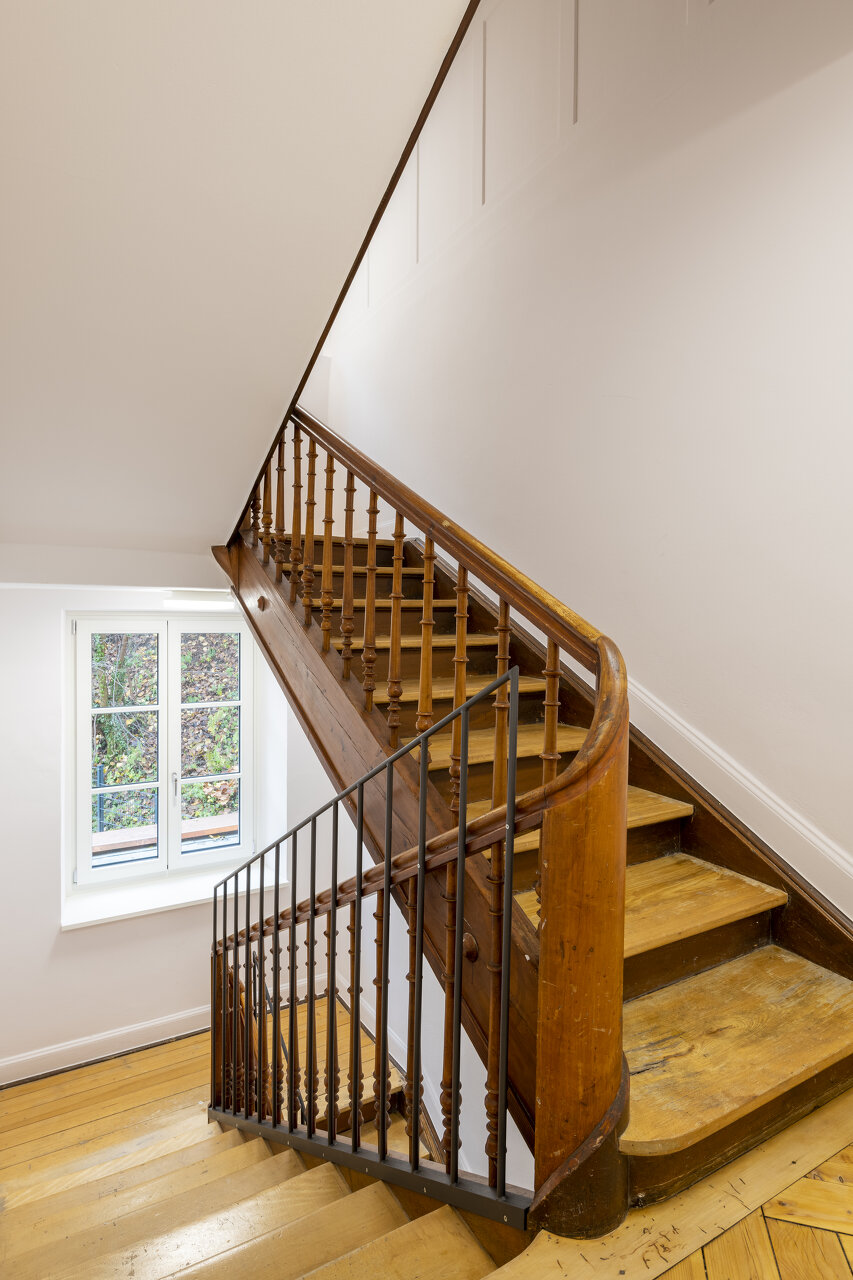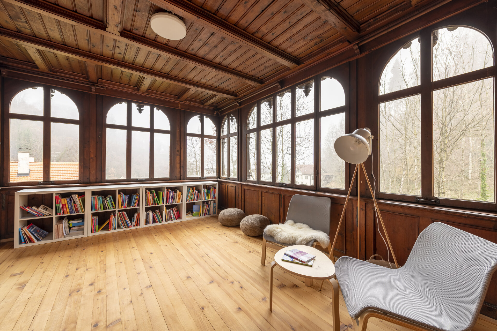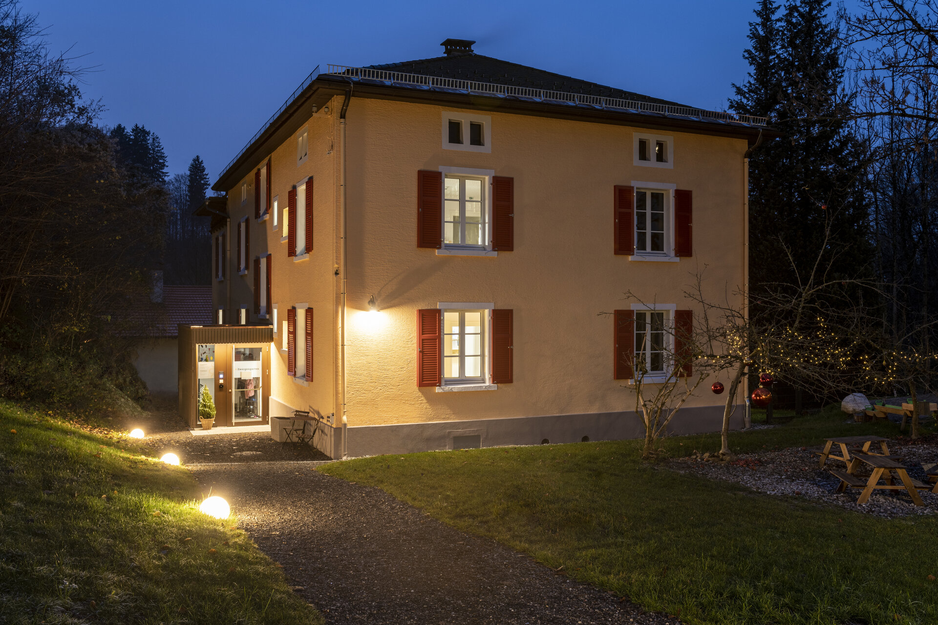 Im Erdgeschoß entstand durch einen kleinen, südseitigen Zubau ein neuer Eingangsbereich. Durch Mauerausbrüche wurden zwei Gruppenräume realisiert, eine Garderobe und ein Waschraum für die Kinder. Im ersten Obergeschoß wurden zwei bestehende Räume zum Bewegungsraum. Die angrenzende Veranda wird als Lager verwendet. Zwei Büroräume und ein Besprechungsraum sind genauso wie der Aufenthaltsraum dem Personal vorbehalten. Keller- und Dachgeschoß blieben unverändert.