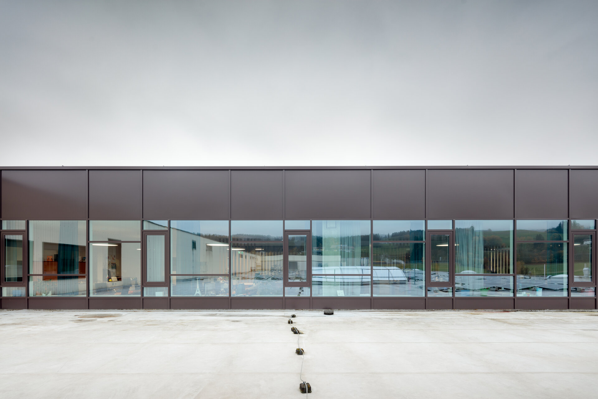 Um den Anforderungen eines Arbeitsplatzes gerecht zu werden, mussten vor allem die Belichtung und Belüftung der ehemaligen Lagerflächen adaptiert werden. So wurde die Nordost-Seite mittels Pfosten-Riegel-Fassade geöffnet und die Mittelzone durch Oberlichter natürlich belichtet. Das benötigte Lüftungssystem sowie weitere Installationen wurden auf Sicht montiert und verleihen dem Großraumbüro einen passenden, industriellen Charakter, welcher sich durch die gesamte Planung zieht. Die Bodenmarkierungen der ehemaligen Lageflächen etwa blieben erhalten und wurden in das Konzept integriert.