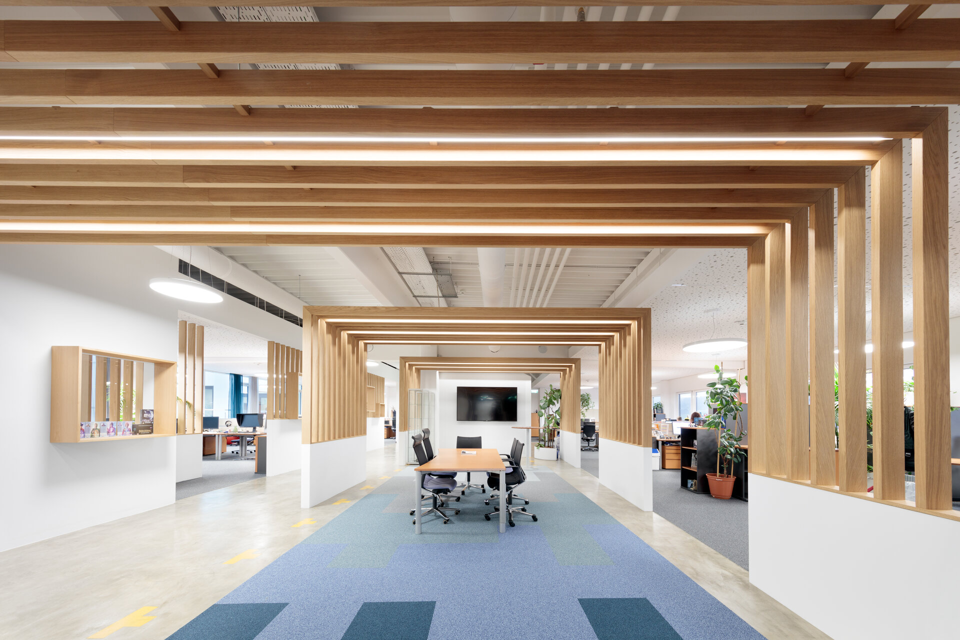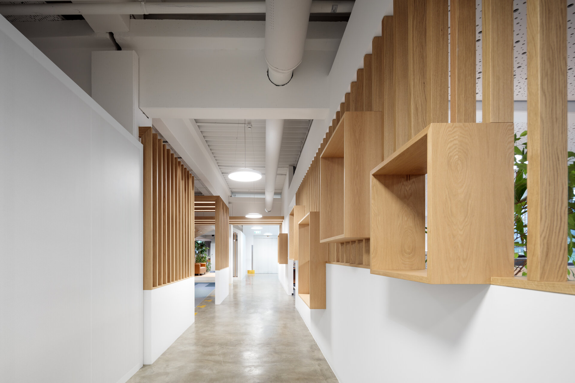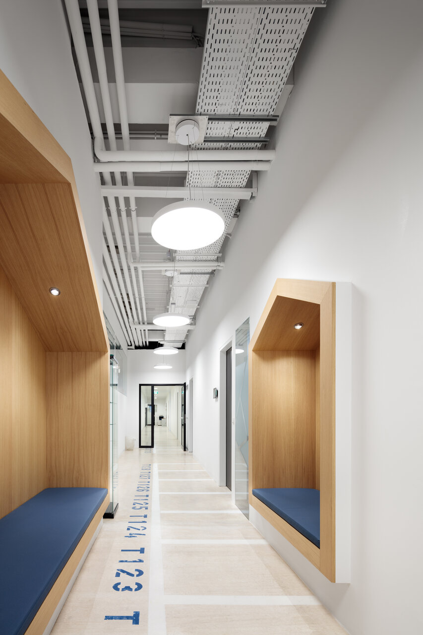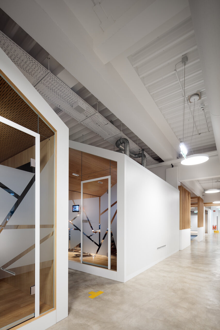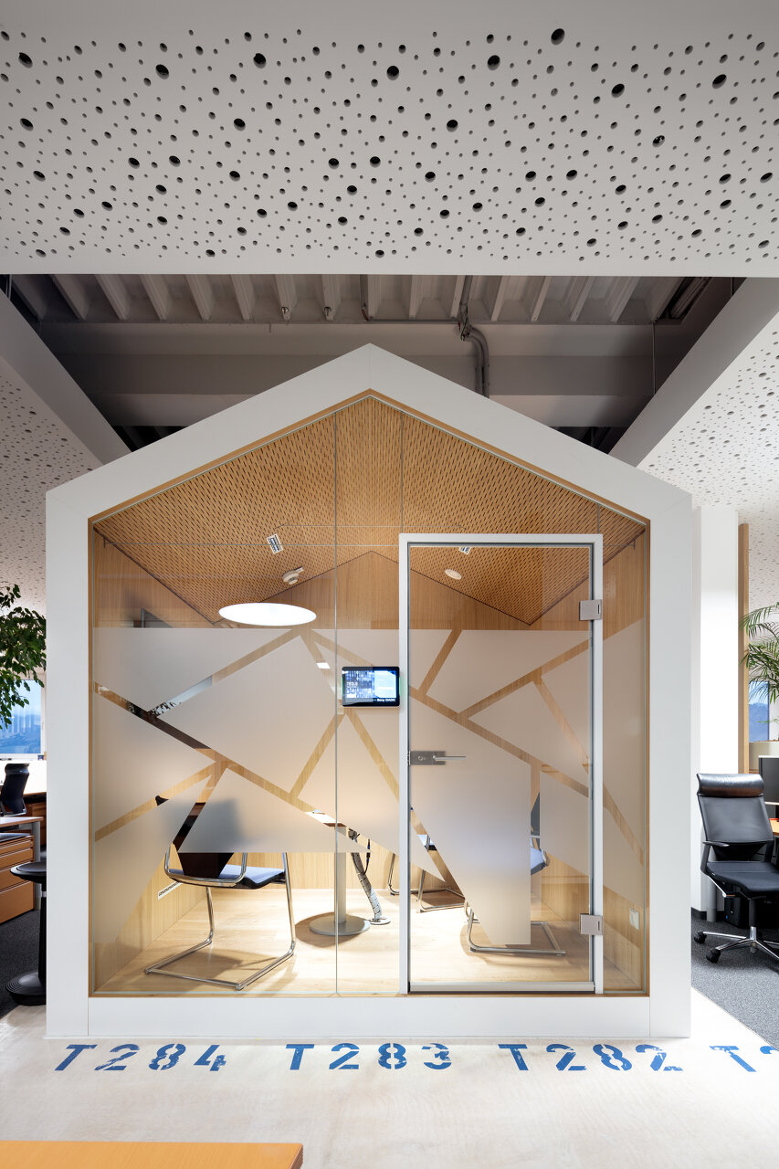 Unterschiedlich große Besprechungsräume, eine Hot Desking Zone sowie Bereiche für kurze, spontane Meetings in der Mittelzone gliedern die verschiedenen Abteilungen. In der sogenannten Town Hall können alle Mitarbeiter in einem ungezwungenen, lockeren Umfeld zusammenkommen und besprechen. Neue, offene Arbeitswelten wurden somit in die Halle implementiert. (Text: Architekten)