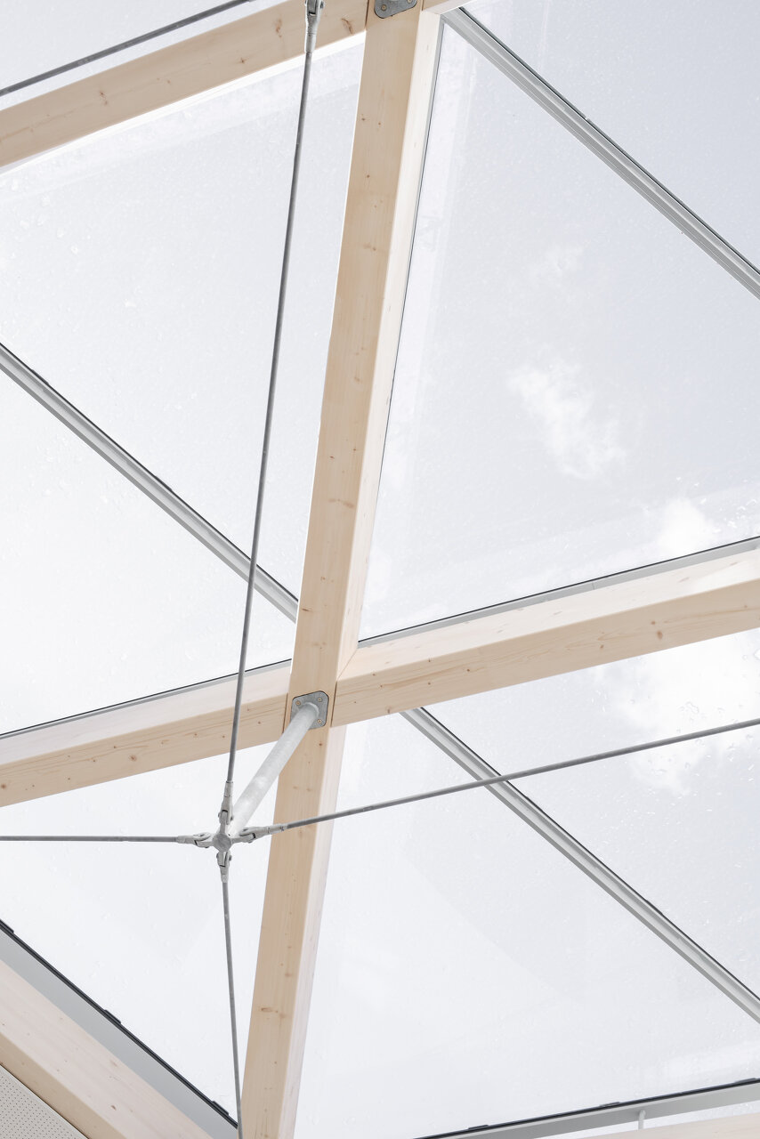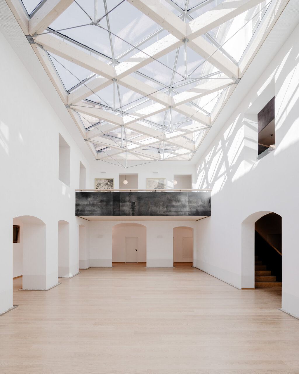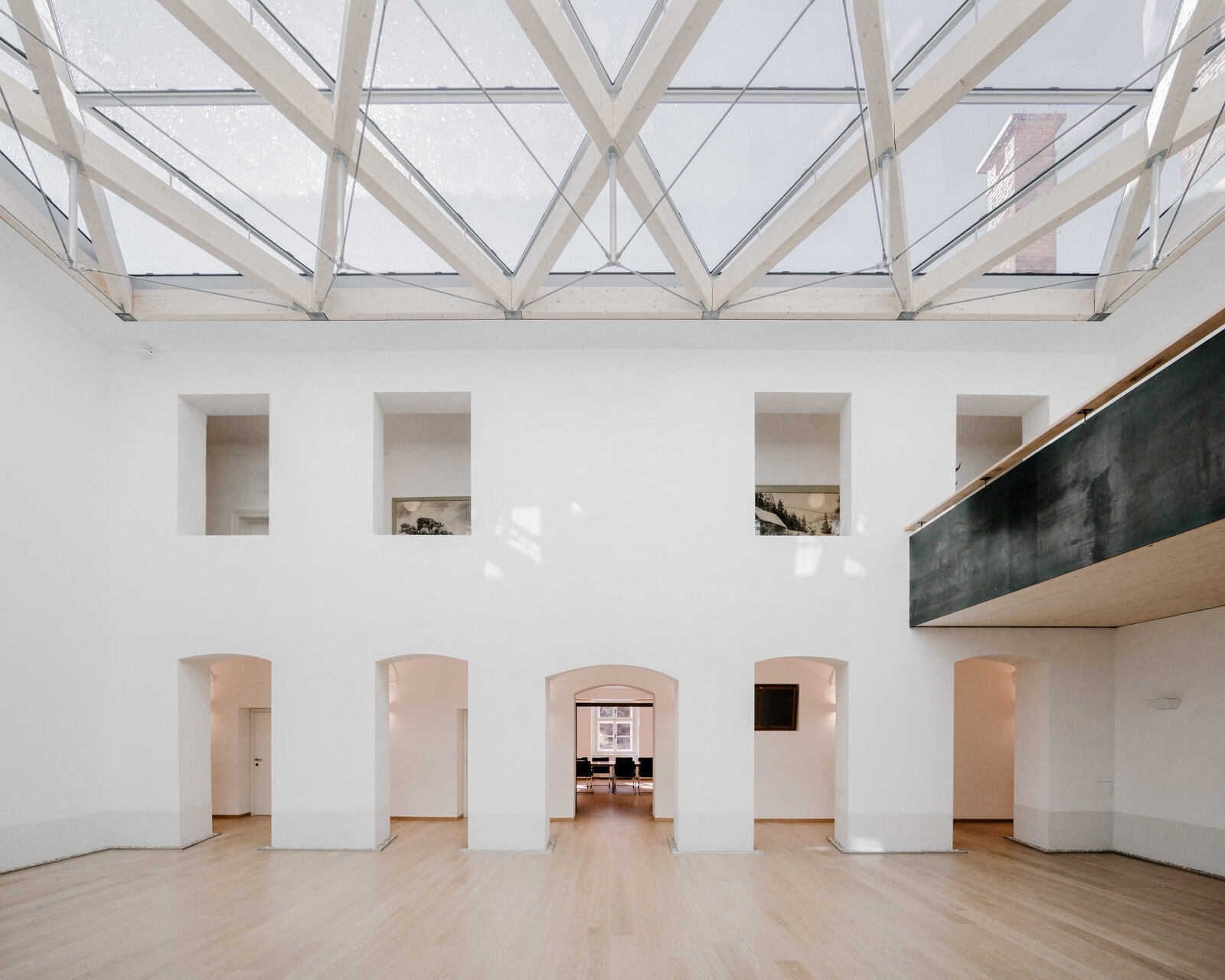 Eine neue Glasüberdachung über dem Innenhof macht die Erdgeschoßzone zu einem Mehrzweckbereich, der für unterschiedliche Nutzungen ganzjährig zur Verfügung steht. Der Hauptzweck der neuen Halle ist jedoch die neue Offenheit, die Lichtdurchflutung und die gewonnene Qualität des Raumes. Ebenfalls wird die Energiebilanz des gesamten Schlosses verbessert. Die Leimholzkonstruktion stammt aus dem Werk der Auftraggeber.