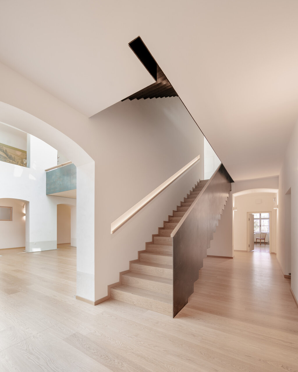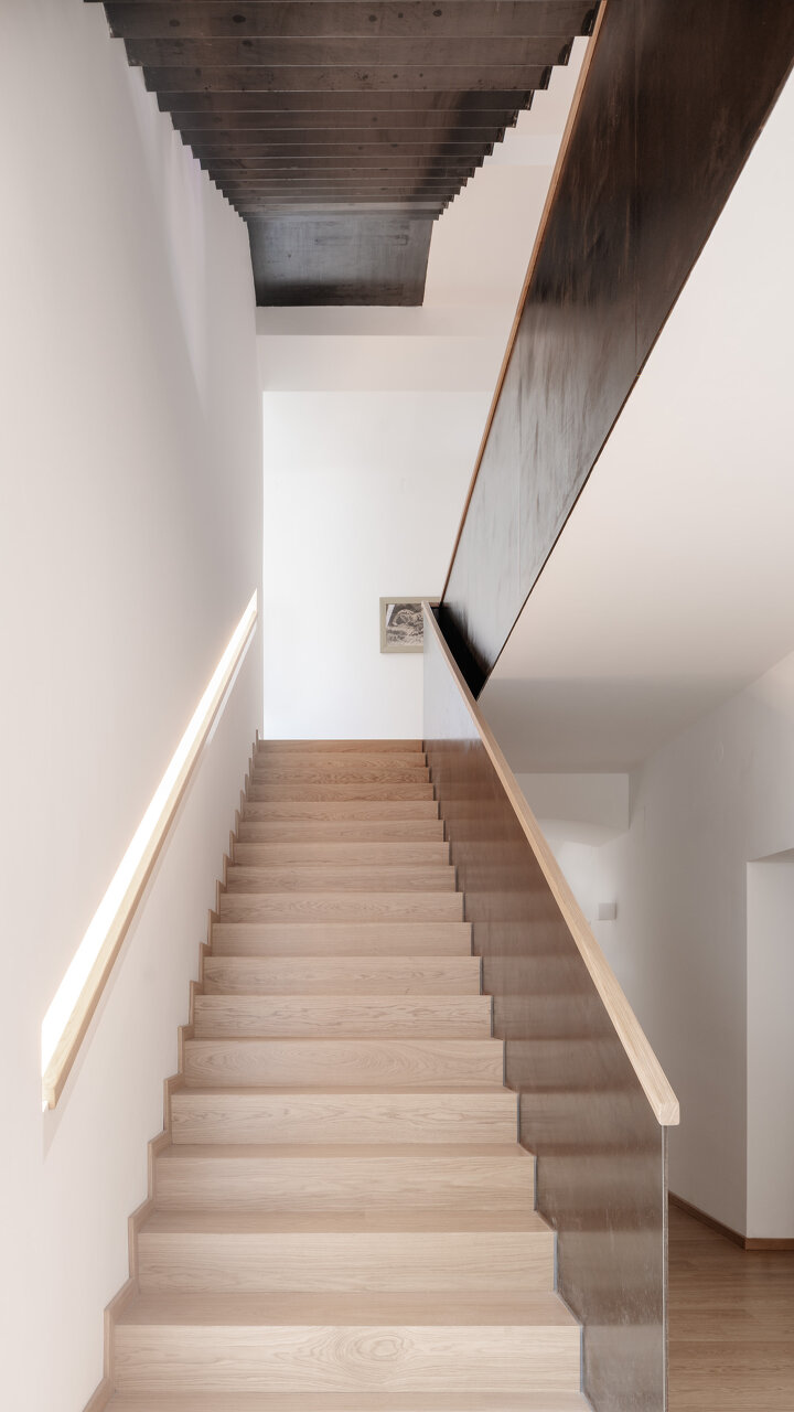 Wesentliches Augenmerk wurde auf die Ankommenssituation gelegt, wo nach Öffnen der Eingangstüre ein Durchblick durch das gesamte Gebäude gewährleistet ist. Die neue Stiege ist unaufdringlich im Gangbereich situiert und setzt durch die „andersartige“ Detaillierung einen neuen Akzent in der bestehenden Substanz. Die Stahlkonstruktion unterstützt die Wandstatik.