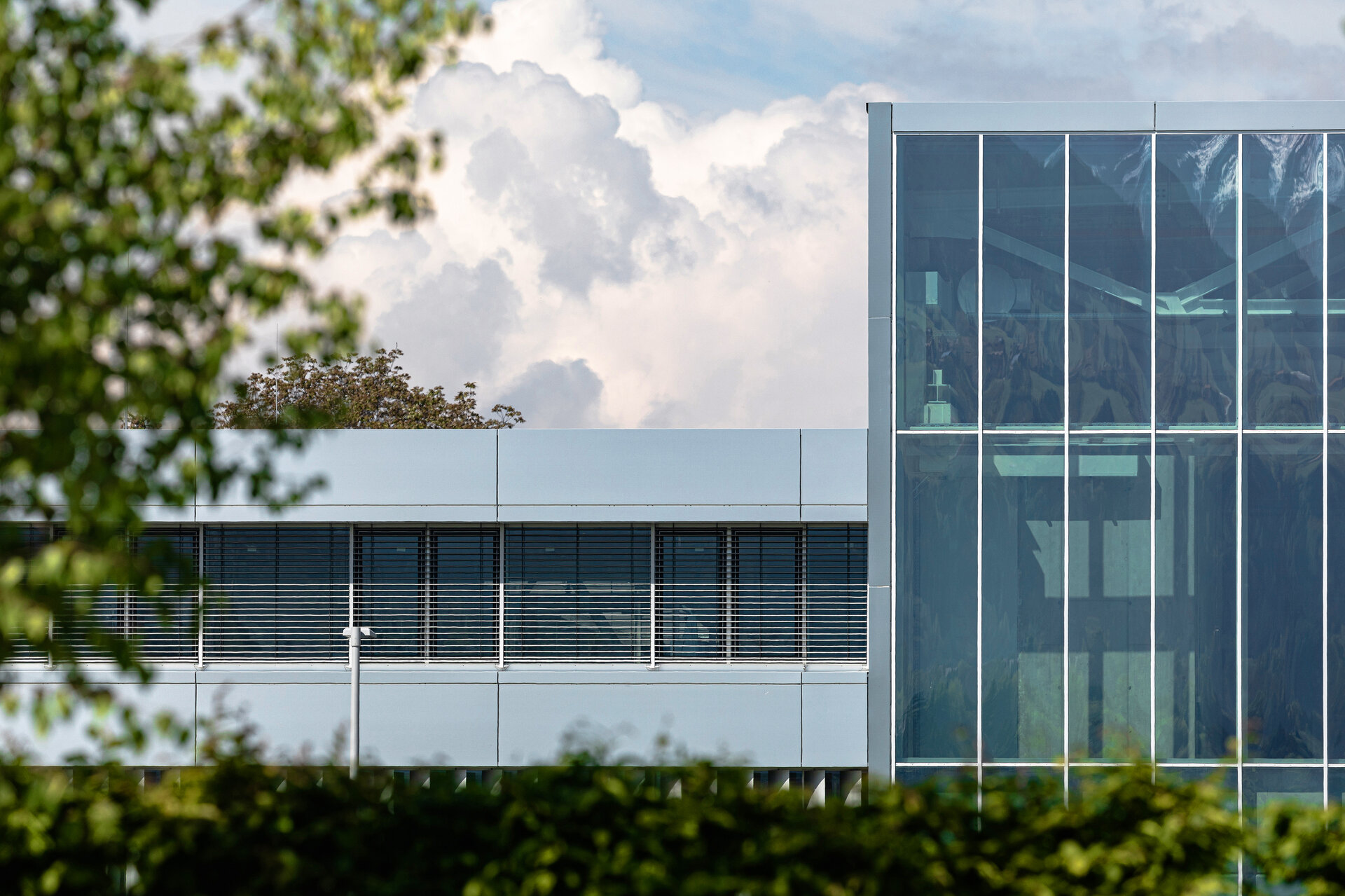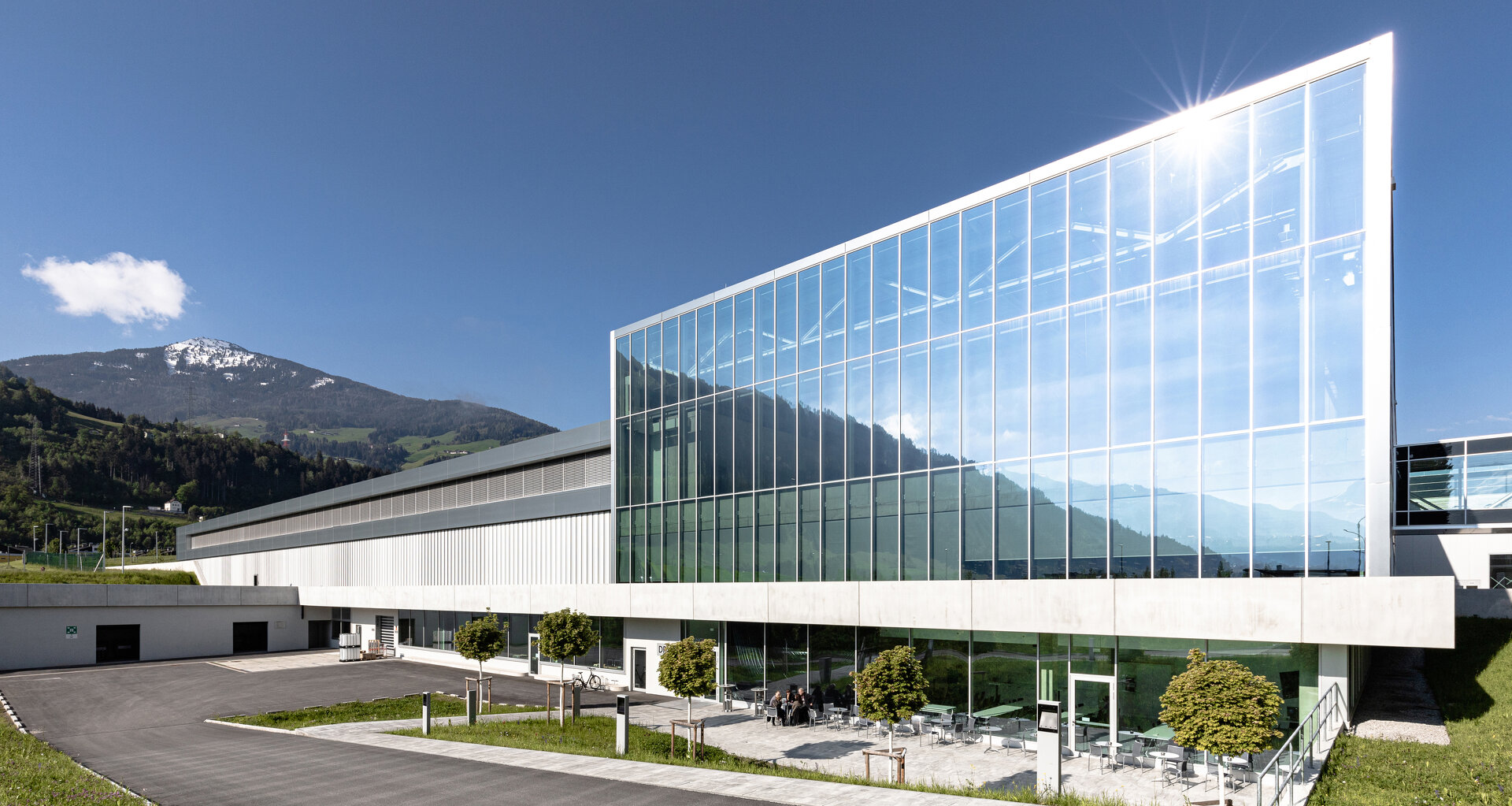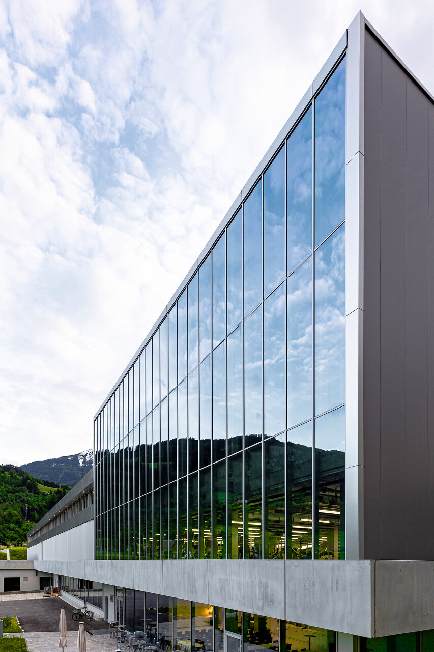 Gekleidet ist das moderne Industriegebäude in eine großflächige Glasfassade (4.700 m²), die nicht nur ein ruhiges Bild, sondern gleichzeitig eine angenehme Arbeitsatmosphäre für die Mitarbeiterinnen und Mitarbeiter schafft. Denn die großen Fenster fluten die Produktions- und Büroflächen mit natürlichem Tageslicht und erzeugen sowohl thermischen als auch visuellen Komfort – ein Ambiente, das in gewöhnlichen Fabrikshallen selten zu finden ist.