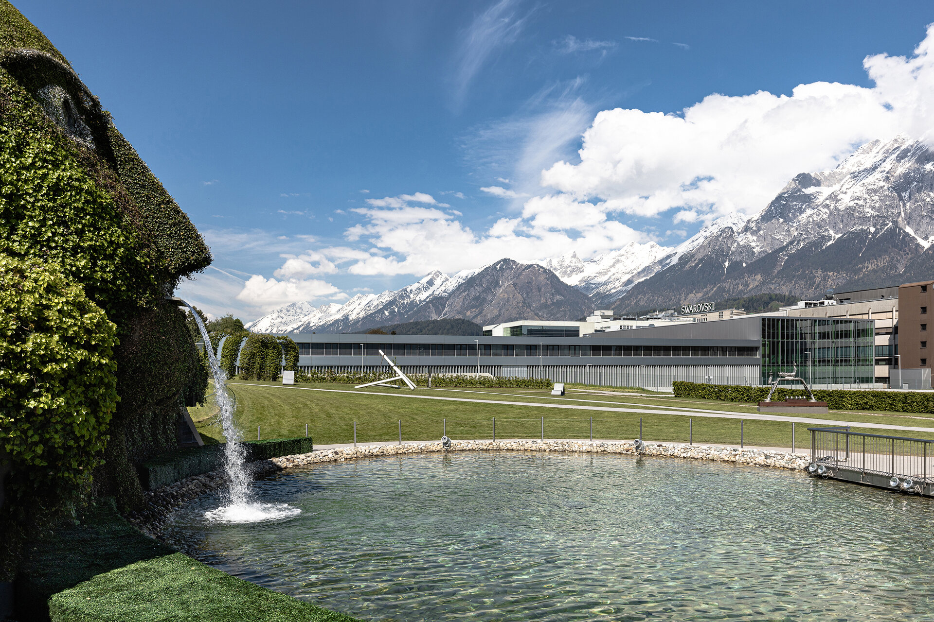 Die Ost-Fassade der Kristallfabrik wird durch die filigrane Glasfront des „Bildschirms” definiert. Durch die dunklen, schlanken Profile und die minimierten Sprossenbreiten wirken die einzelnen Glaselemente wie eine zusammenhängende Fläche, die auf die Außenwelt reagiert: Wenn man untertags auf das Gebäude zufährt, spiegelt man sich vor dem Panorama des Inntals im Gebäude. Das überdimensionale Fenster von ca. 360 m² nimmt die Landschaft im wahrsten Sinne des Wortes „in sich auf“ und gibt sie wieder. Nachts erscheint ein anderes Schauspiel im „Bildschirm”: Durch den innenliegenden Blendschutz und die getönten Scheiben beginnt er zu „glimmen” und schützt damit den Nachtschichtbetrieb vor Einblicken.