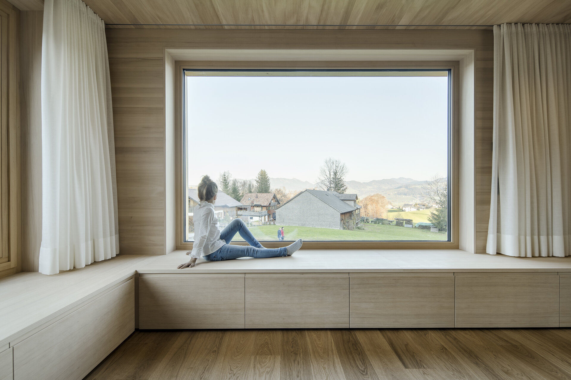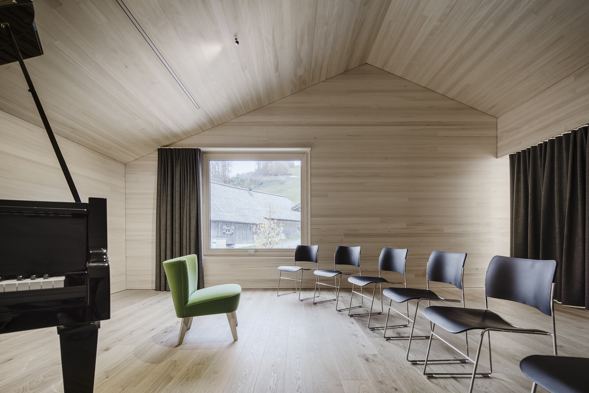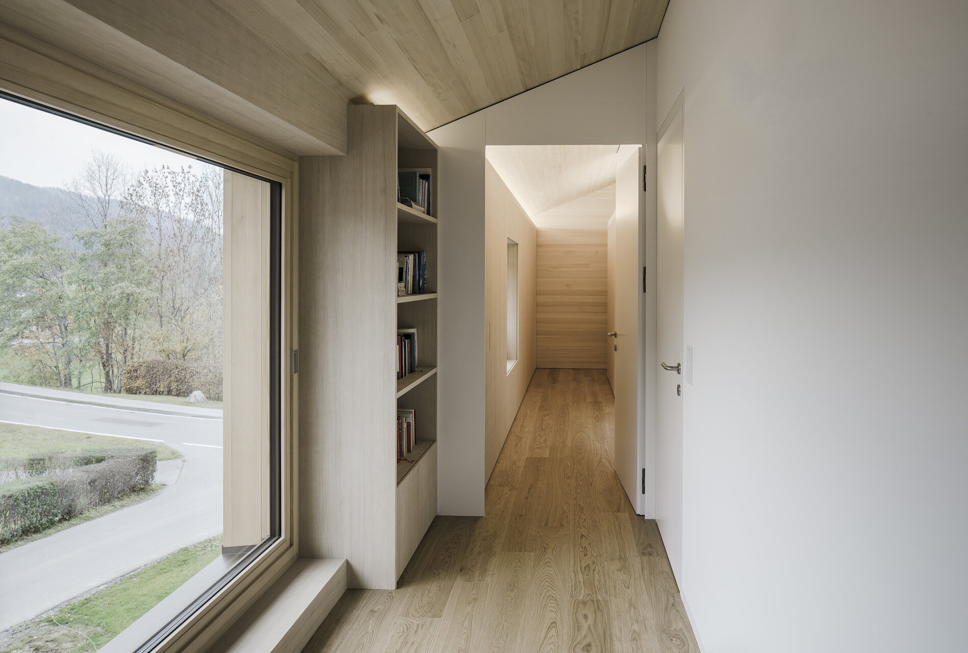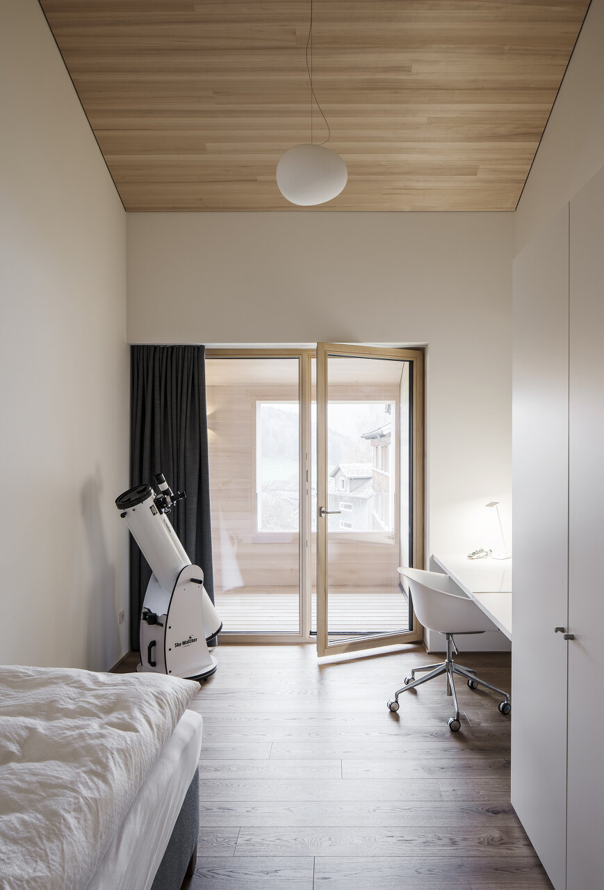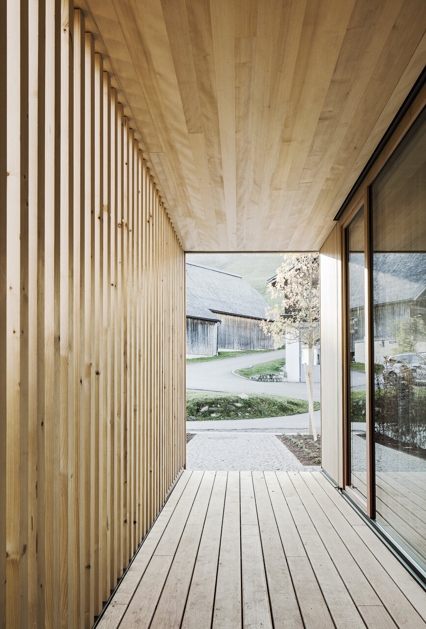 Präzis angeordnete Einschnitte und Fassadenöffnungen bieten differenzierte Bezüge zur umgebenden Landschaft und Nachbarschaft. Sämtliche Baumaterialien wurden unbehandelt eingebaut. Außen ist das Gebäude mit einer naturbelassenen Fichtenfassade aus Latten unterschiedlicher Breite verkleidet, innen kam schlichtes Weißtannentäfer zur Anwendung. (Text: Architekt, bearbeitet)
