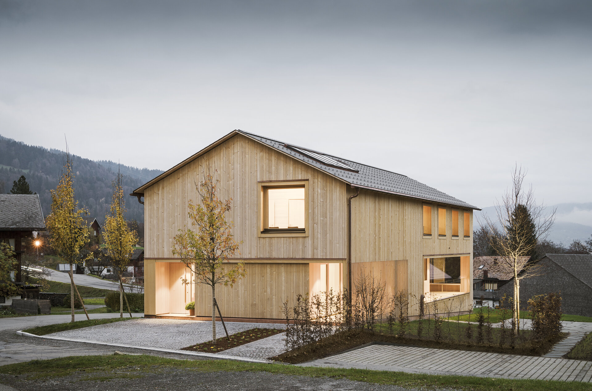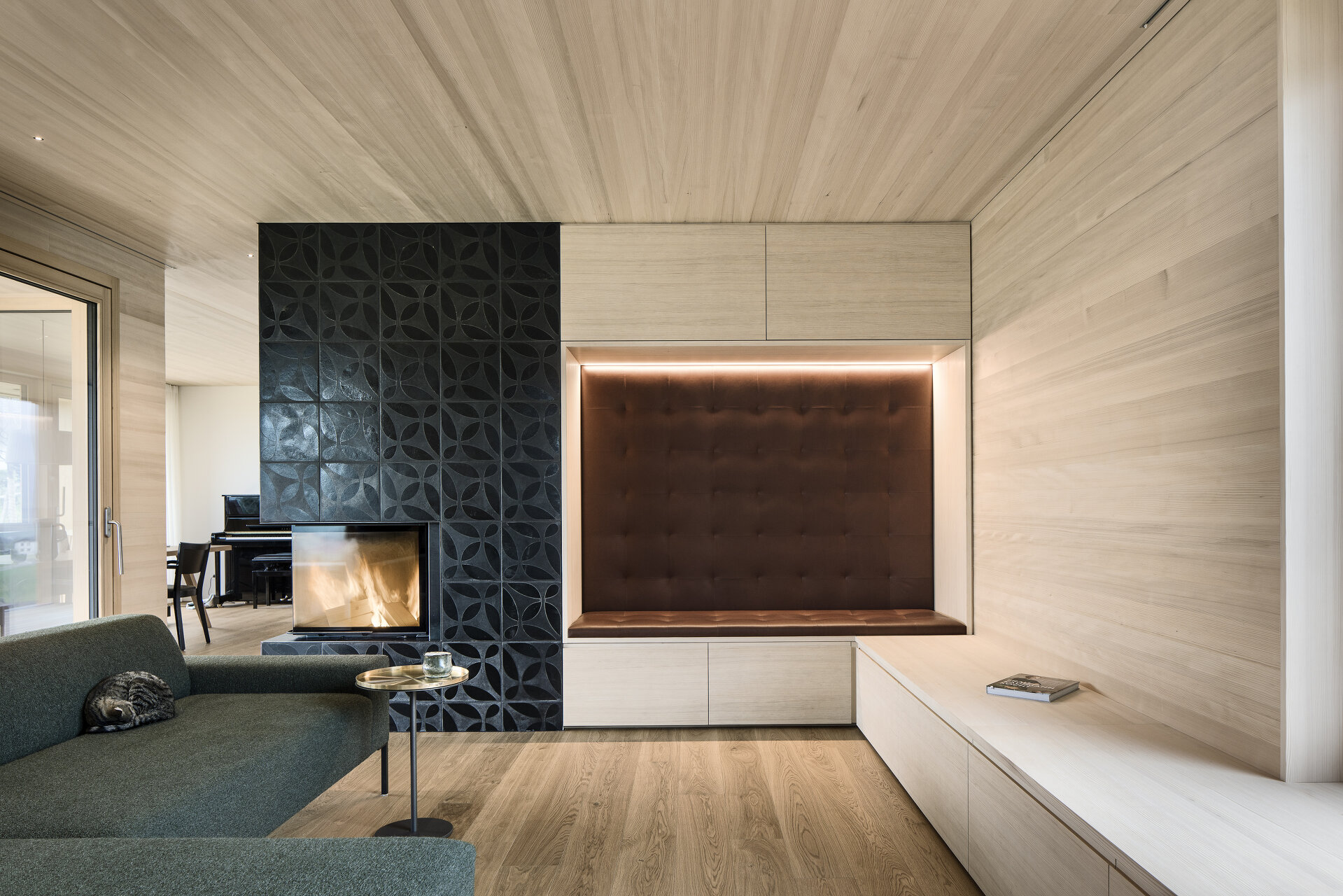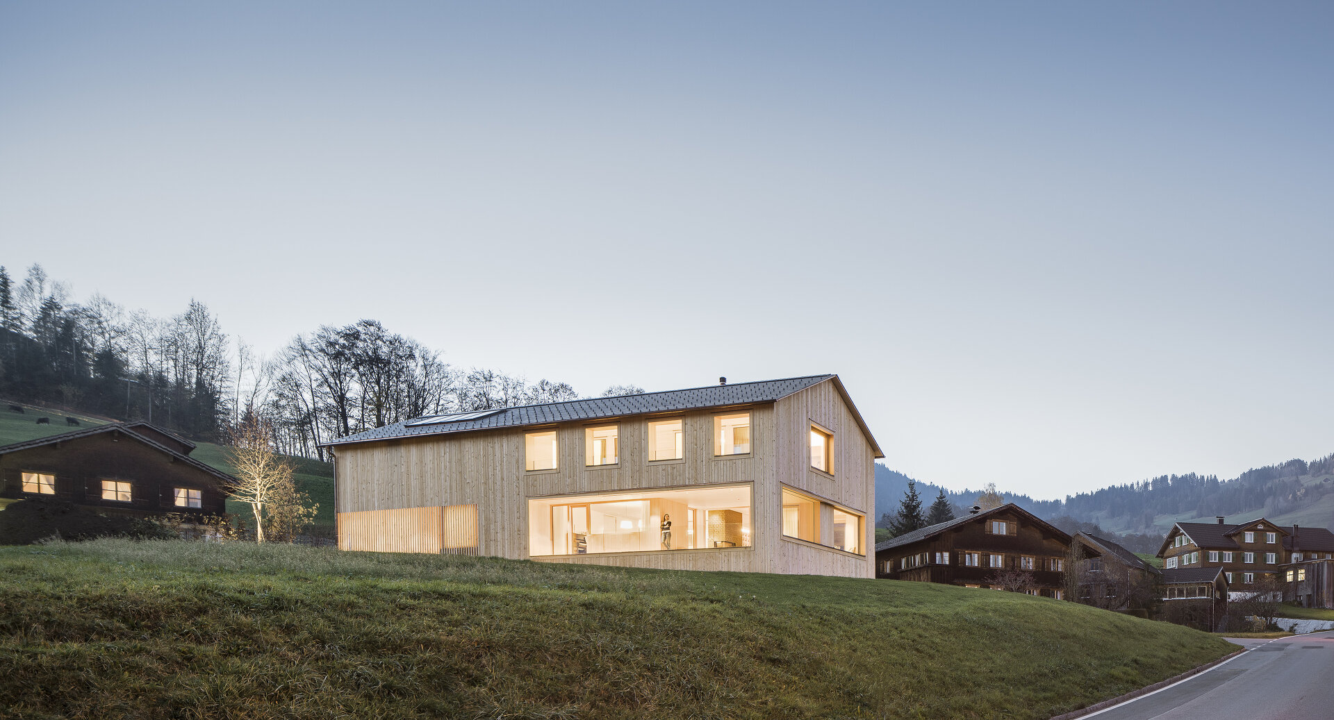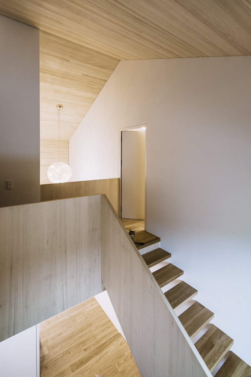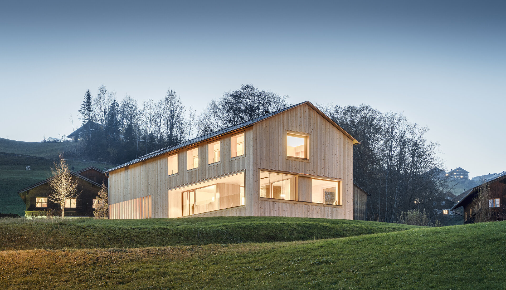 Präzis angeordnete Einschnitte und Fassadenöffnungen bieten differenzierte Bezüge zur umgebenden Landschaft und Nachbarschaft. Sämtliche Baumaterialien wurden unbehandelt eingebaut. Außen ist das Gebäude mit einer naturbelassenen Fichtenfassade aus Latten unterschiedlicher Breite verkleidet, innen kam schlichtes Weißtannentäfer zur Anwendung. (Text: Architekt, bearbeitet)