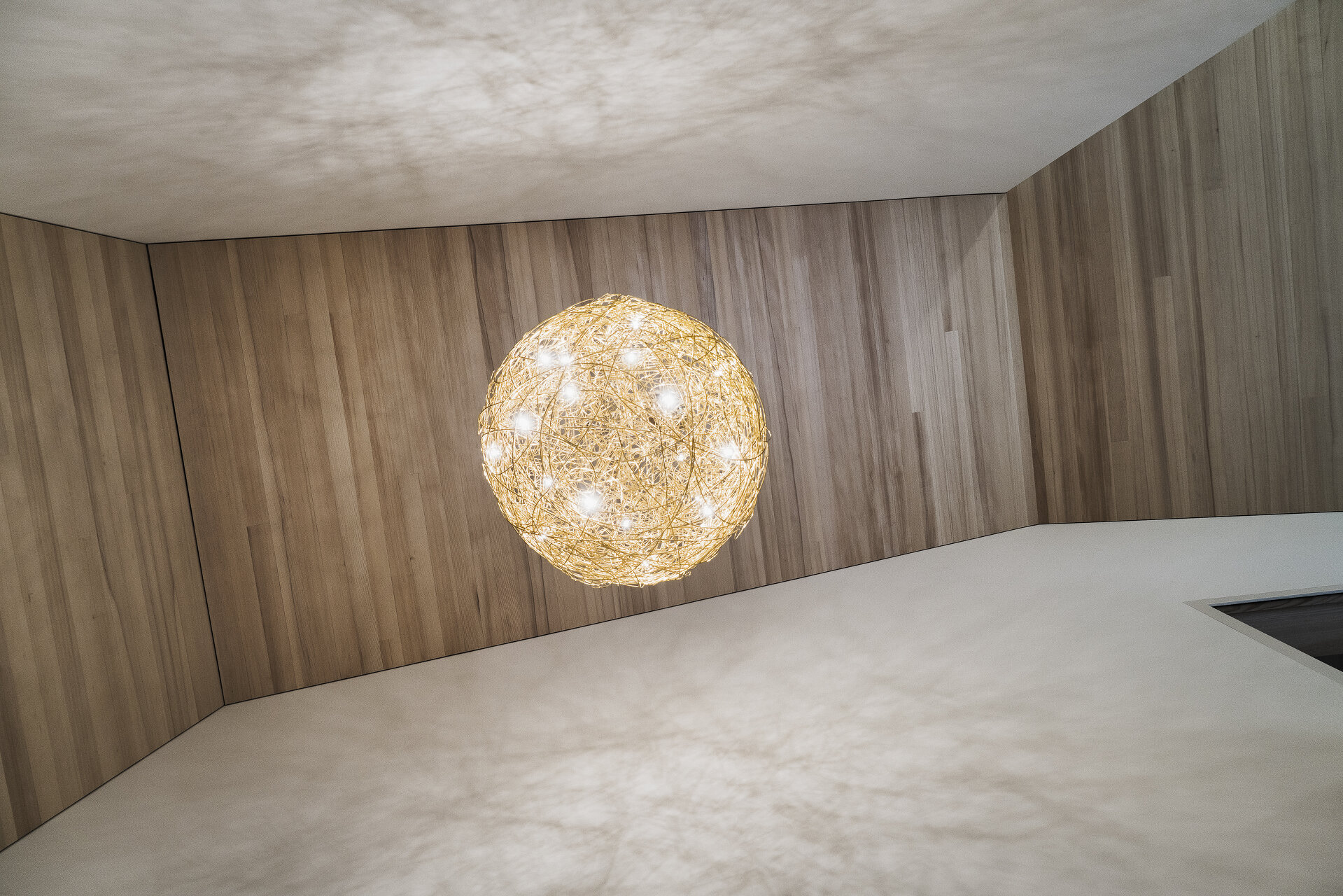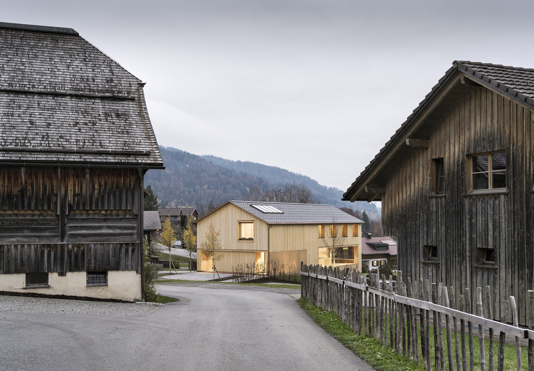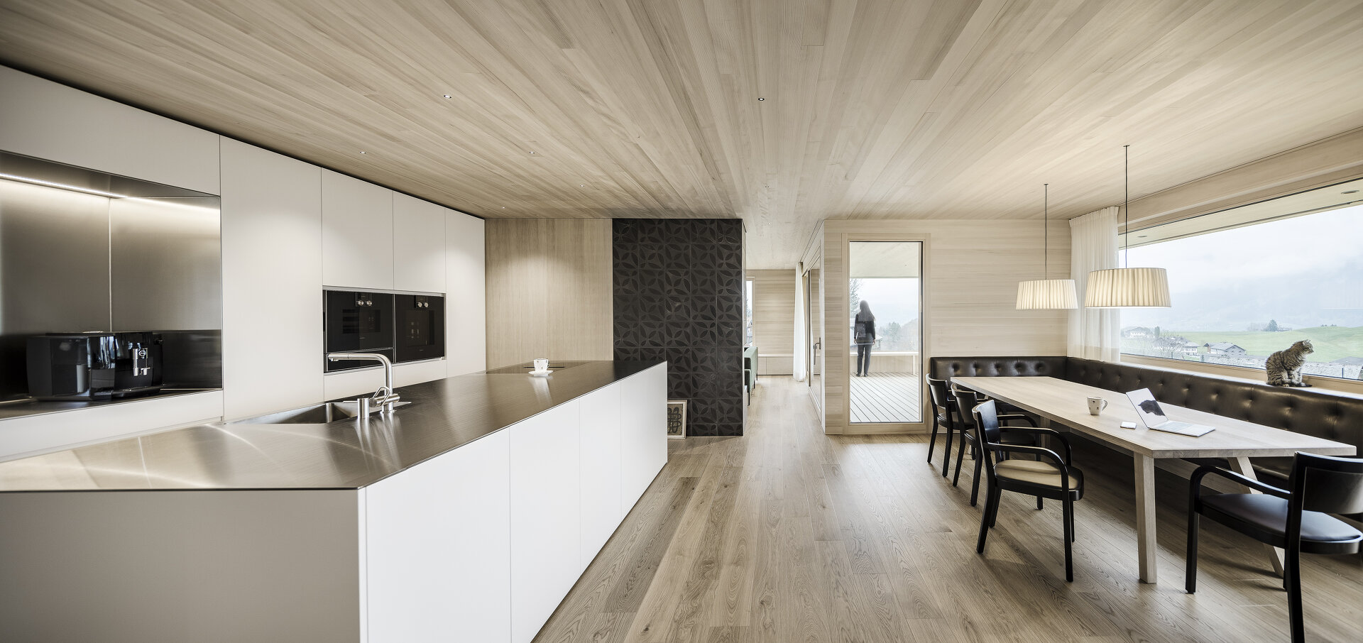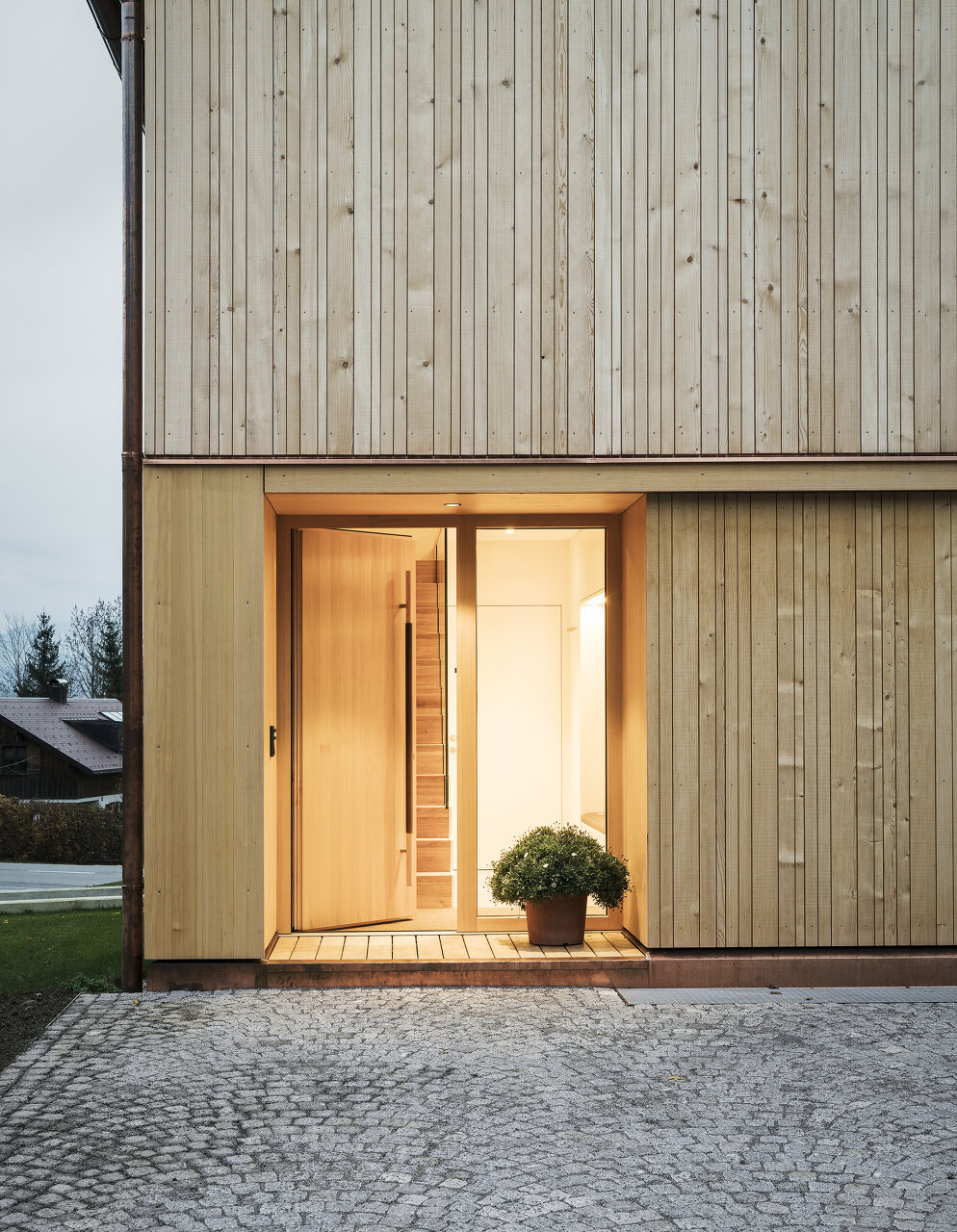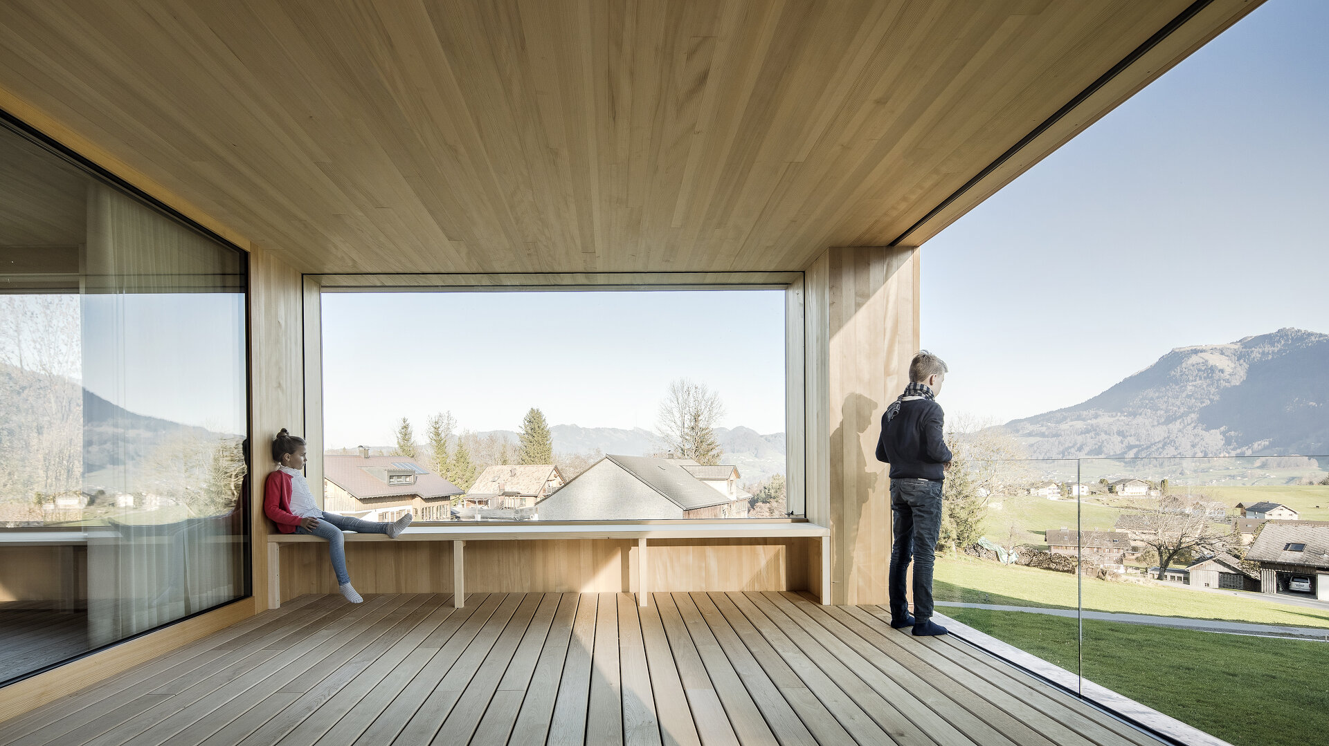 Präzis angeordnete Einschnitte und Fassadenöffnungen bieten differenzierte Bezüge zur umgebenden Landschaft und Nachbarschaft. Sämtliche Baumaterialien wurden unbehandelt eingebaut. Außen ist das Gebäude mit einer naturbelassenen Fichtenfassade aus Latten unterschiedlicher Breite verkleidet, innen kam schlichtes Weißtannentäfer zur Anwendung. (Text: Architekt, bearbeitet)