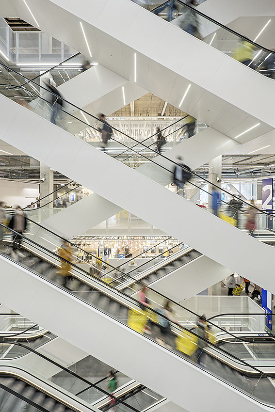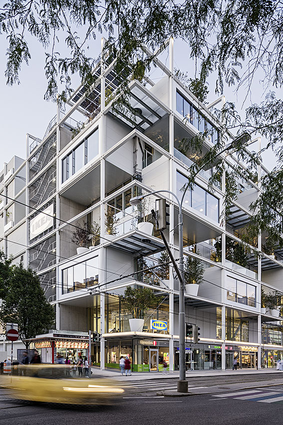 Innen vorgefertigte Stahlbetonstützen im Raster von etwa 10 x 10 m; der grundsätzlich offene Grundriss ermöglicht eine vielseitige Nutzung und Gestaltung der Räume. Entlang der Straßenfront liegen Ladeneinheiten für externe Pächter (Friseur, Apotheke, …), dahinter und auf vier Geschossen darüber breitet sich das IKEA-Angebot aus, in den oberen beiden Stockwerken ist ein Hostel mit 345 Betten untergebracht. Vom Nutzungsmix erhofft man sich die Belebung 24/7, von der Baustruktur einige Interaktion aller Nutzer untereinander und ohnehin die unaufwendige Adaptionsfähigkeit an sich verändernde Anforderungen.