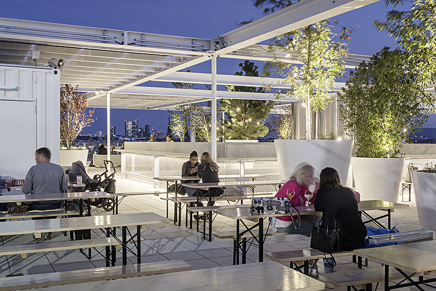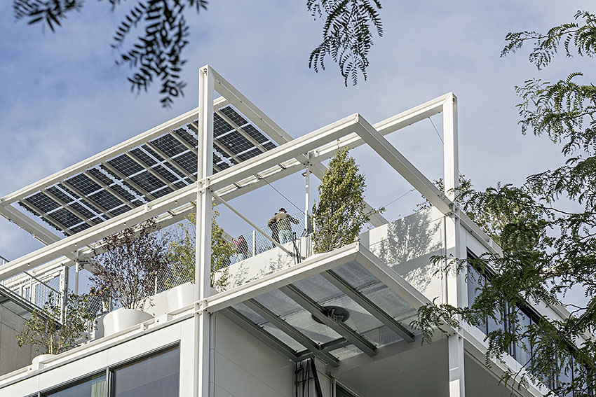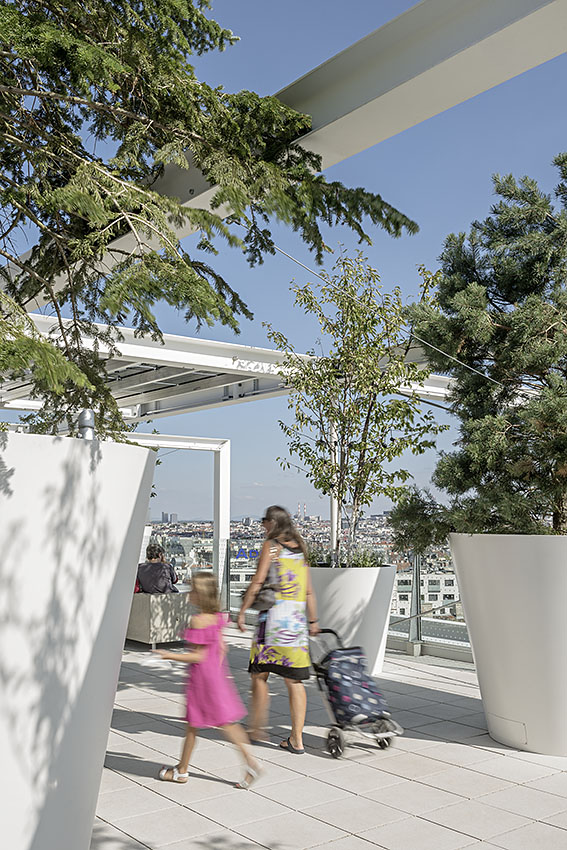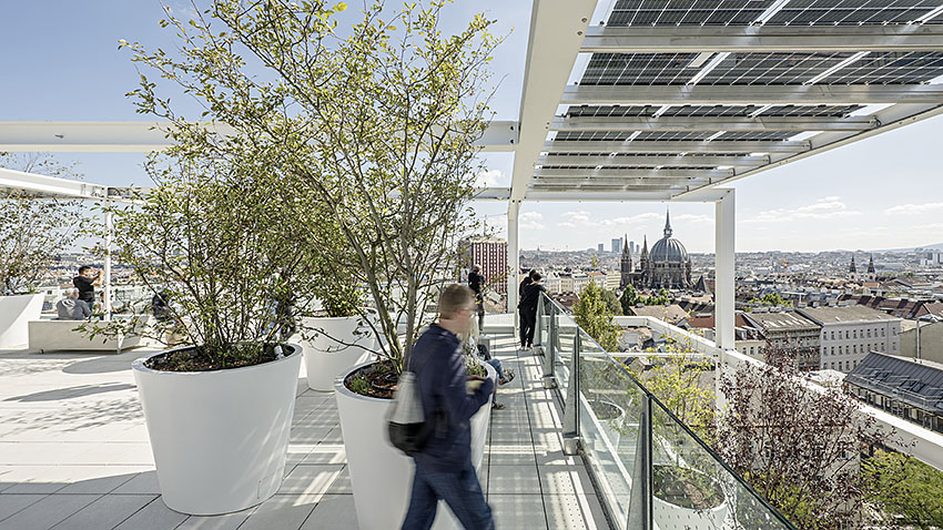 Einen wesentlichen Beitrag leisten auch die 160 Bäume in der Fassade und auf der Dachterrasse: Sie beeinflussen das Mikroklima spürbar, zumal durch die dreidimensionale Bepflanzung des Gebäudes mehr Biomasse zusammenkommt als auf der Grundfläche alleine unterzubringen wäre. Computersimulationen lassen für die Fußgängerebene eine relevante Temperaturabsenkung von 1,5 °C erwarten.