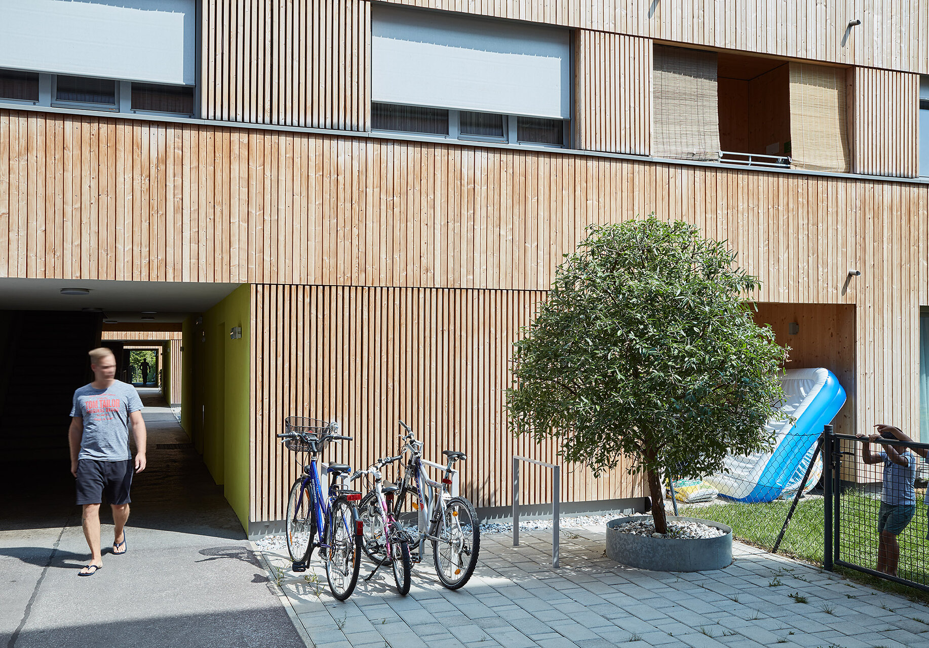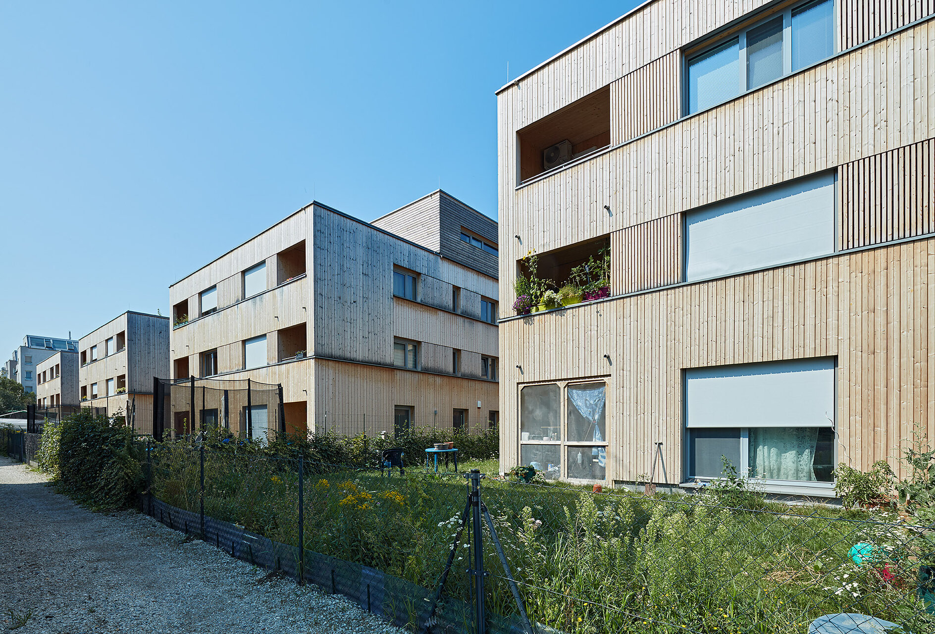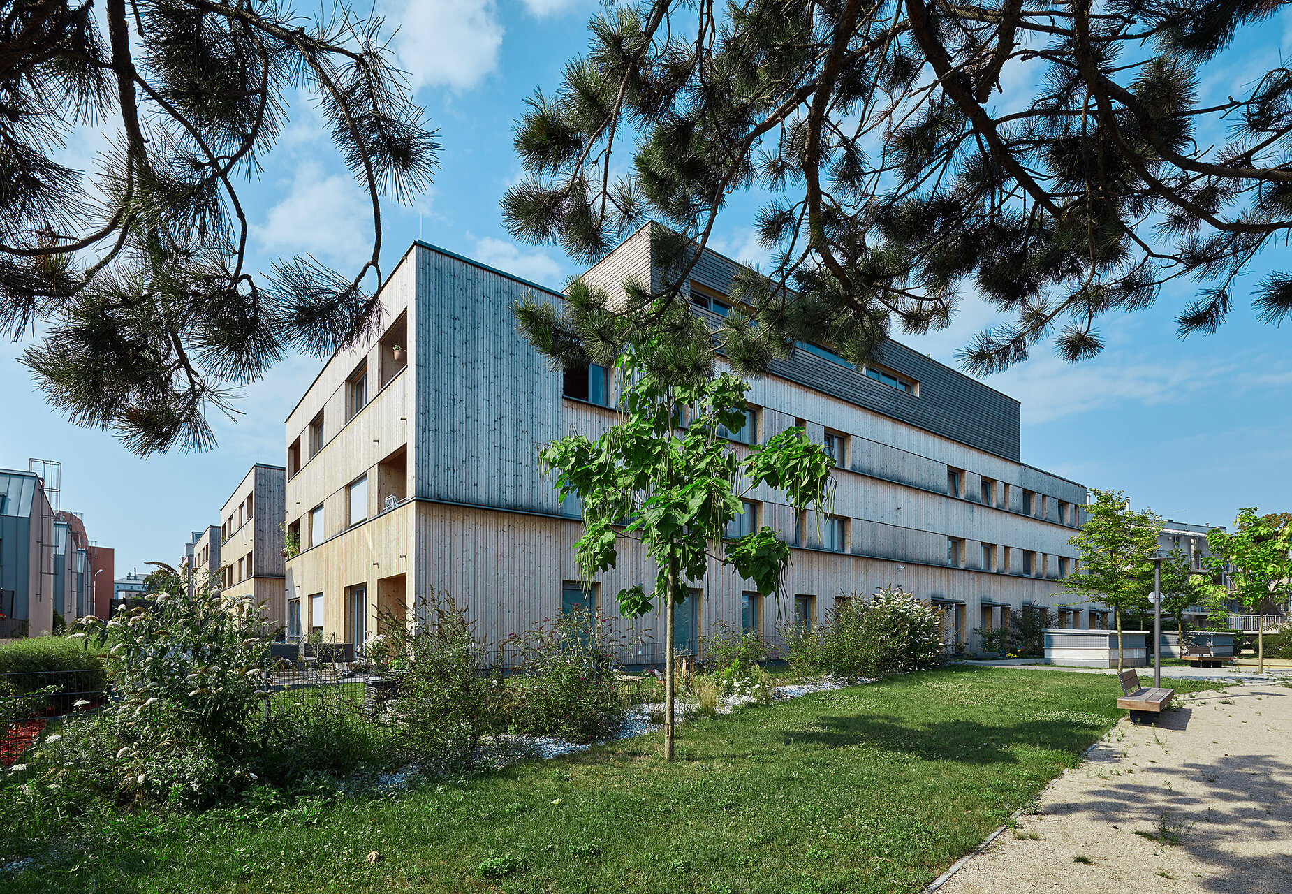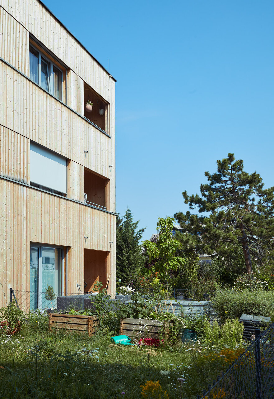 Diese Wohnanlage setzt ein wichtiges Signal: Nach längerer Pause hat eine gemeinnützige Wohnbaugenossenschaft in Wien erstmals wieder eine größere Wohnanlage in Holzbauweise errichtet, was im Rahmen des straffen Kostenrahmens eindrucksvoll gelang. Der dreigeschossige Wohnbau mit Staffelgeschoss überzeugt durch seine städtebauliche Integrität, sein differenziertes Freiraumangebot und seine holzbautechnische Umsetzung.Die vier Zeilen docken direkt an die Nachbarbebauung an und definieren ein durchlässiges Wohnquartier. Ein quer zu den Zeilen verlaufender offener Weg dient als Haupterschließung. Bis auf die betonierten Stiegenhäuser sind die Trakte reine Holzbauten aus vorgefertigten vollgedämmten Holzrahmenbauwänden und Brettsperrholzdecken. Im Inneren bleibt der Werkstoff teilweise an den Decken sichtbar, außen ist der Bau vollflächig mit unbehandeltem Lärchenholz verschalt. (Jurytext wienwood 21)